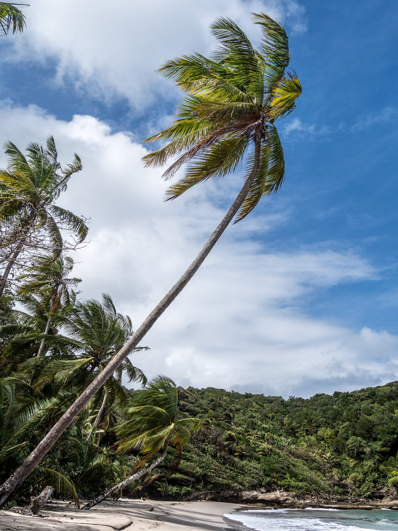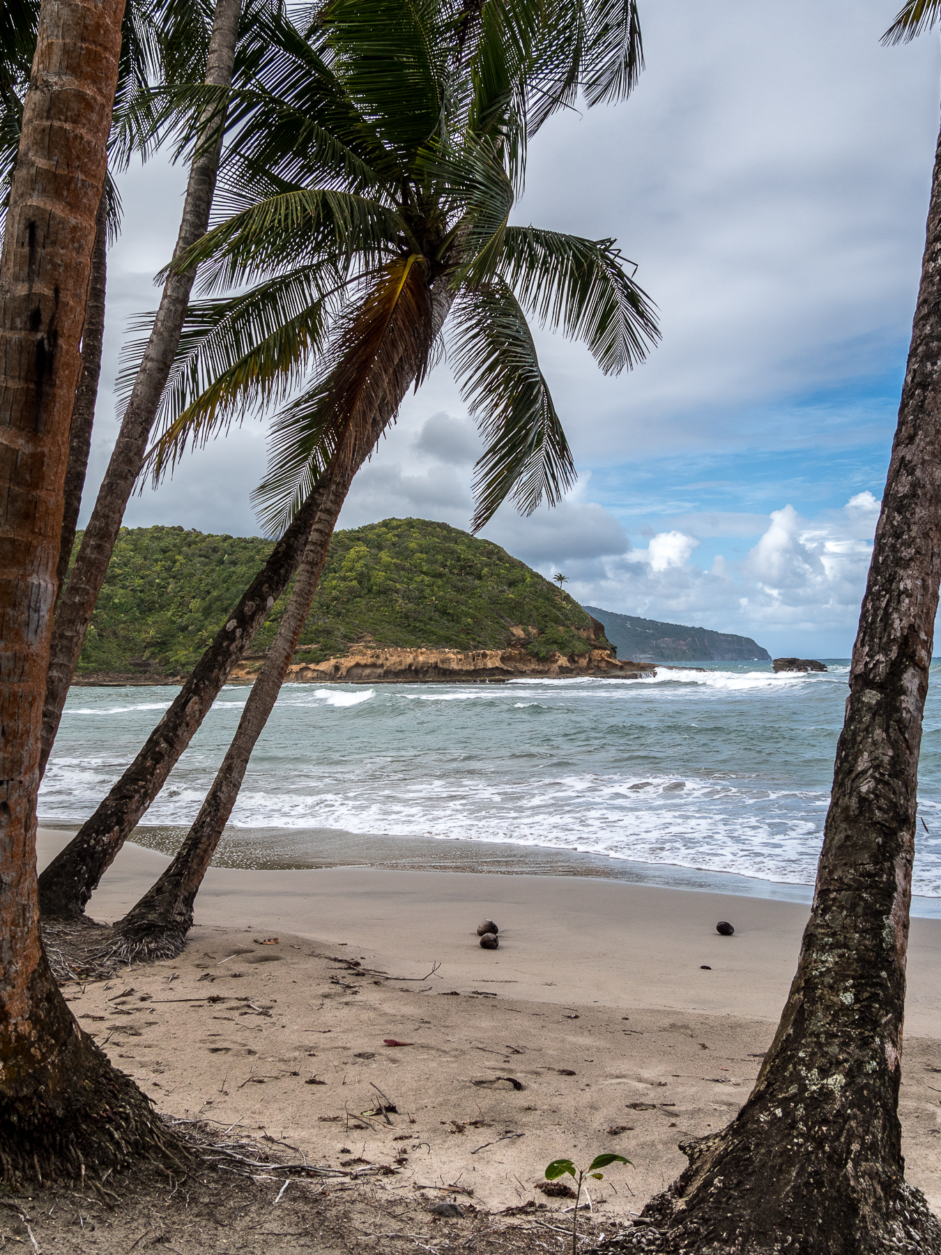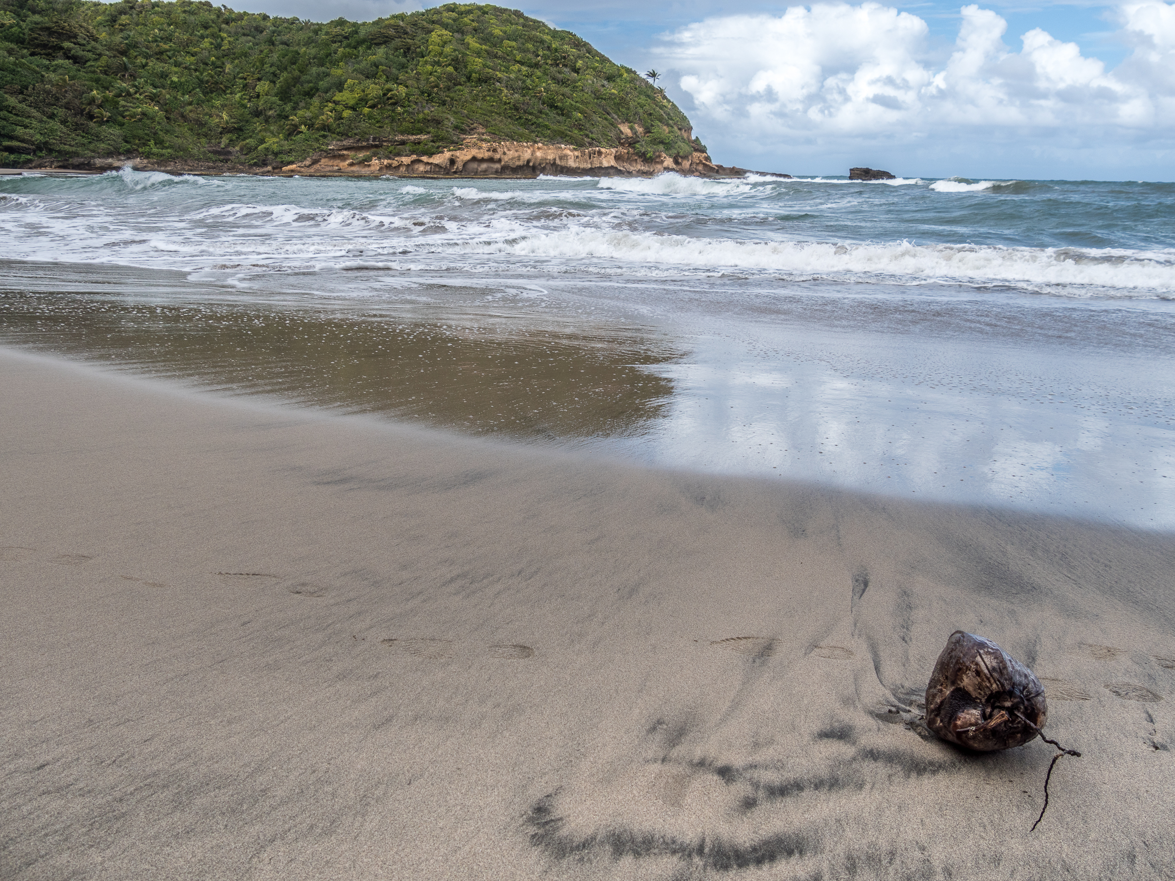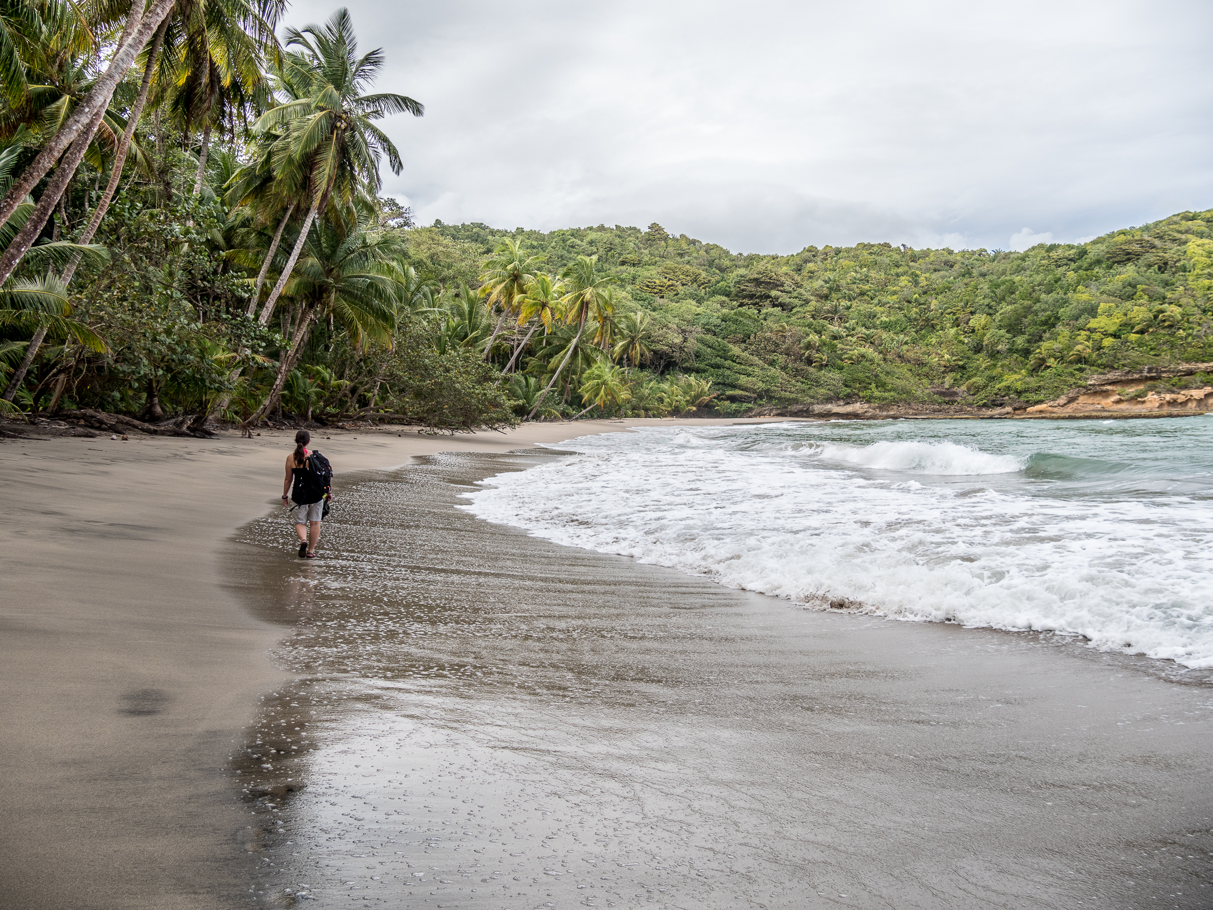 Enfin, la forêt s’ouvre pour laisser place à la mer et le sable dans toute sa splendeur. Batibou Beach, c’est encore plus beau que vu d’en haut ! Et on dit que la Dominique n’a pas de plage ? C’est une des plus jolies que j’aie vu dans les Caraïbes ! Et à part le gardien de la plage qui vient nous saluer (et prélever les 5 dollars de droit d’entrée), nous sommes seules ! Pendant un quart d’heure, nous aurons une grande plage qui incarne tous les fantasmes tropicaux rien que pour nous. Et franchement, le sable gris, c’est quand même plus original que le sable blanc. Il est fin, doux au pied, on essaie de se trouver un endroit tranquille, ma seule exigence est d’être à l’ombre d’un cocotier (j’aime vivre dangereusement). Nous nous installons et filons nous jeter à l’eau, enfin ! Là, j’ai atteint mon point de félicité.