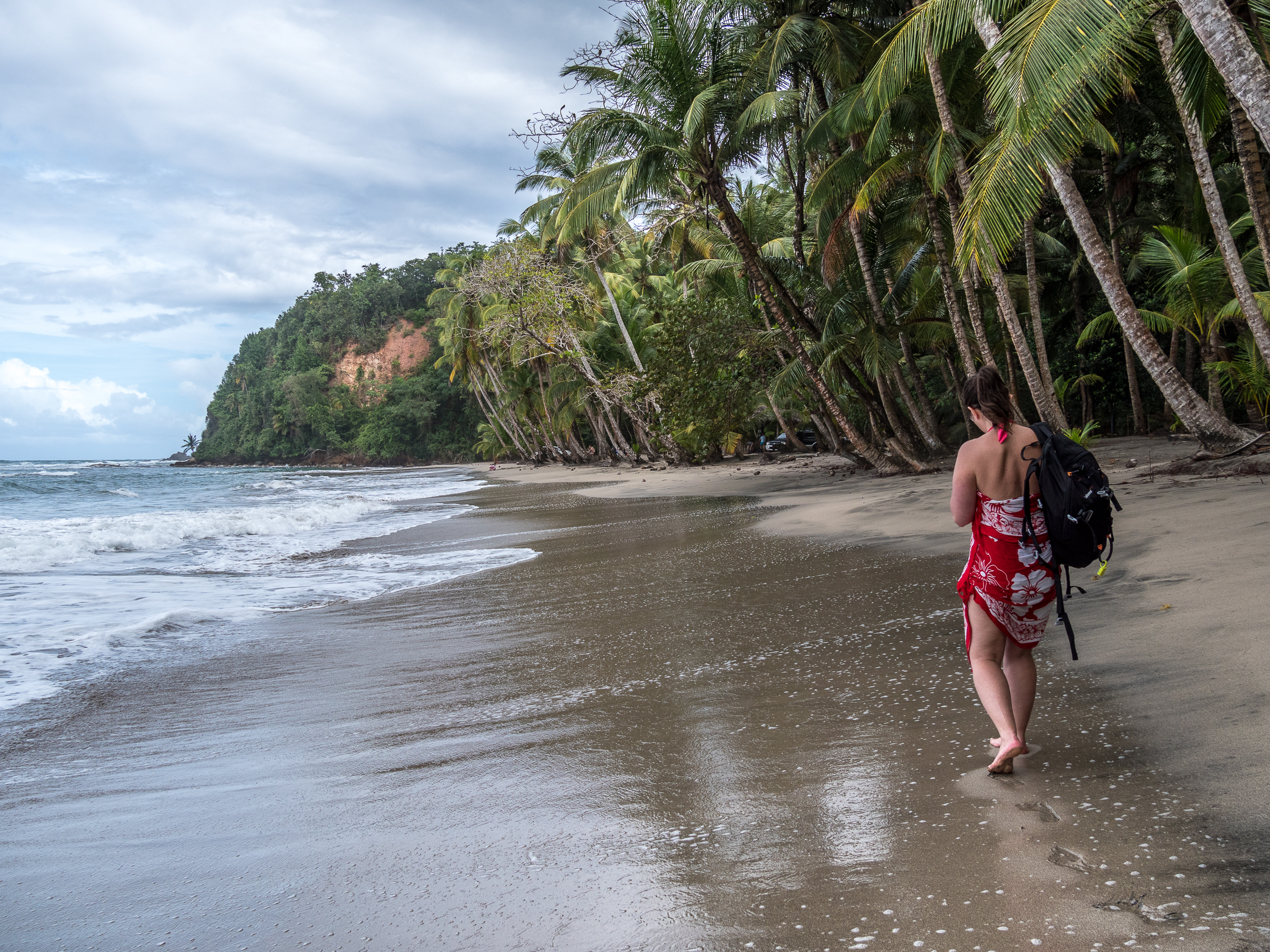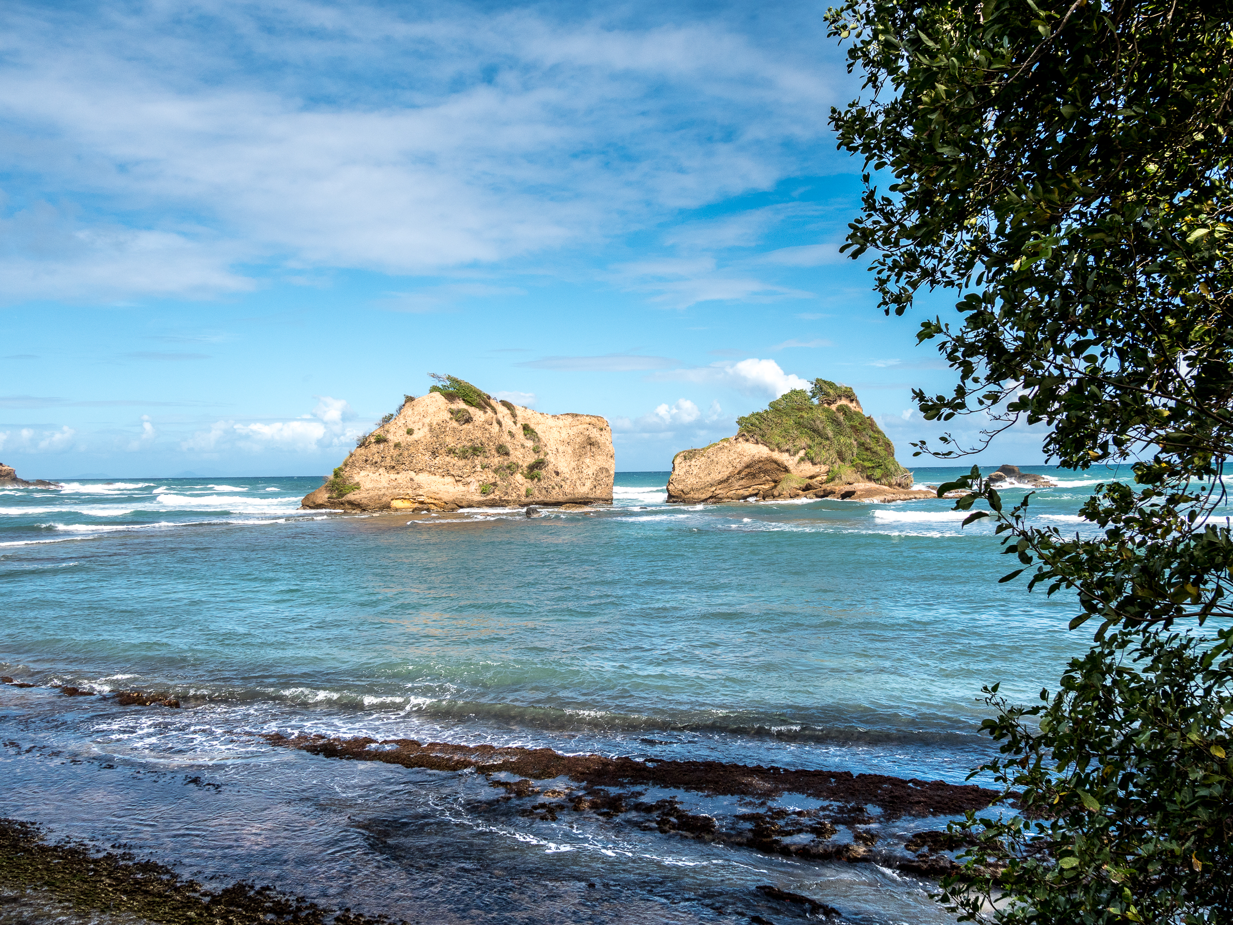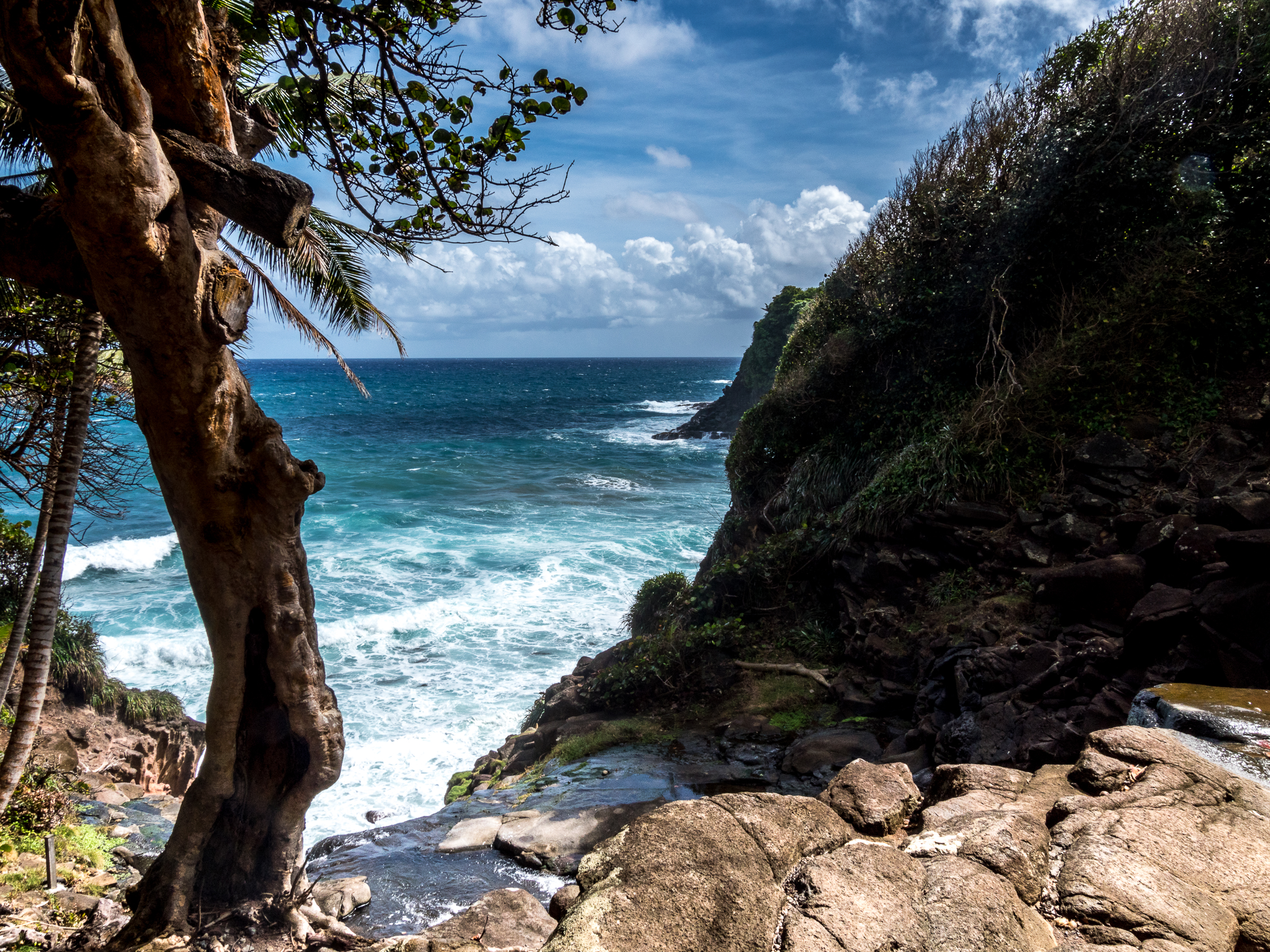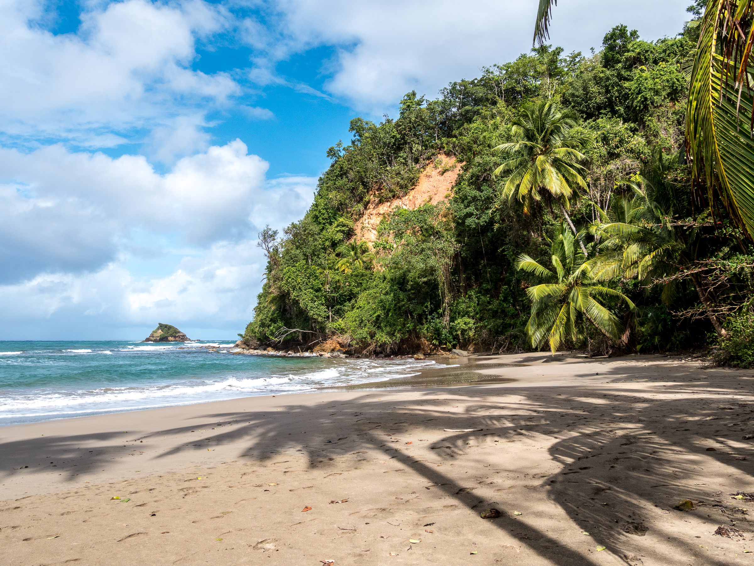 Enfin, la forêt s’ouvre pour laisser place à la mer et le sable dans toute sa splendeur. Batibou Beach, c’est encore plus beau que vu d’en haut ! Et on dit que la Dominique n’a pas de plage ? C’est une des plus jolies que j’aie vu dans les Caraïbes ! Et à part le gardien de la plage qui vient nous saluer (et prélever les 5 dollars de droit d’entrée), nous sommes seules ! Pendant un quart d’heure, nous aurons une grande plage qui incarne tous les fantasmes tropicaux rien que pour nous. Et franchement, le sable gris, c’est quand même plus original que le sable blanc. Il est fin, doux au pied, on essaie de se trouver un endroit tranquille, ma seule exigence est d’être à l’ombre d’un cocotier (j’aime vivre dangereusement). Nous nous installons et filons nous jeter à l’eau, enfin ! Là, j’ai atteint mon point de félicité.
