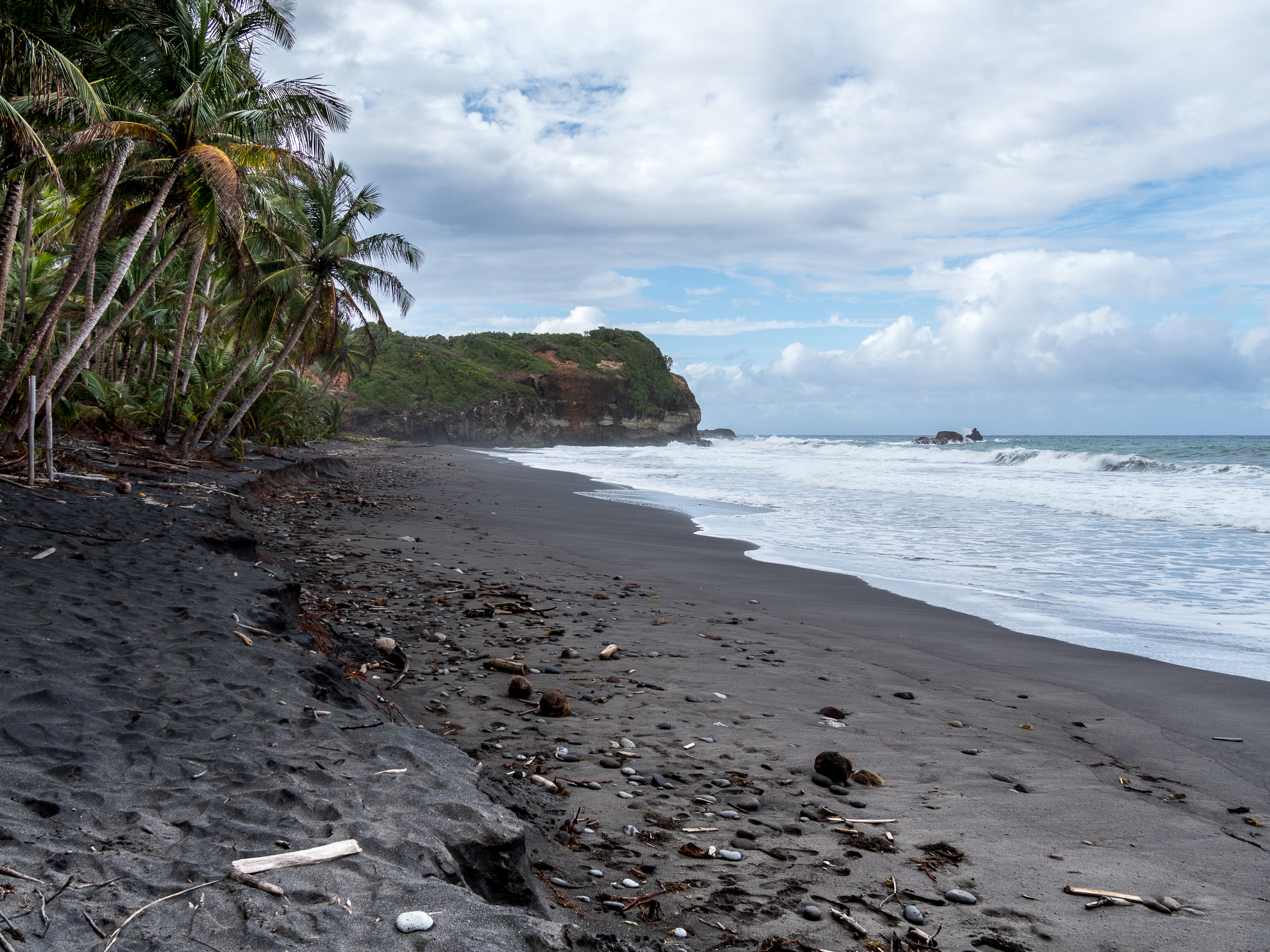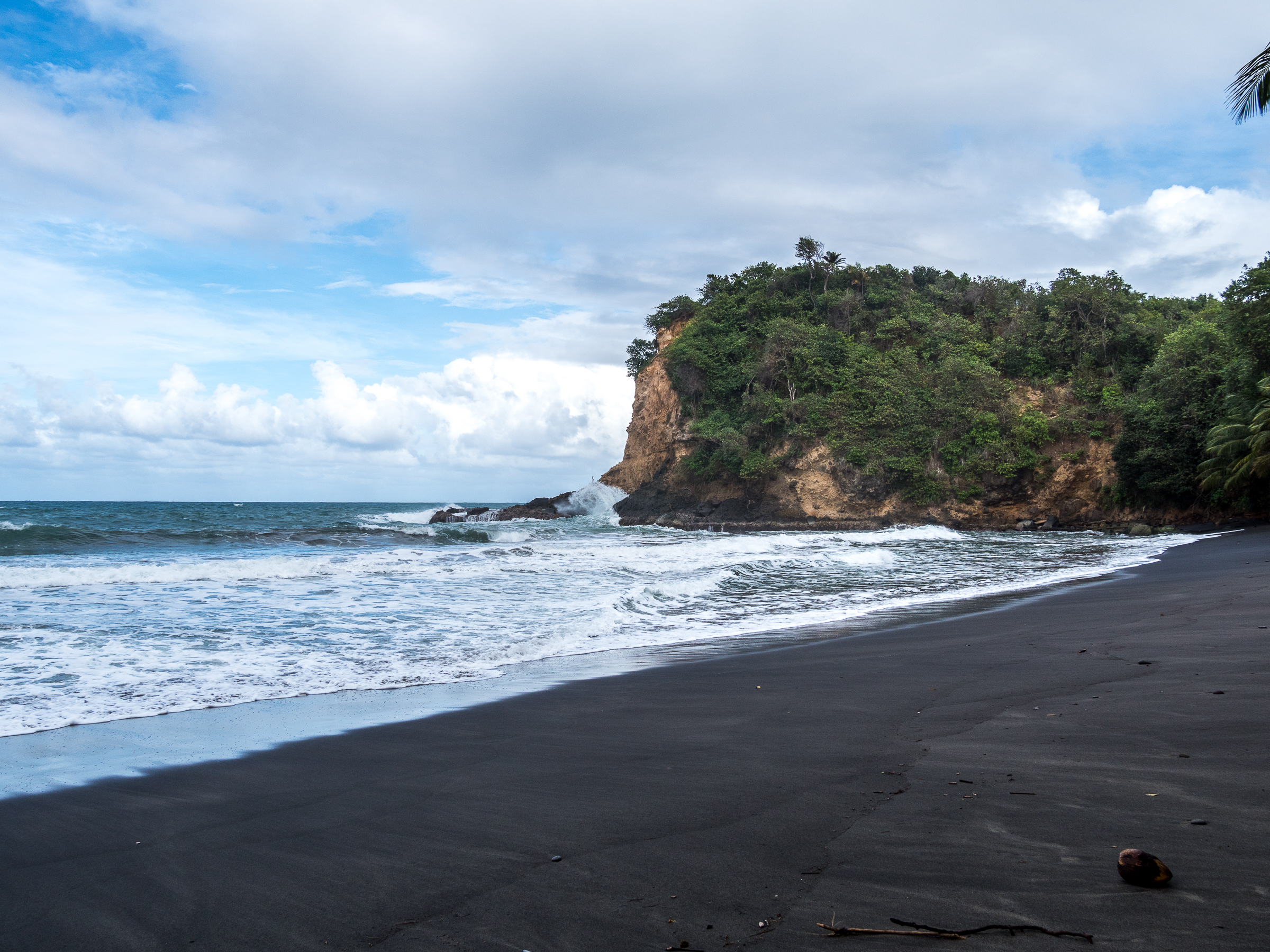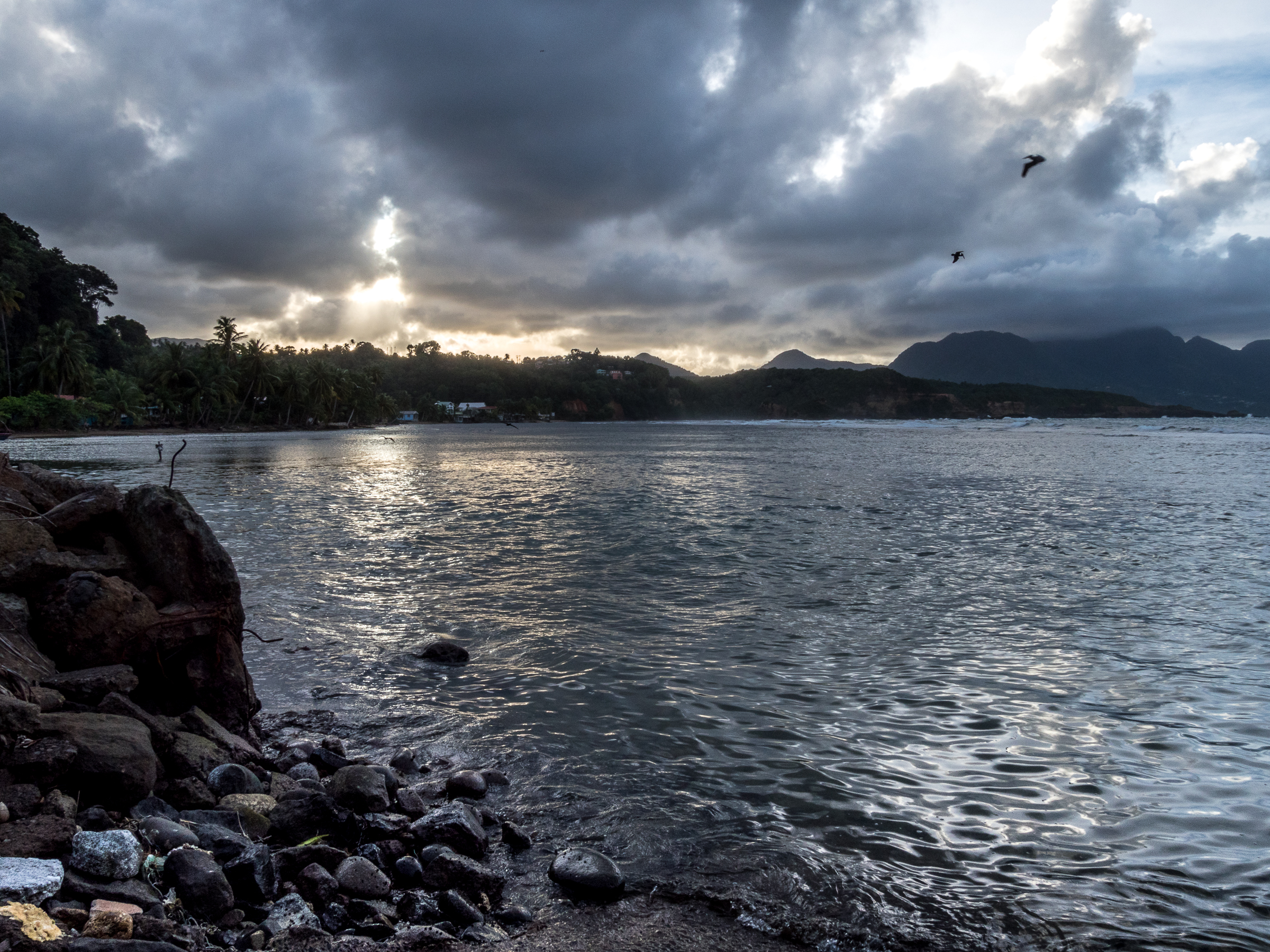 C’est sous un ciel déjà bien tourmenté que nous arrivons à Number One Beach. Elle fut la star d’une des grandes scènes du deuxième opus de « Pirates des Caraïbes », celle où le Capitaine Jack Sparrow se fait pourchasser sur une plage de sable noir par une ordre de cannibales. Ce n’est d’ailleurs pas le seul endroit de la Dominique où vivent encore les souvenirs du film… entre autres, il y a aussi l’Indian River que nous avons malheureusement manqué mais il semble que le souvenir de Johnny Depp et du tournage fasse maintenant partie de la légende chez les Dominiquais ! Pensez-donc… voire débarquer l’équipe d’un blockbuster dans une île si peu connue qu’on n’arrête pas de la confondre avec la République dominicaine !