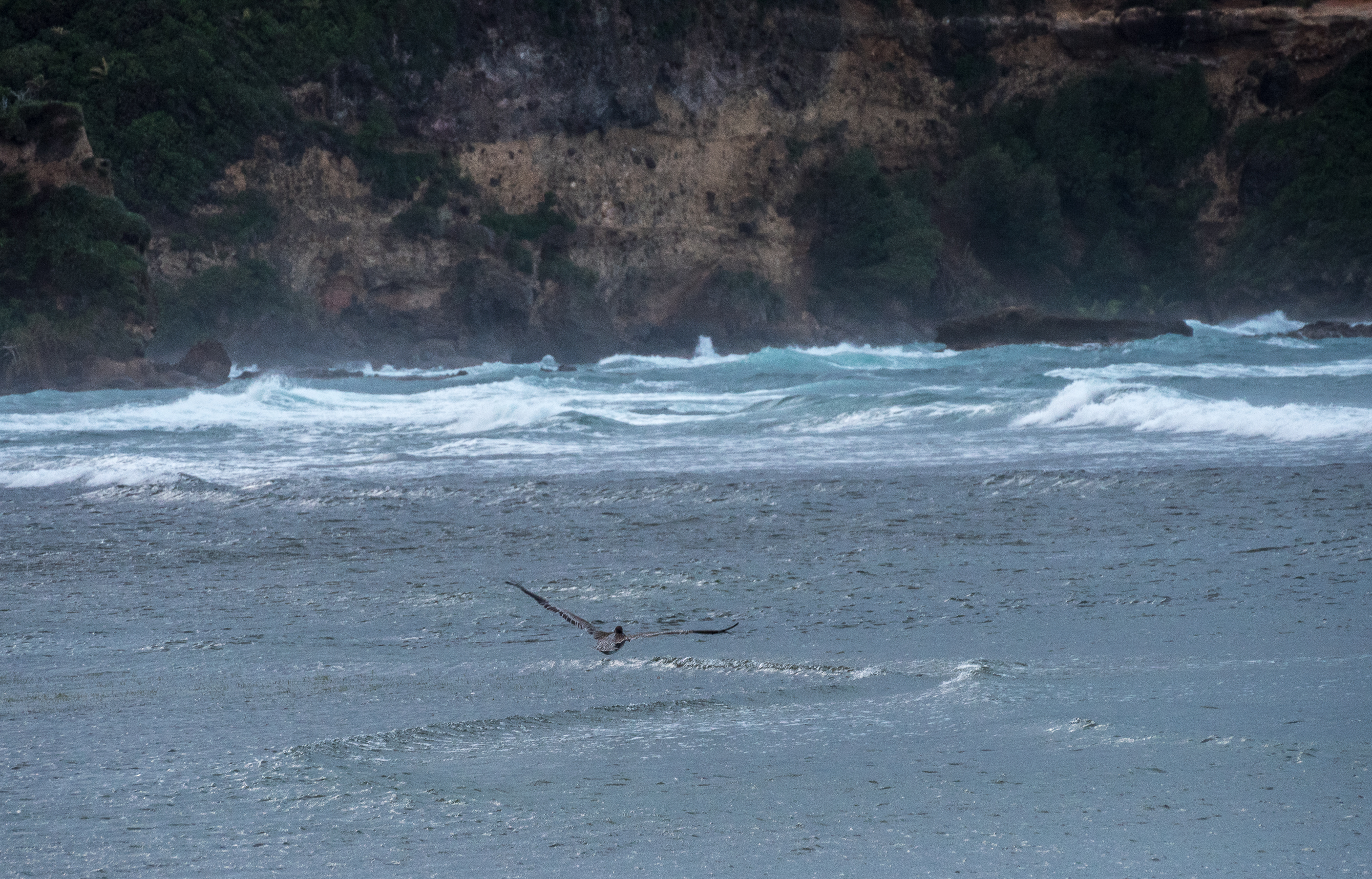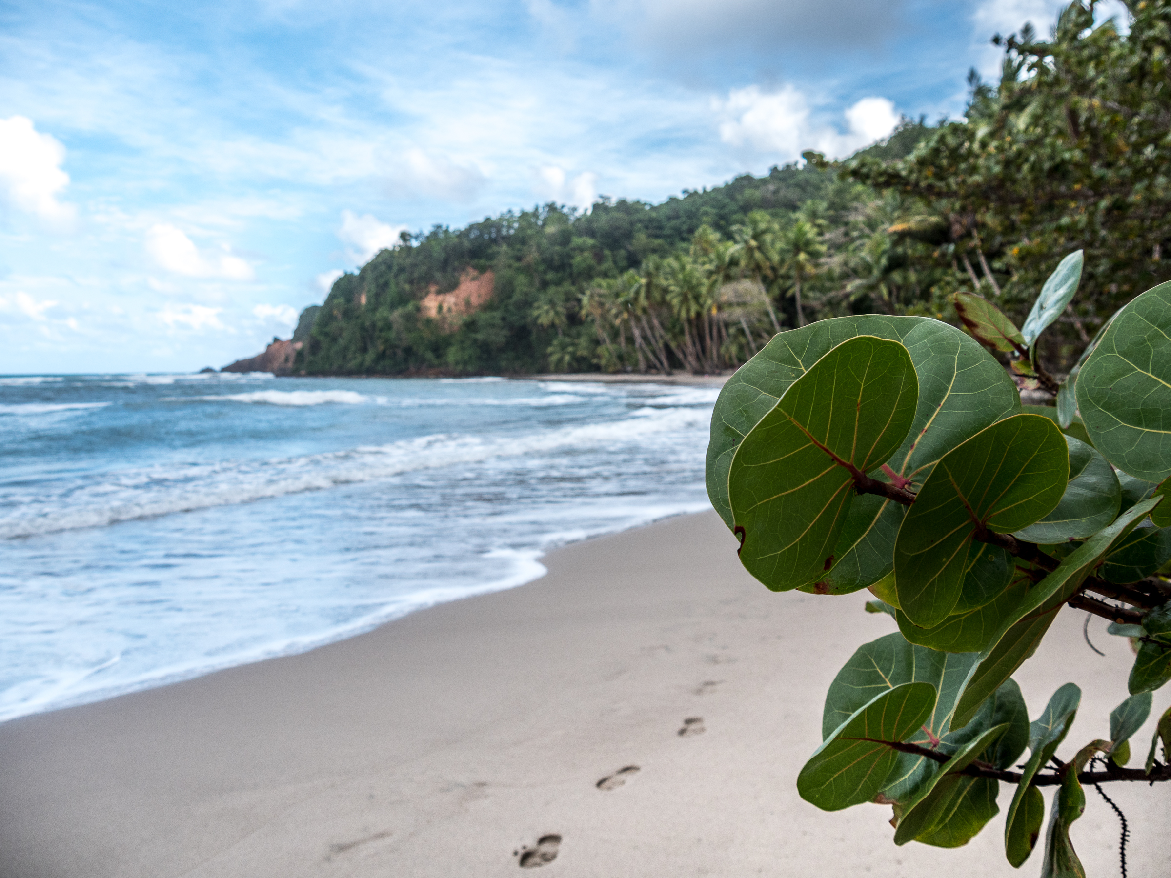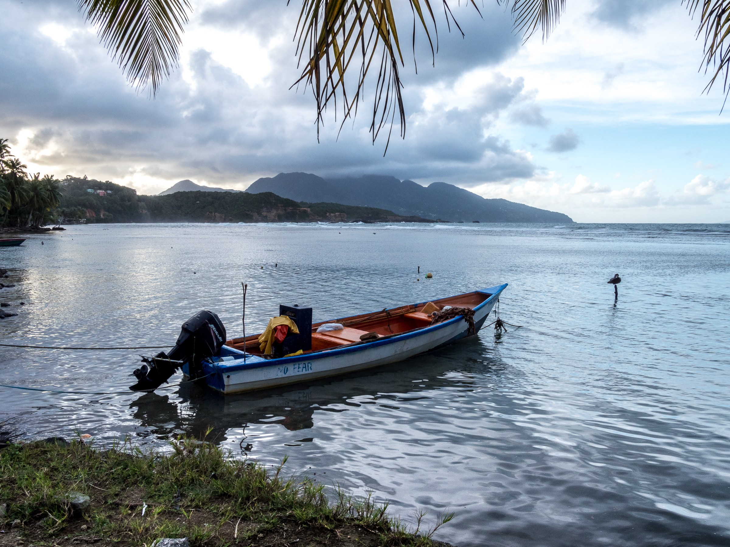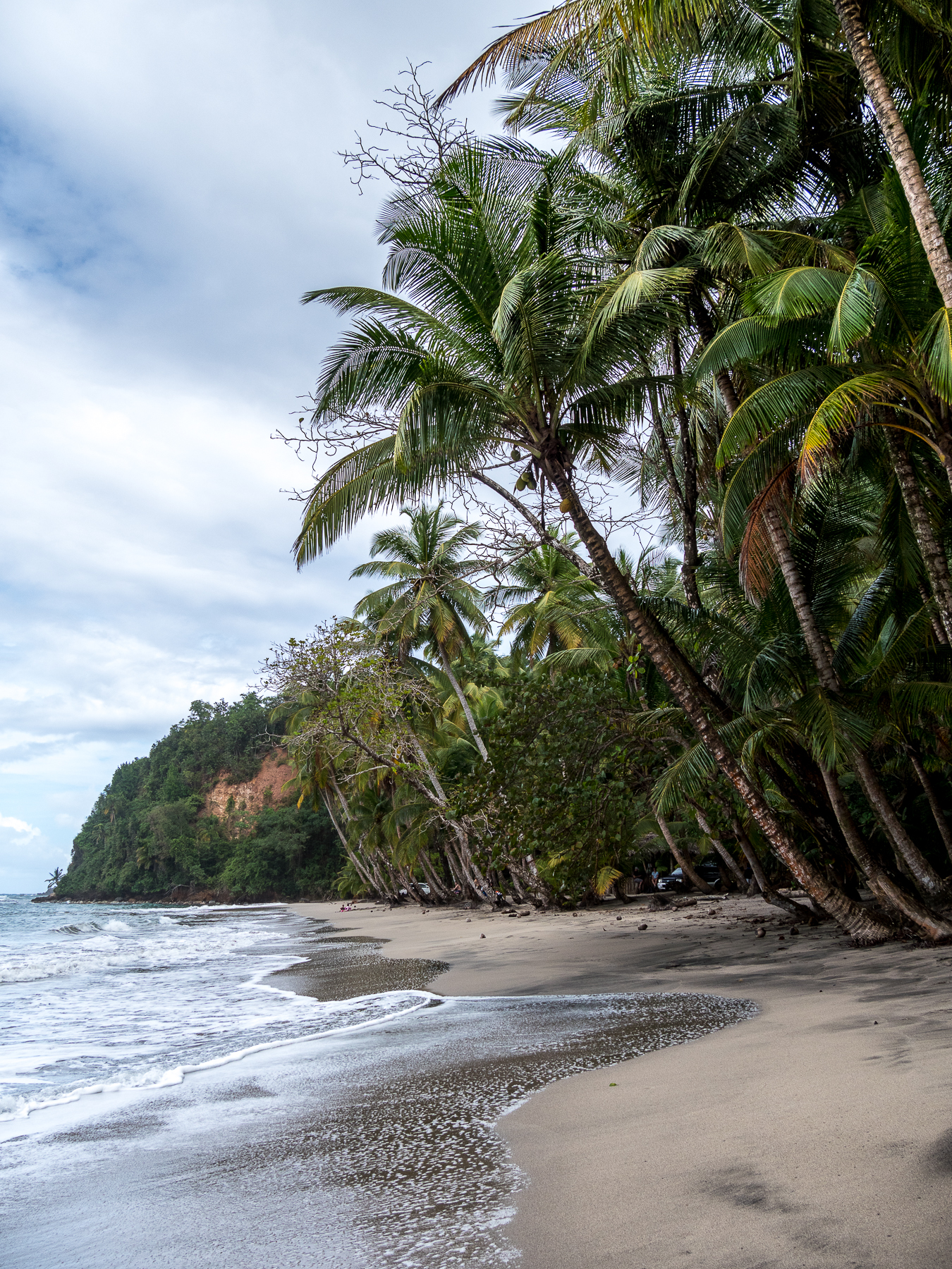 C’est sous un ciel déjà bien tourmenté que nous arrivons à Number One Beach. Elle fut la star d’une des grandes scènes du deuxième opus de « Pirates des Caraïbes », celle où le Capitaine Jack Sparrow se fait pourchasser sur une plage de sable noir par une ordre de cannibales. Ce n’est d’ailleurs pas le seul endroit de la Dominique où vivent encore les souvenirs du film… entre autres, il y a aussi l’Indian River que nous avons malheureusement manqué mais il semble que le souvenir de Johnny Depp et du tournage fasse maintenant partie de la légende chez les Dominiquais ! Pensez-donc… voire débarquer l’équipe d’un blockbuster dans une île si peu connue qu’on n’arrête pas de la confondre avec la République dominicaine !