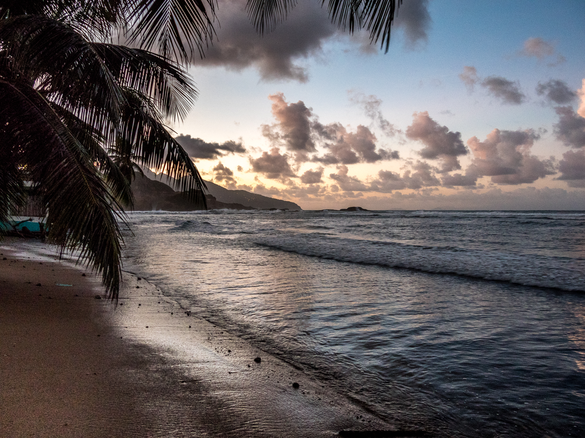 Il semble bien que « les gens du nord » soient un peu différents des autres. A la fois encore plus relax que les autres Dominiquais, mais en même temps tout feu, tout flamme quand on met le moteur en route. Sandra nous expliquera tout çà pendant que la voiture trace sur les routes à travers une immensité verte qui ne semble plus finir… jusqu’à ce qu’on arrive vers la côte. Là, le parcours devient encore plus joyeux, avec des brides de mer bleu foncé entre les arbres. Les villages se font plus nombreux, plus mignons aussi. L’ambiance y est… différente du reste de la Dominique. Plus caribéenne. C’est pourtant toujours l’Atlantique qui fait face à cette côte, avec ses eaux plus violentes et tourmentées. Et finalement, nous y voilà : Calibishie, la principale « ville » de la côte nord. En fait de ville, c’est plutôt une espèce d’agglomération de maison disposées le long de la plage et de la route de la côte. Dès que nous sommes arrivées, je m’y suis sentie à mon aise. En terrain étrangement familier. C’est au Sandbar, une guesthouse de juste 4 chambres que nous avons choisi de loger Sad et moi. Un peu beaucoup parce qu’en bas, il y a un bar dont les photos nous promettaient de belles soirées. Nous ne serons pas déçues ! Après avoir été accueillies chaleureusement par Christine et Garnet, on descend directement pour admirer le coucher du soleil… ça sent déjà un peu la fin des vacances. Le moment où le voyageur est fatigué et a envie de se laisser aller. Et sur la côte nord, c’est le cas ! Pas de grand randonnée (à part la fin du Waitikubuku National Trail, le sentier de randonnée qui traverse l’île du nord au sud) mais des plages, parmi les plus belles de la Dominique, que nous allons explorer le lendemain.