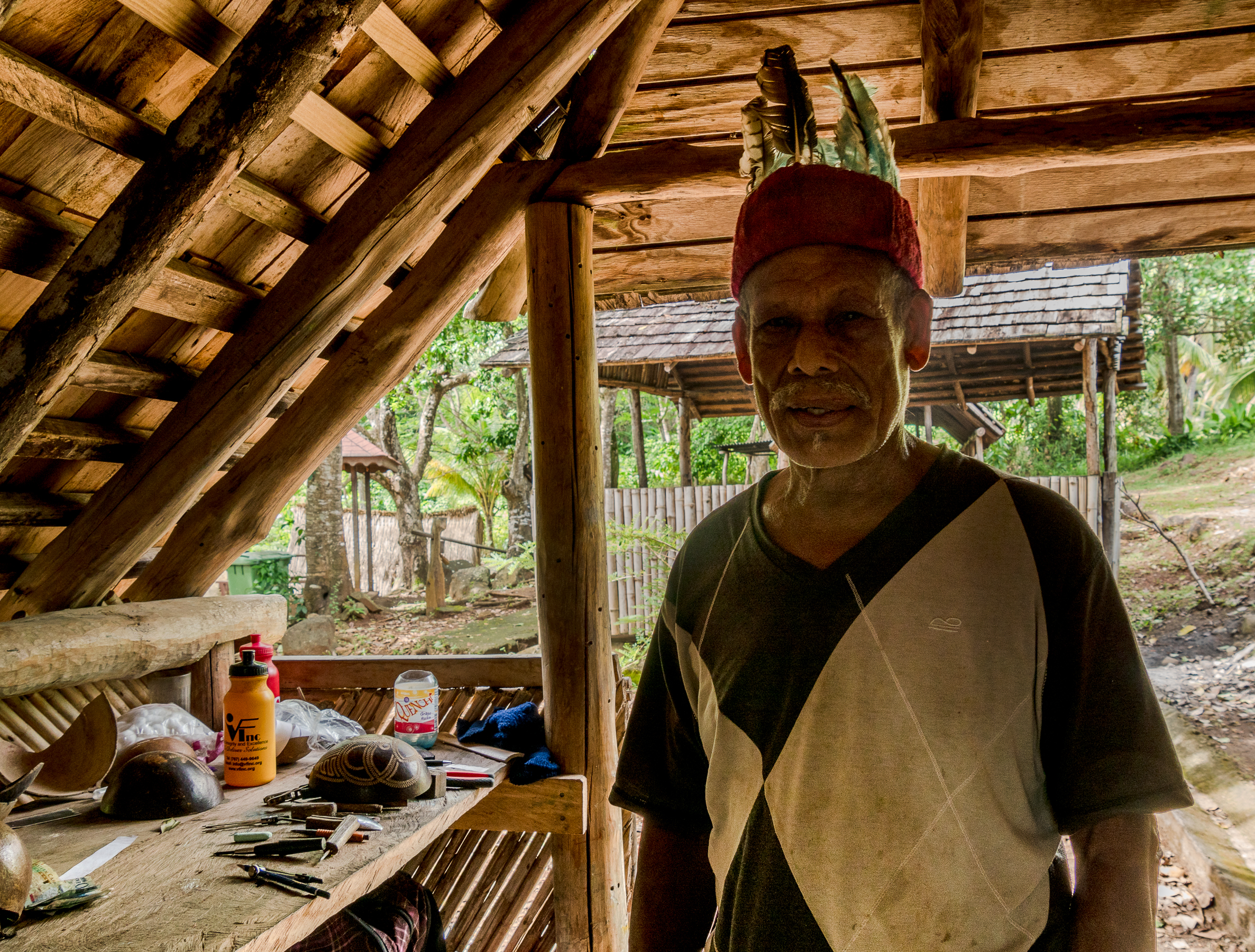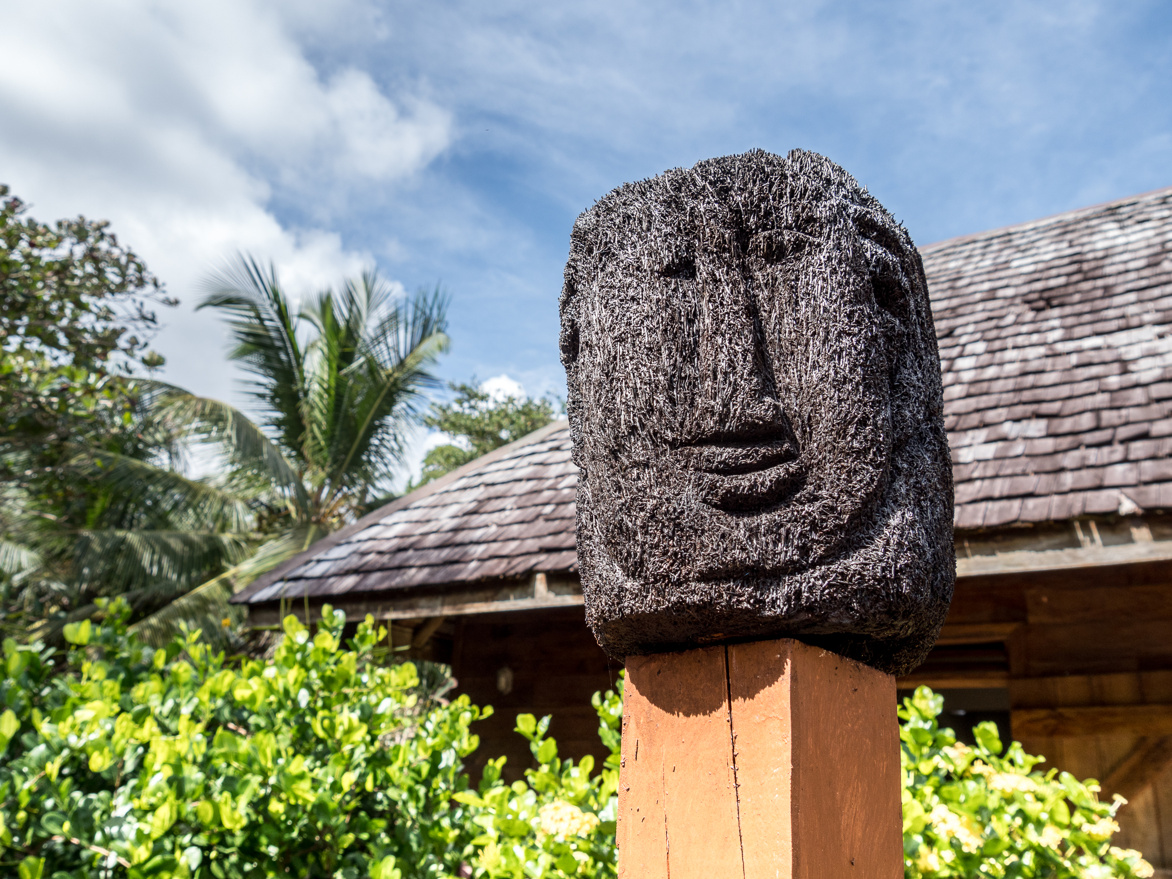 Ce qui frappe d’emblée lors de note balade avec le guide, c’est la grande proximité avec la nature. A quasi chaque plante que rencontrerons, notre guide nous expliquera son nom et ses vertus, c’est assez impressionnant ! Pendant le parcours, nous rencontrerons des artisans (comme un ancien chef qui sculpte maintenant des écorces de calebasses, où des artisans en vannerie, probablement le souvenir que tu dois ramener de là, Lectrice, Lecteur), mais aussi des constructions communautaires comme le carbet, un bâtiment au toit haut et destiné à l’usage de tous. La sculpture est également très importante pour les Kalinagos. On trouvera souvent des visages sculptés sur de longs piquets de bois.
