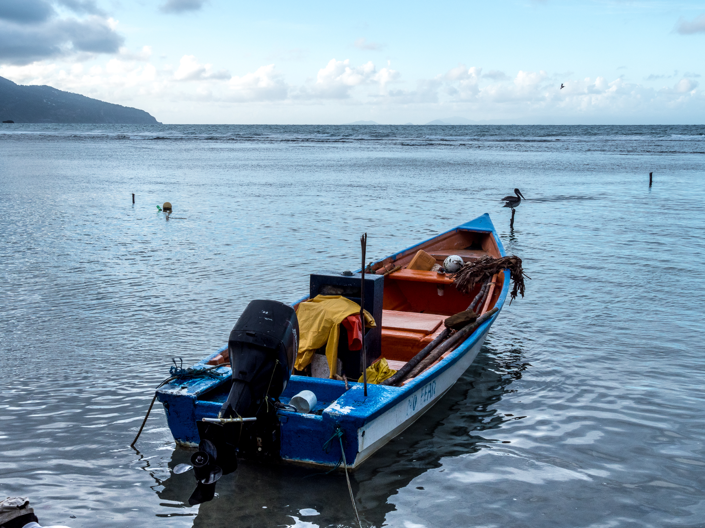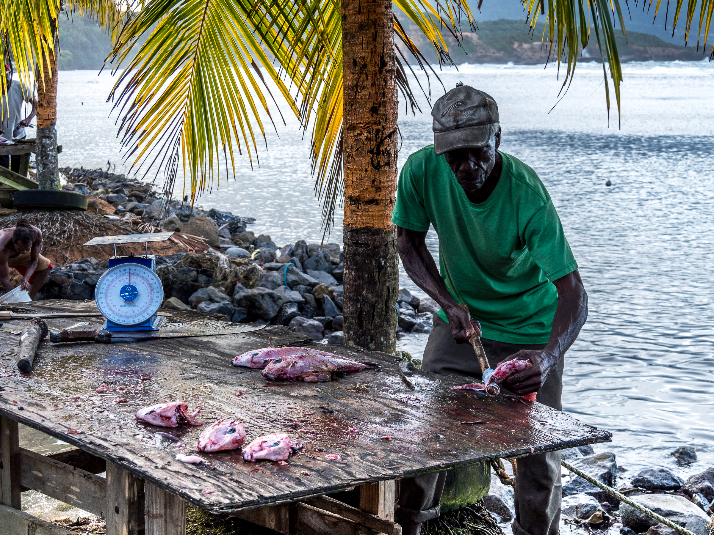 Au crépuscule, nous allons nous promener et découvrir un peu notre nouveau chez nous. Calibishie a tout ce qu’il faut : quelques boutiques, un distributeur de billets, des restaurants et quelques bars, une pharmacie, des supérettes… Le temps semble s’y couler plus que paisiblement, les habitants montant et descendant la rue d’un sens à l’autre, pour se promener ou papoter. La seule agitation semble se trouver dans le coin des pêcheurs (on ne peut pas dire « port », il s’agit de quelques bateaux amarrés sur la plage où quelques pêcheurs débitent leur prise du jour (ce jour-là, la plus belle pièce était un « petit » requin). On négocie, on se crie dessus aussi parfois tandis que le préposé à la découpe des poissons continue imperturbablement son job.