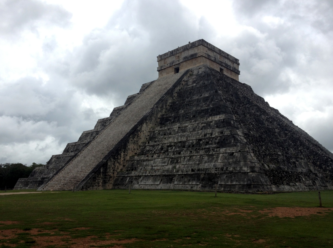 Les Mayas n’avaient fait que calculer la fin d’un cycle sans le temps d’en faire davantage. Malheureusement pour eux, les Mayas, eux, ont vu leur fin. Leur civilisation s’est brusquement effondrée: Sécheresse? Famine? Épidémie? Hystérie religieuse? Guerres? Un mélange de tout çà? Cela reste un mystère mais dans le Nord du Yucatán, elle continua un peu plus longtemps. Assez pour que les conquistadores ne le découvrent en plus ou moins bon état. Il y a six mois, le jour du solstice d’été, j’étais aux pieds d' »El Castillo », la grande pyramide du site de Chichén Itzá… Un exemple unique de construction mêlant l’architecture, les mathématiques, l’astronomie et la religion. Presque de l’art total! Ce temple dédié à Kukulcán, le grand serpent à plumes, dieu de la pluie révéré avec ferveur dans une région où l’eau manque, est non seulement beau mais réserve bien des surprises! Coup de bol ce jour de solstice: les escaliers ont été alignés d’une telle façon que le jeu d’ombres et de lumière laisse apparaître le corps d’un serpent sur toute la longueur de la pyramide… c’est le dieu qui descendait sur terre! En se plaçant devant et en frappant dans les mains, un drôle d’écho se produit, comme le battement de l’aile du quetzal.