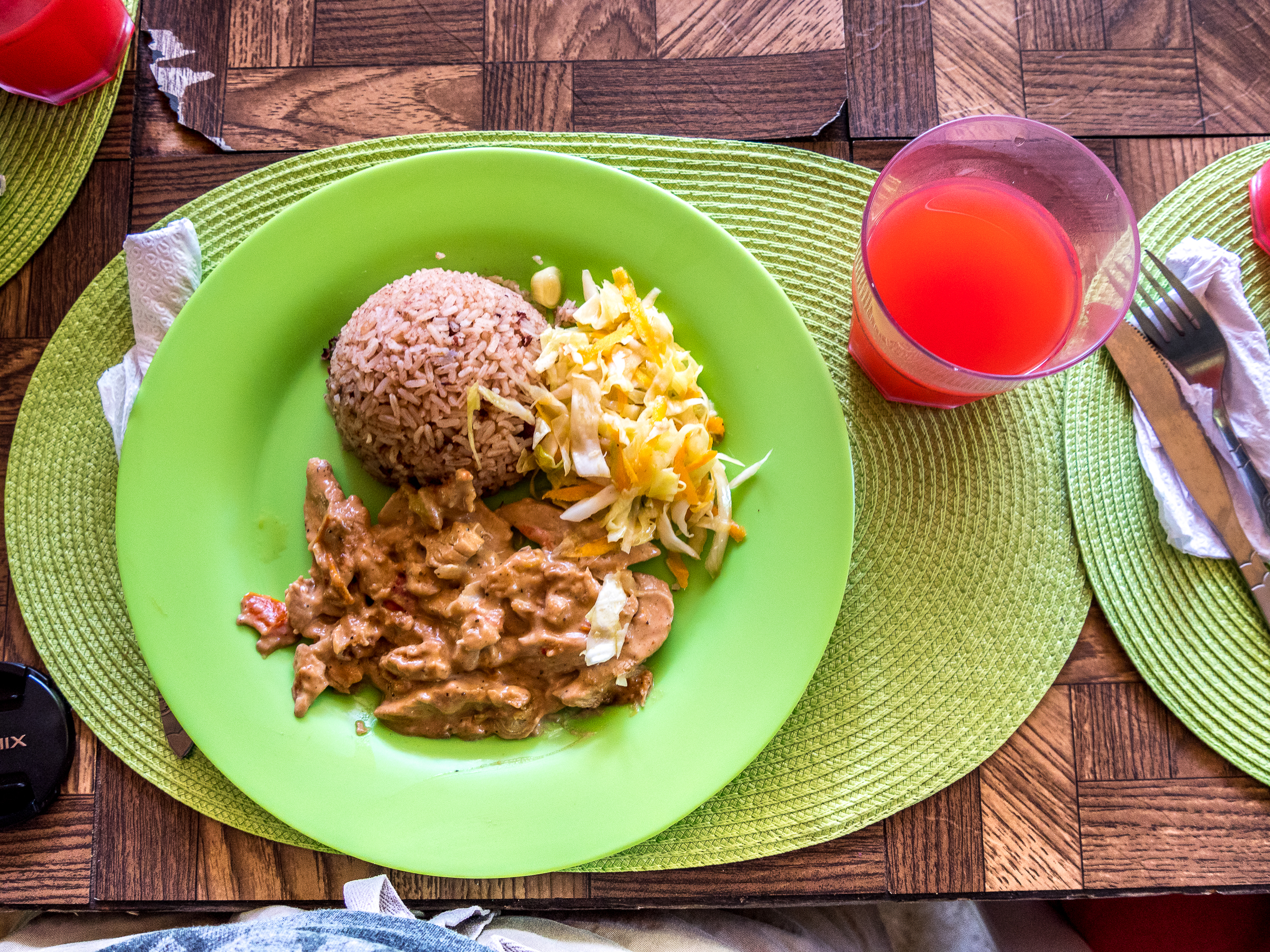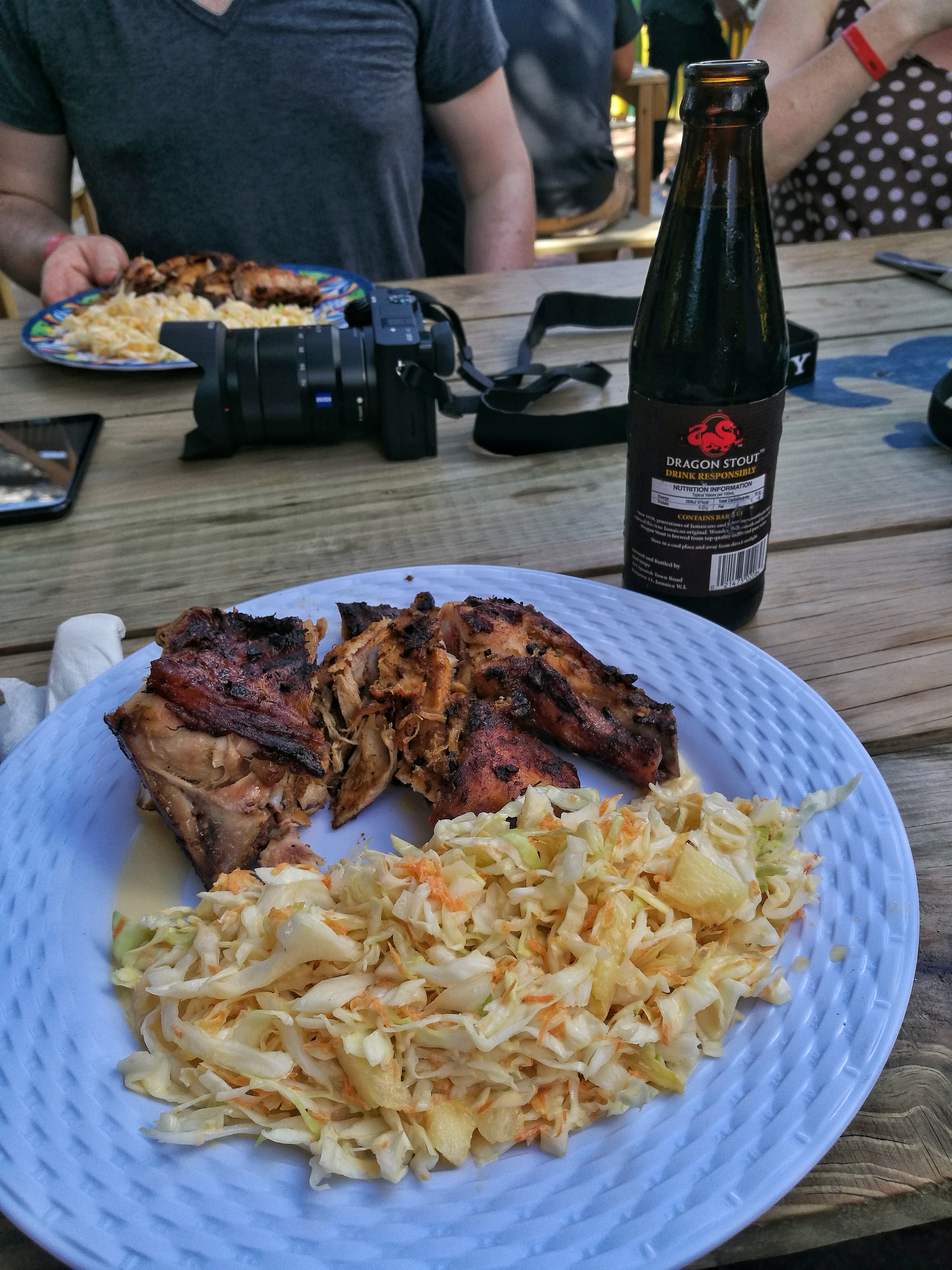 Le roi de la cuisine jamaïcaine (après l’ackree et morue salée qui est le plat national), c’est le « jerk chicken ». Un poulet mariné aux épices, cuit au barbecue et servi avec la sauce « jerk » (bien forte) et des « rice’n peas » (du rit cuit avec de la coco et des haricots) ou une bonne coleslaw à l’ananas. Si je te dis Lectrice, Lecteur, qu’on en a mangé TOUT les midis et sans jamais nous en lasser ?