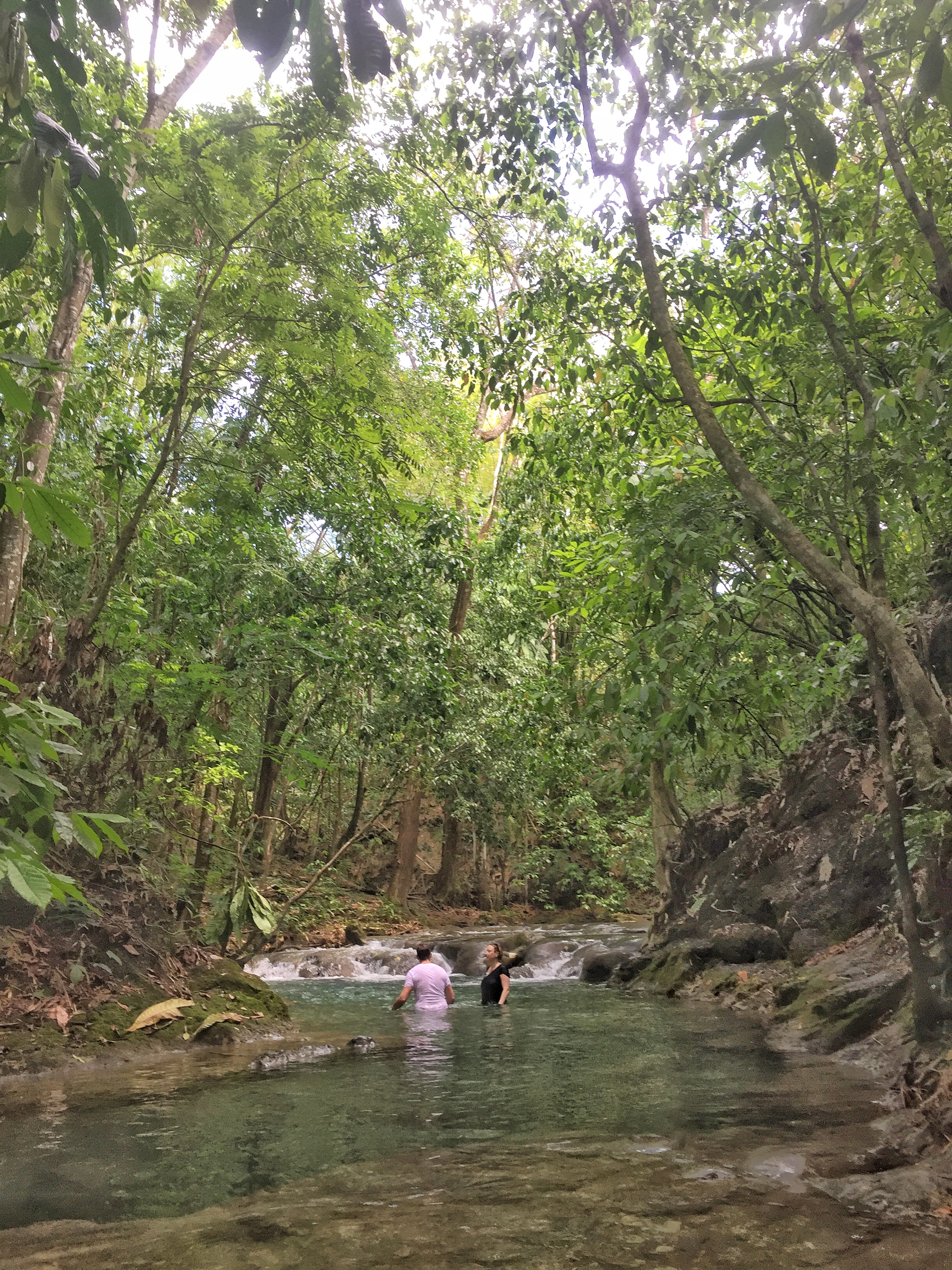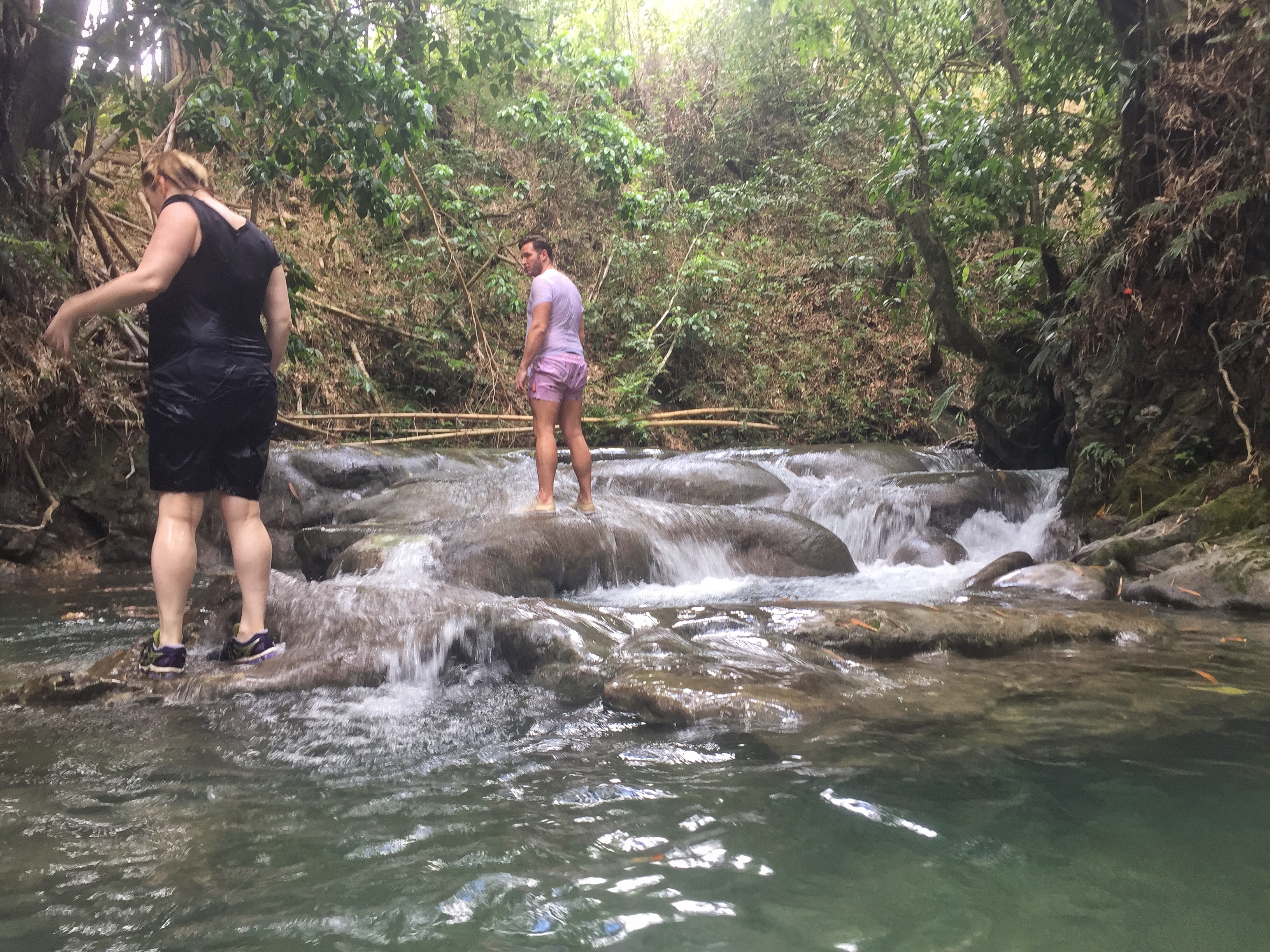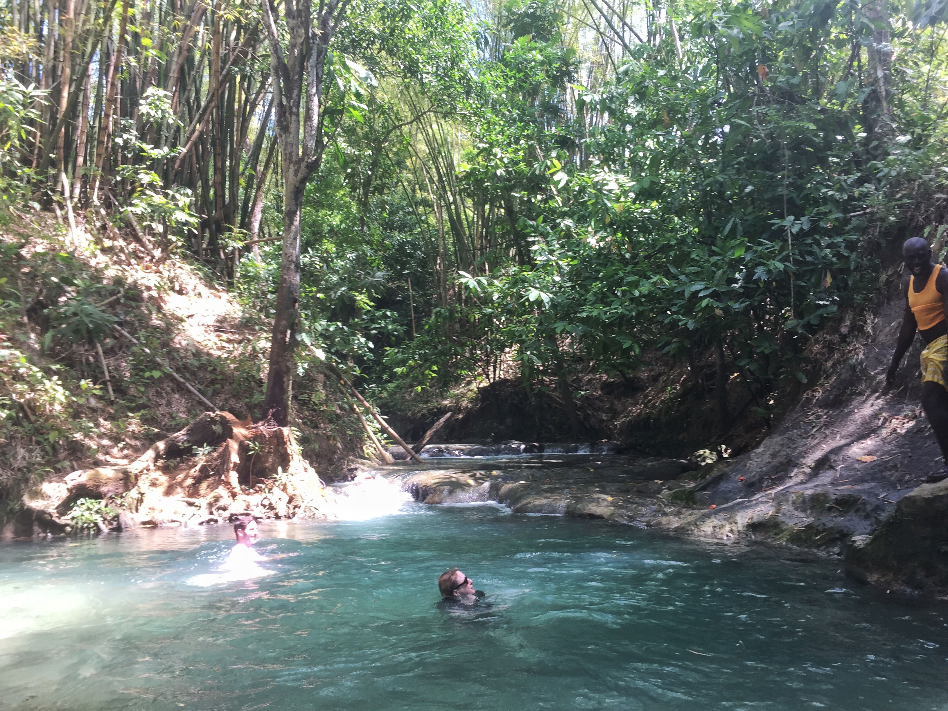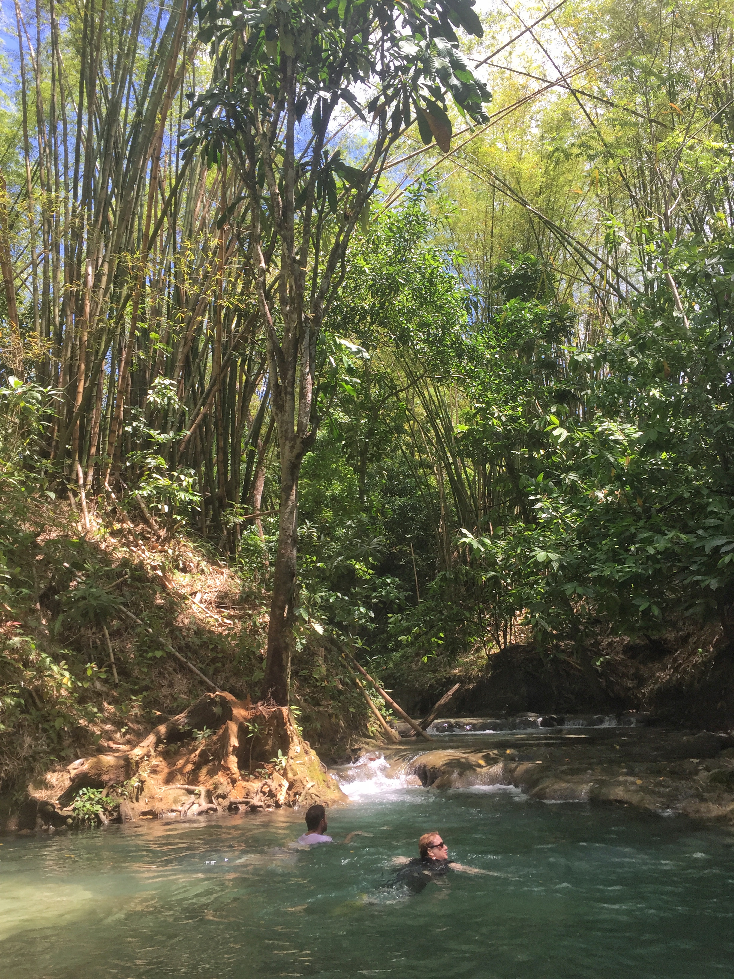 En Jamaïque, il n’y a pas que la plage : l’intérieur de l’île avec ses montagnes vertes et ses rivières n’attendent que d’être explorées. Le lendemain de notre sortie en mer, c’est cette Jamaïque là que nous allons découvrir : en route pour Mayfield Falls ! Et que va t’on y faire ? De l’aqua-rando ! C’est à dire que l’on va remonter une rivière et ses mini-cascades dans l’eau ! Petit conseil préalable : si nous n’avez pas de chaussures waterproof, n’hésitez pas à louer les chaussons et sandales (7 USD) car Lectrice, Lecteur, tu risquerais de ruiner tes chaussures des randos pour de bon ! L’aqua-randi, c’est une manière bien agréable de profiter à fond d’un endroit enchanteur : on marche dans l’eau, on nage de piscines en piscines sous une voûte verte faite de bambous géants, de palmiers et autres plantes tropicales. Un vrai bonheur ! Et pour se remettre de ses émotions, n’hésitez pas à prendre le déjeuner au restaurant de Mayfield Falls (le poulet au coco est un régal) !