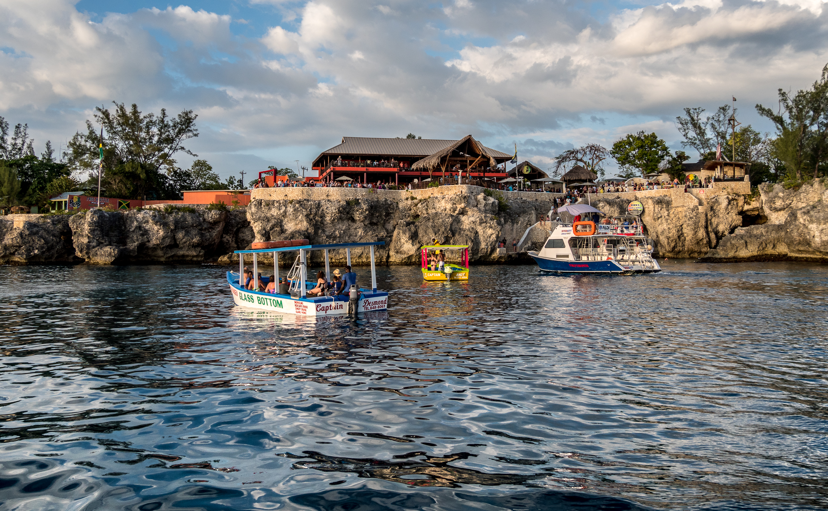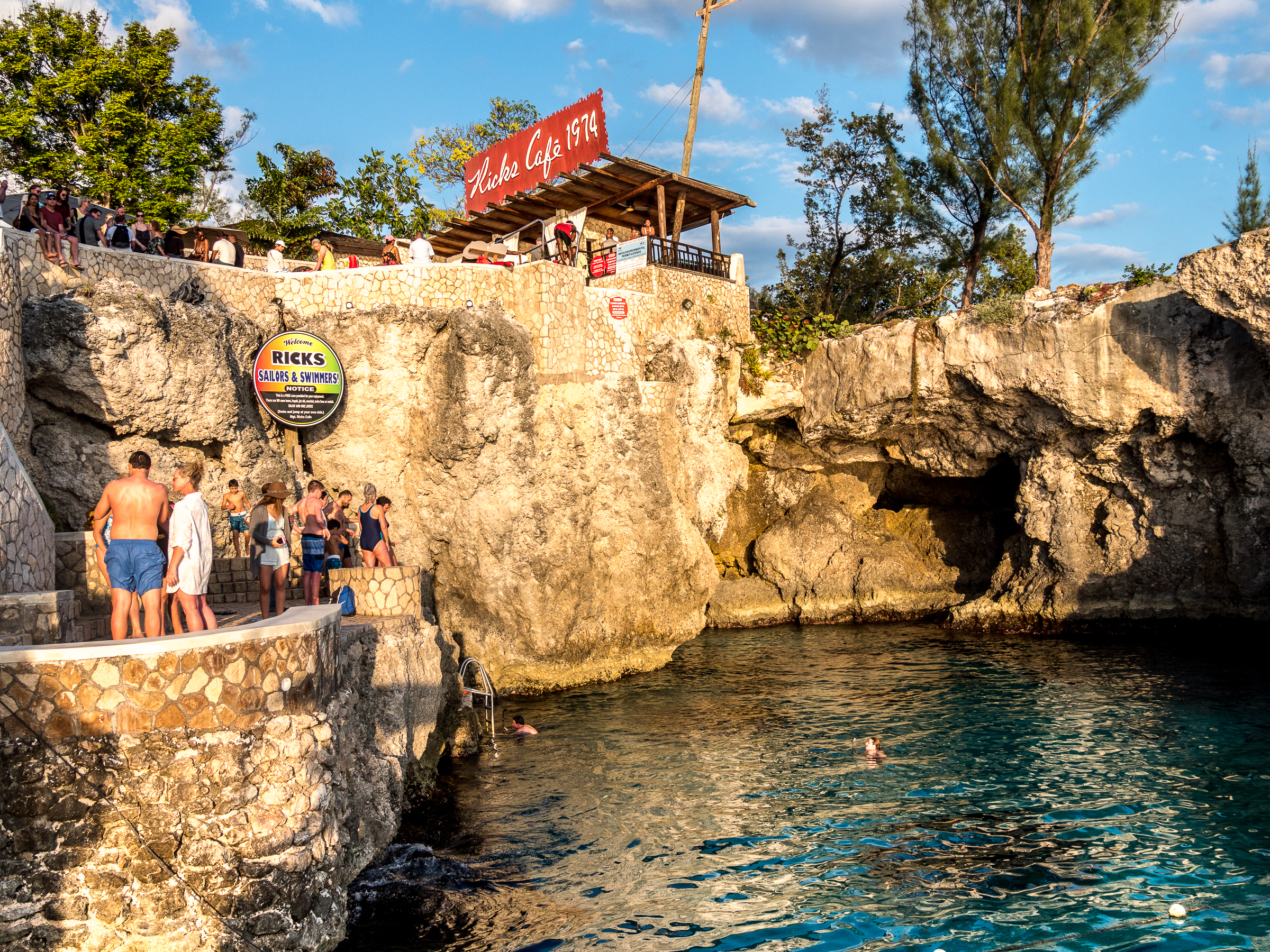 Mais le point focal de West End, c’est Rick’s Café. Fondé dans les années 70, c’est une véritable institution jamaïcaine. Détruit deux fois par des ouragans, il a été a chaque fois reconstruit, toujours en plus grand. Ce qui était un modeste bar est devenu un véritable Disneyland : trois étages, un magasin de souvenirs, une grande scène, une petite piscine… c’est impressionnant. Malgré son aspect » piège à touristes », vous verrez aussi pas mal de Jamaïcains venir y prendre du bon temps et surtout, admirer de magnifiques coucher de soleil… et les plongeurs qui se jettent depuis la falaise, 10 mètres au dessus de la mer (si vous arrivez à vous détacher du spectacle de la mer et des gens qui vous entourent). Du reggae dans les oreilles, avec un rhum punch dans la main et la lumière orangée du soir, il y a comme de la bienheureuse insouciance qui flotte dans l’air !
