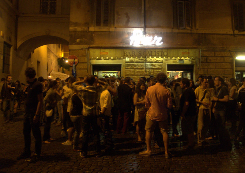 La lumière du soleil couchant, la douceur de l’air du soir, les places pleines de monde, encore plus que dans mes souvenirs et des vieilles connaissances retrouvées avec plaisir : la Piazza di Spagna, le Campo’ de Fiori, le Pantheon, Santa-Maria in Trastevere, la Piazza Navonna, le panorama sur Saint-Pierre depuis un des ponts du Tibre et surtout, surtout… des retrouvailles avec mon quartier général : le Bar San Callisto. Tout comme la ville qui l’abrite, lui aussi est éternel !