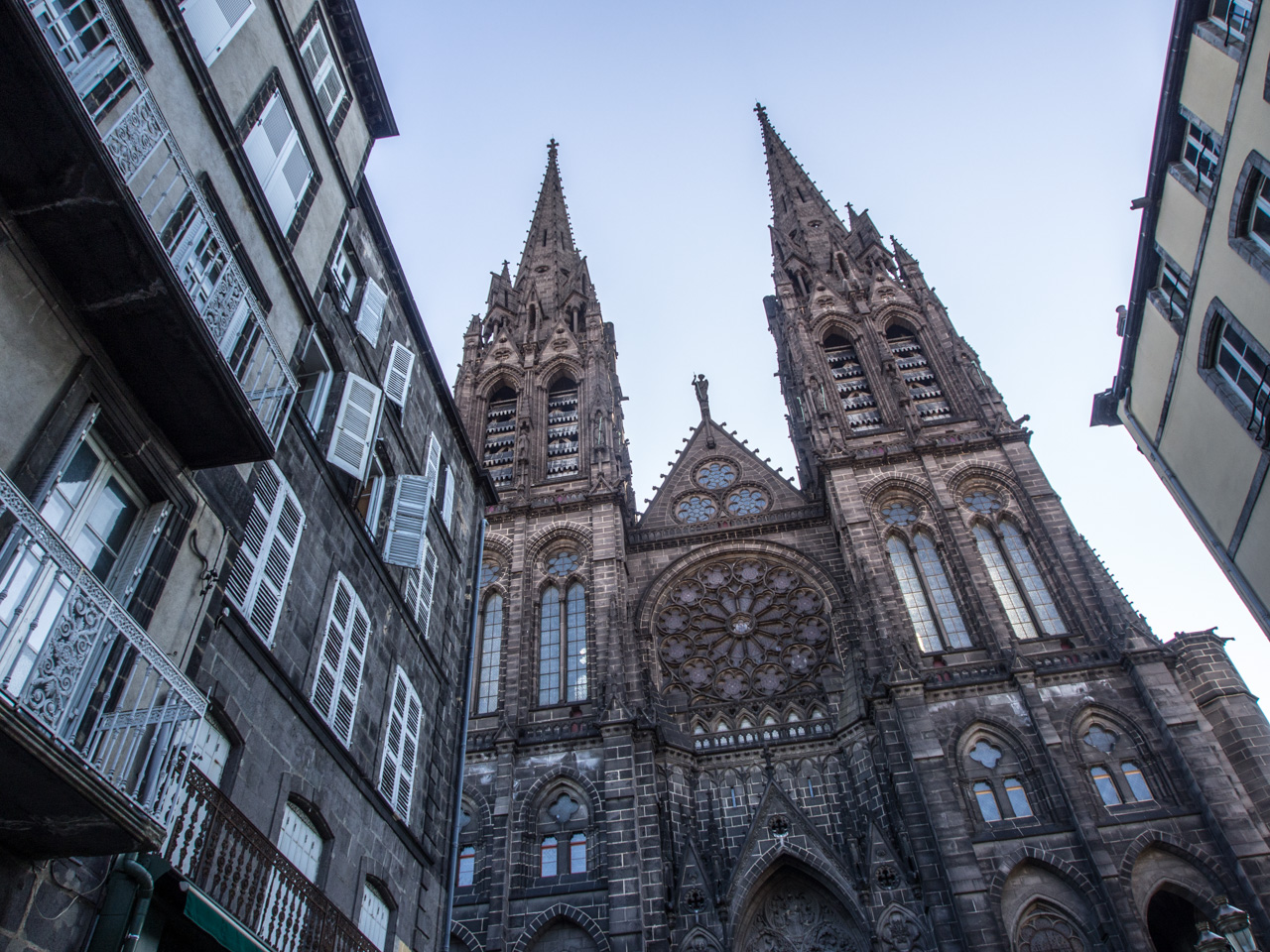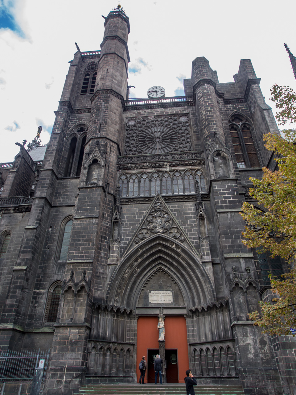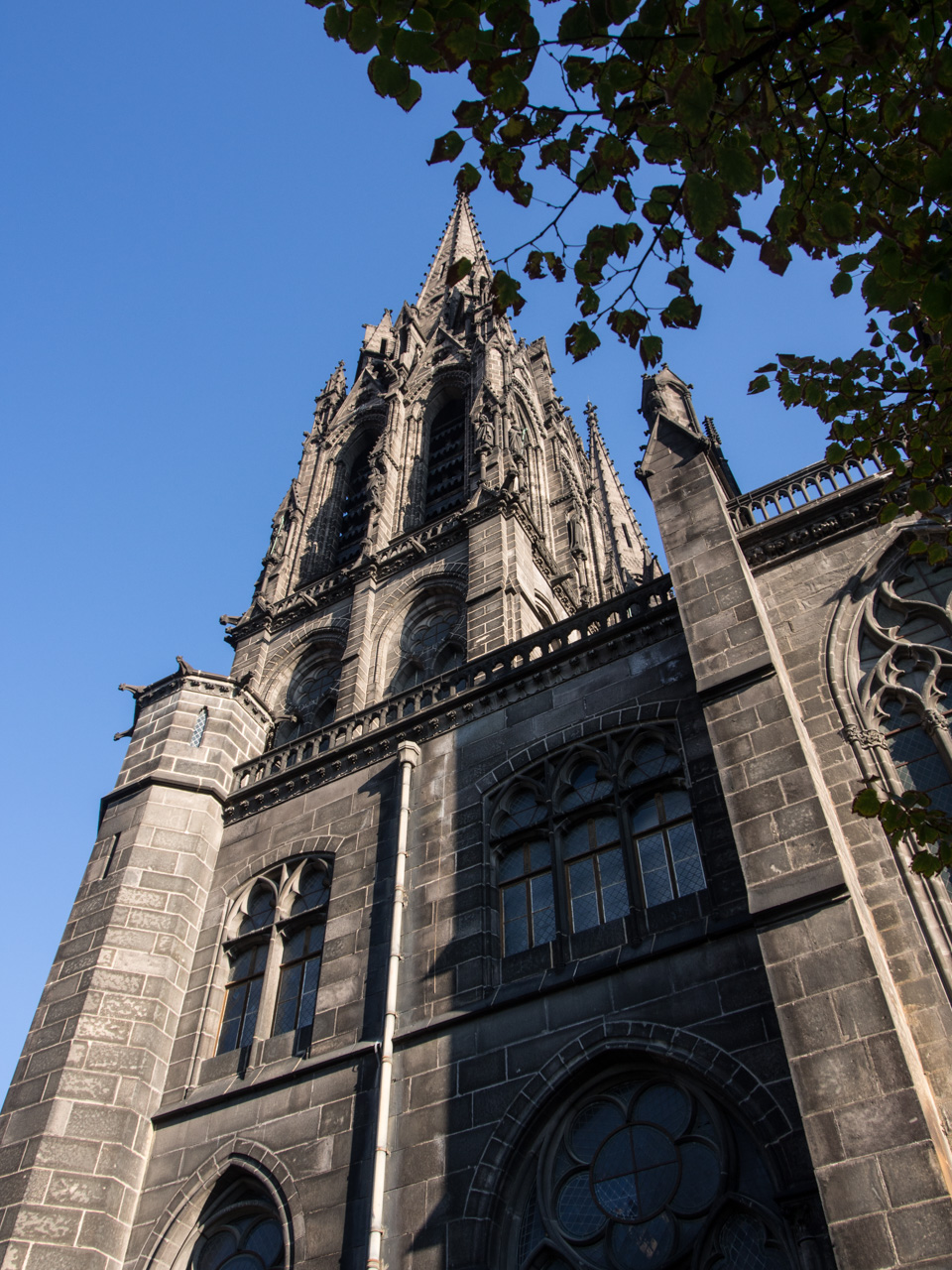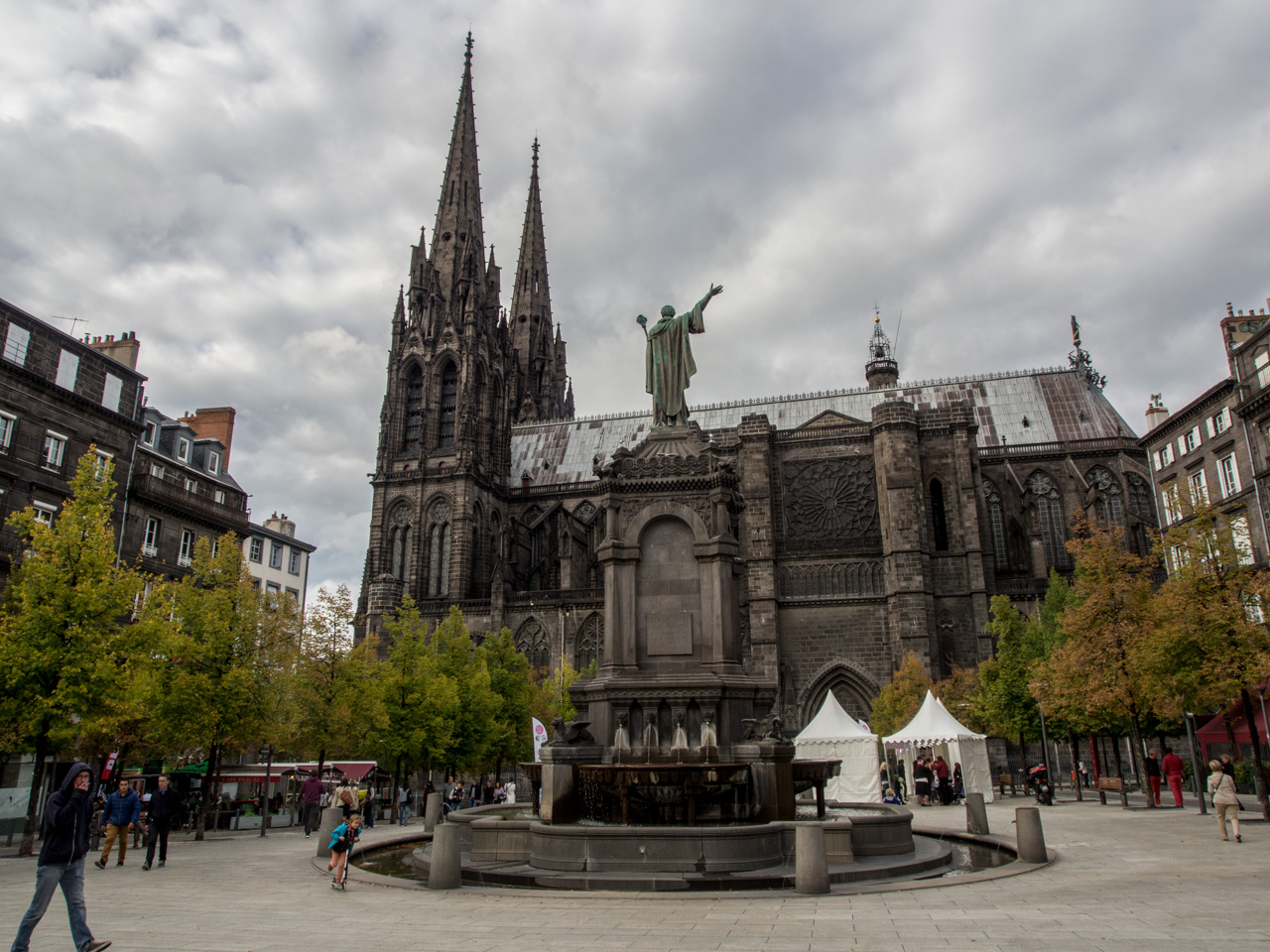 L’autre, c’est la cathédrale Notre-Dame de l’Assomption. Et quelle cathédrale ! Toute en pierre de lave, sa grande masse noire, juchée sur le sommet de la butte du centre-ville, en impose encore plus. En fait, elle ferait presque peur. Pour Anissa, elle reste un objet d’admiration. « Bon, aujourd’hui il fait gris mais tu devrais la voir avec un grand ciel bleu. Elle se détache encore plus, c’est impressionnant ! » (je pourrais constater de visu le surlendemain, lors d’une balade express avant mon départ). Sur le parvis, on trouve la statue d’un important personnage, Urbain II, Pape. Dans un grand élan de ferveur, il appelle les fidèles à la première Croisade et indique la route vers Jérusalem. En m’approchant, je ne peux pas m’empêcher de regarder les gargouilles. Elles sont énormes, et bien plus longues que les gargouilles habituelles. De loin, on dirait des dizaines de langues qui se projettent de la cathédrale ! Finalement, nous entrons. Bien que les fondements de la cathédrale soient anciens, c’est un bâtiment de style gothique que l’on trouve…. et qui ne fut complètement achevée qu’au milieu du XIXème siècle !