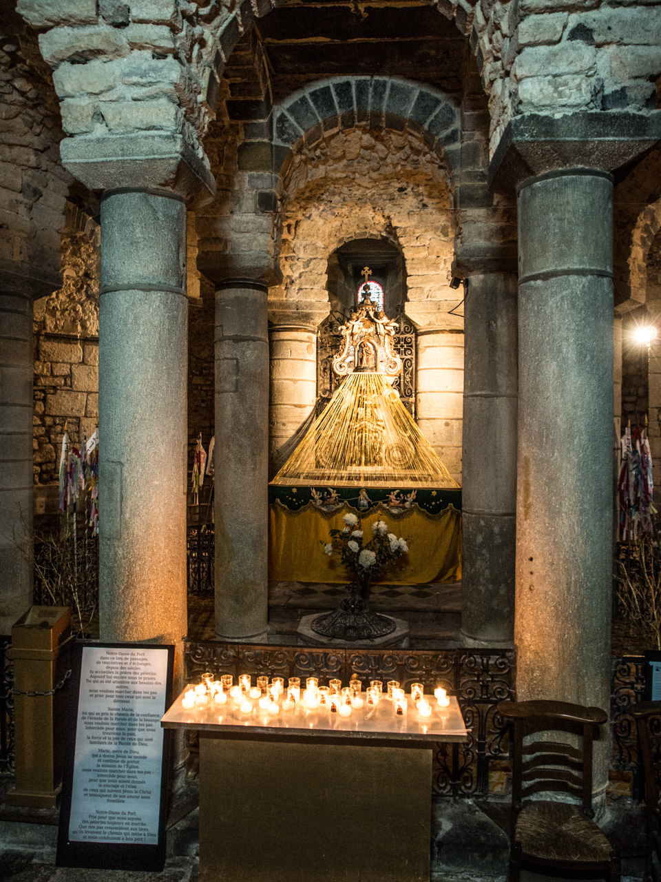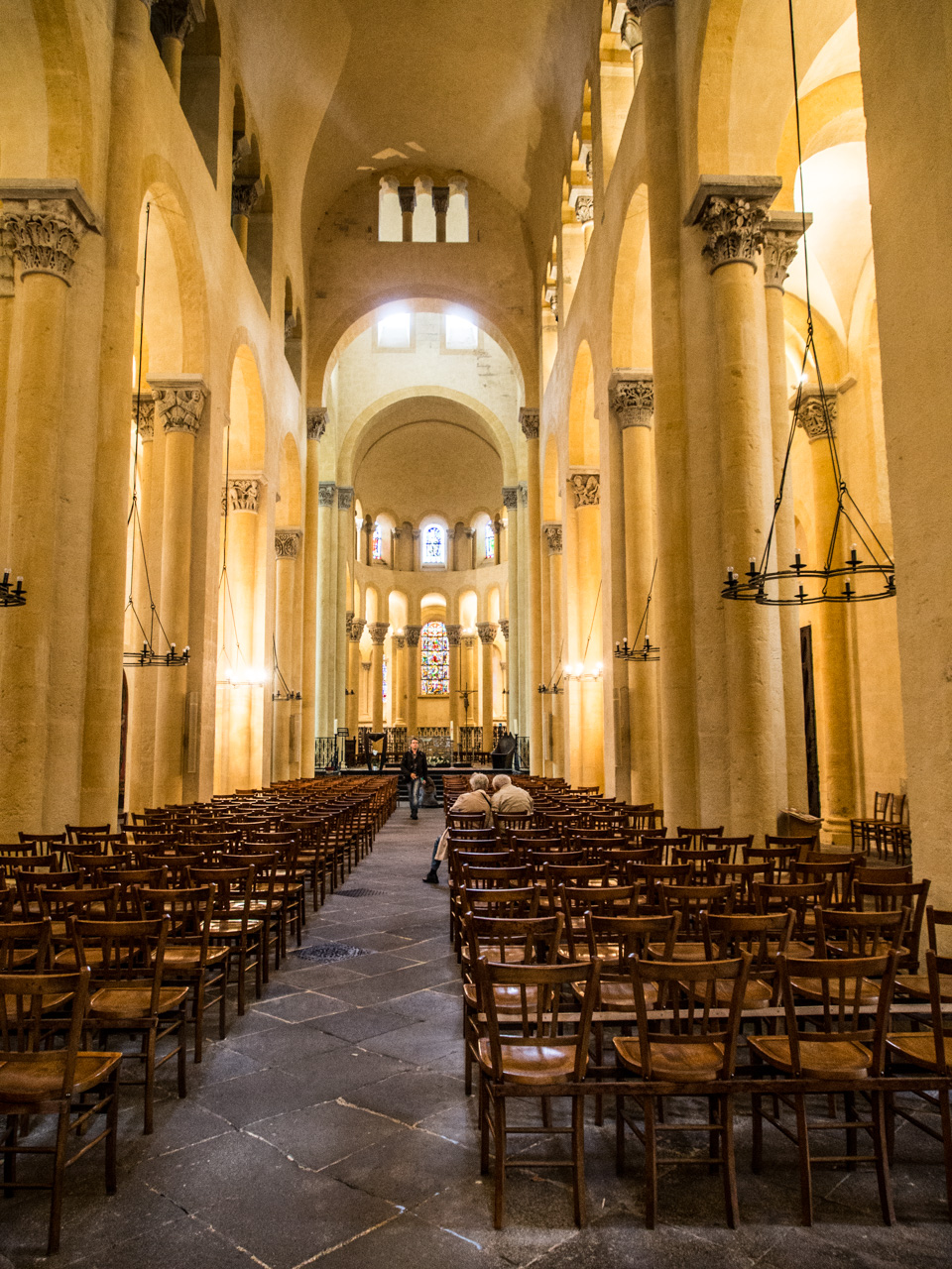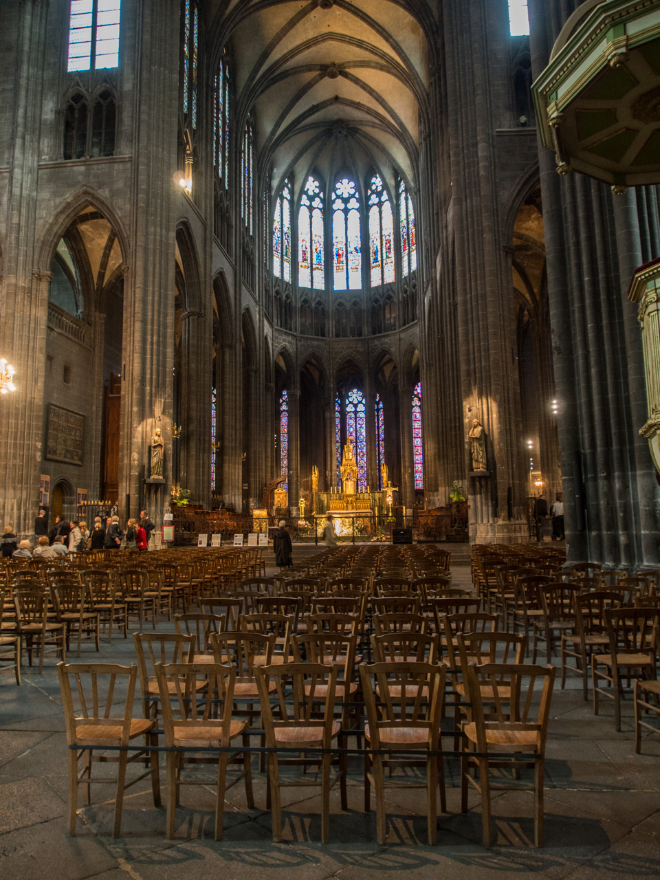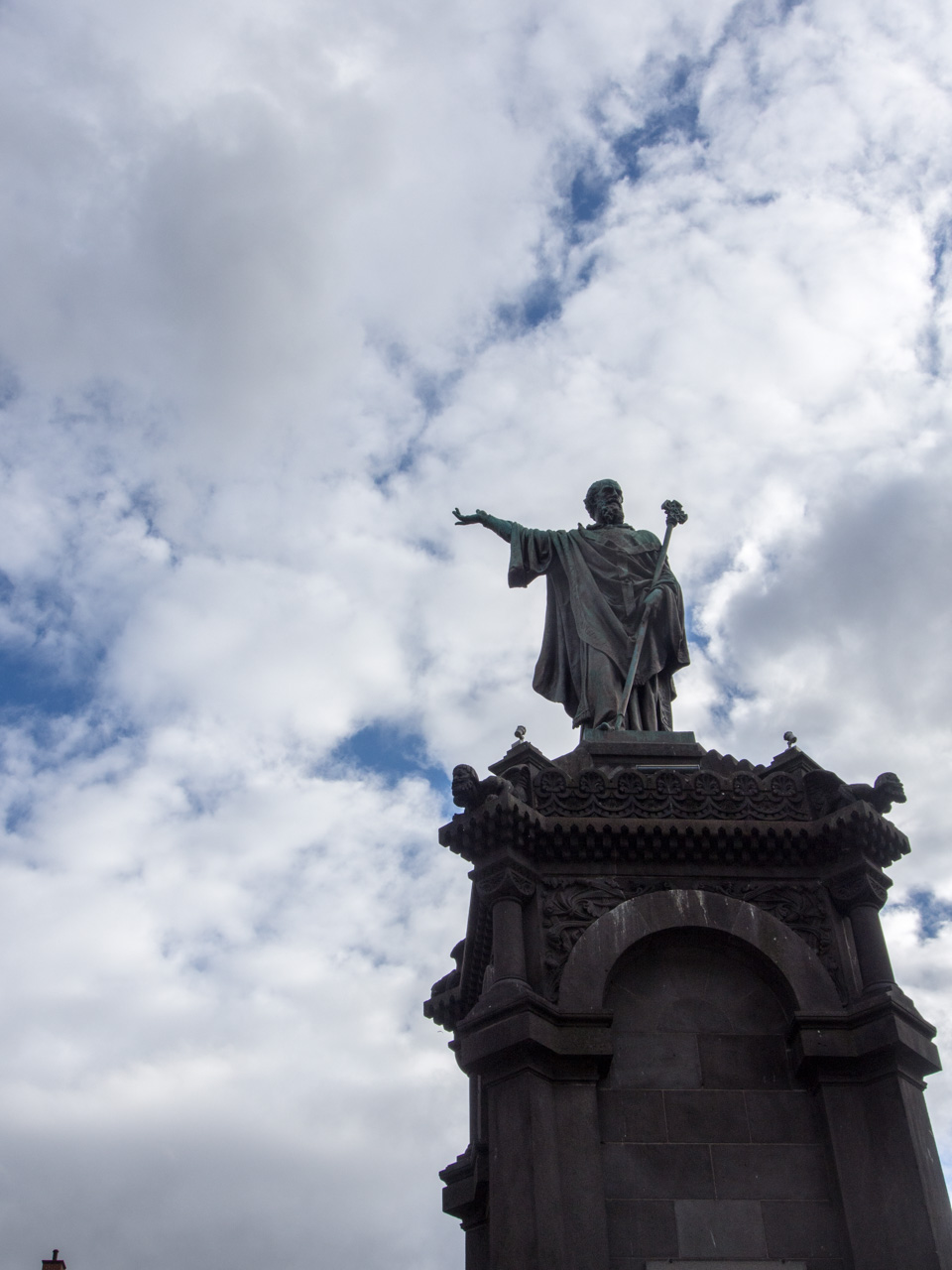 L’autre, c’est la cathédrale Notre-Dame de l’Assomption. Et quelle cathédrale ! Toute en pierre de lave, sa grande masse noire, juchée sur le sommet de la butte du centre-ville, en impose encore plus. En fait, elle ferait presque peur. Pour Anissa, elle reste un objet d’admiration. « Bon, aujourd’hui il fait gris mais tu devrais la voir avec un grand ciel bleu. Elle se détache encore plus, c’est impressionnant ! » (je pourrais constater de visu le surlendemain, lors d’une balade express avant mon départ). Sur le parvis, on trouve la statue d’un important personnage, Urbain II, Pape. Dans un grand élan de ferveur, il appelle les fidèles à la première Croisade et indique la route vers Jérusalem. En m’approchant, je ne peux pas m’empêcher de regarder les gargouilles. Elles sont énormes, et bien plus longues que les gargouilles habituelles. De loin, on dirait des dizaines de langues qui se projettent de la cathédrale ! Finalement, nous entrons. Bien que les fondements de la cathédrale soient anciens, c’est un bâtiment de style gothique que l’on trouve…. et qui ne fut complètement achevée qu’au milieu du XIXème siècle !