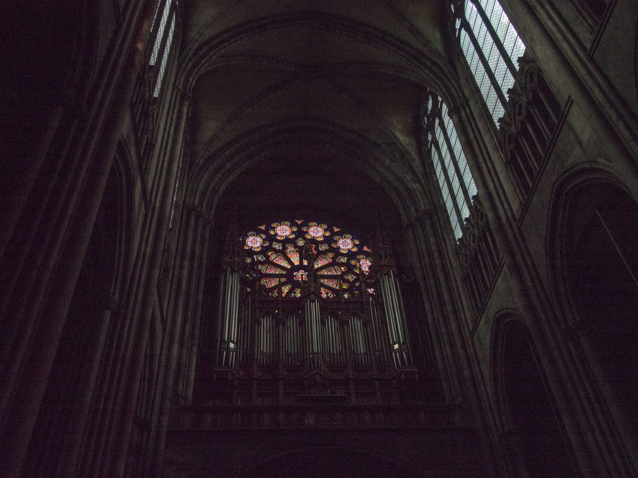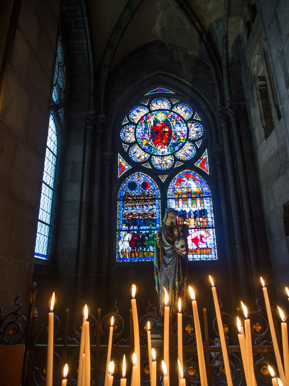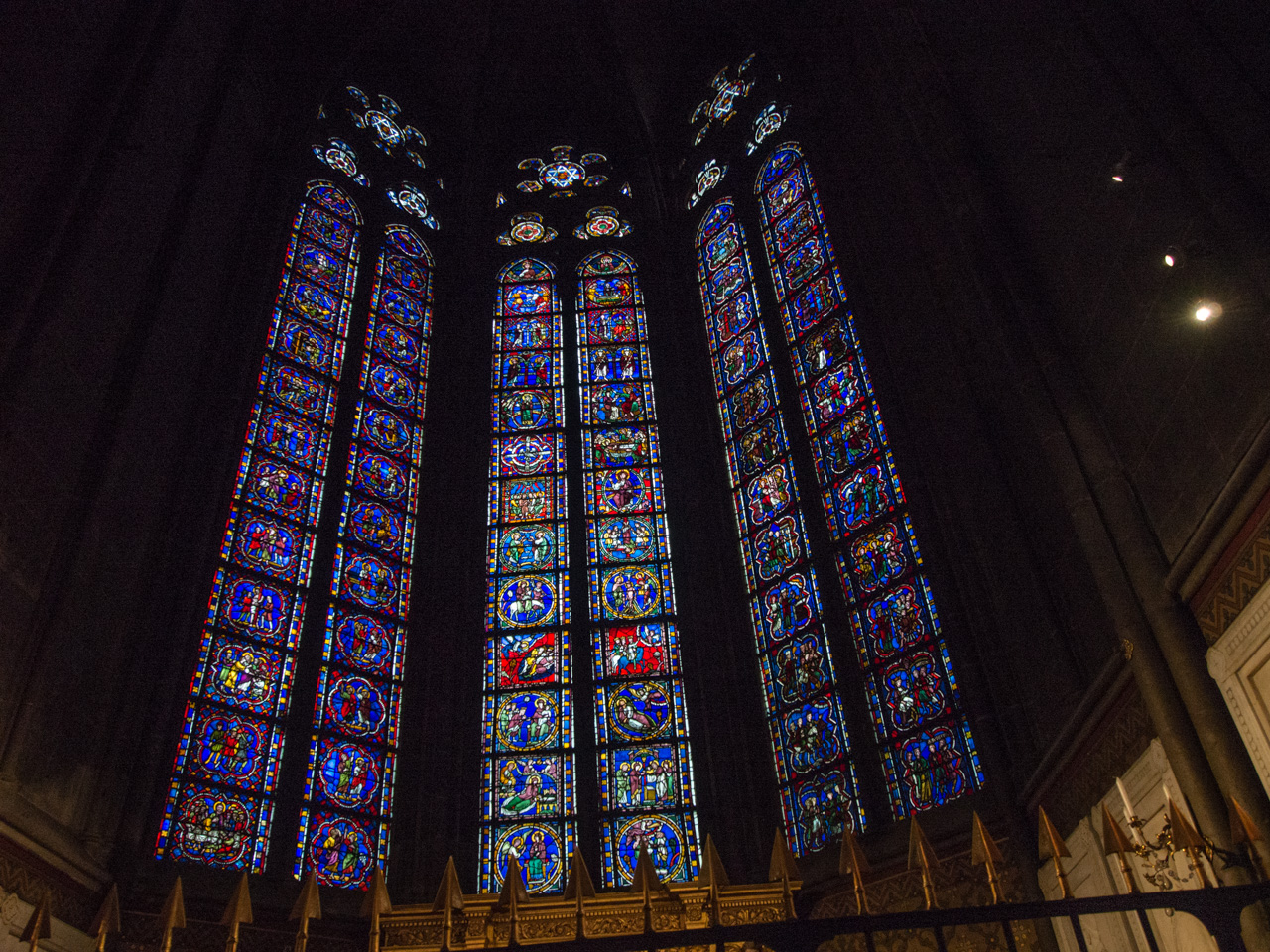 Ce qui frappe au premier regard, ce sont les nombreux vitraux. Ils sont particulièrement beaux, et d’époques différentes. Les plus beaux sont sans doute ceux du déambulatoire, et datent du XIIème siècle. Impossible de ne pas les admirer longuement, tant les couleurs utilisées semblent pures.