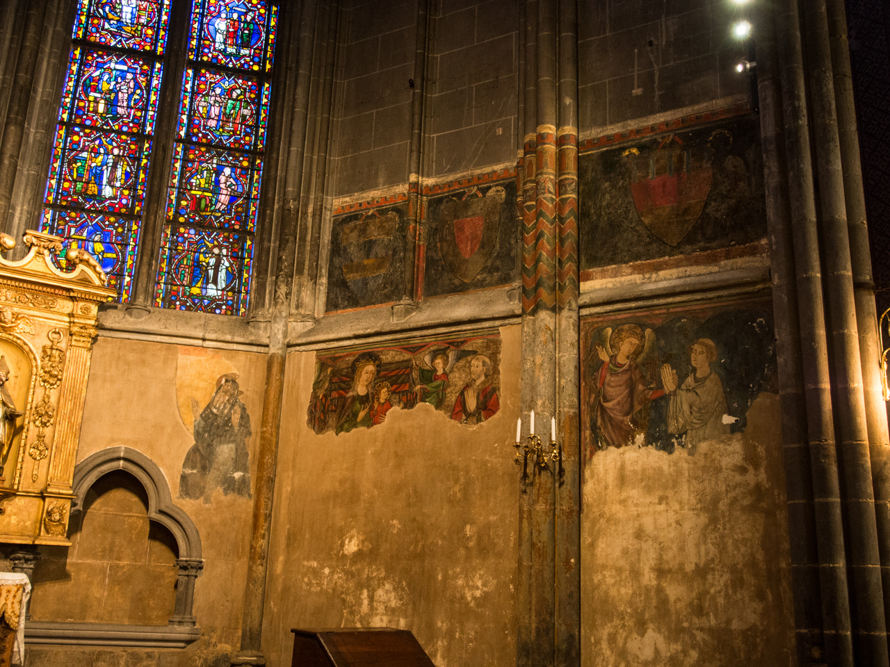 L’autre élément phare, ce sont les peintures murales, certaines très anciennes (XIIème siècle) et qui ont survécu aux âge, rénovations, tremblement de terre et à la Révolution française. Regardez bien au-dessus d’une des entrées : une inscription blanche qui date de cette époque informe que « Le Peuple français reconnoit l’Être Suprême et l’immortalité de l’âme ».