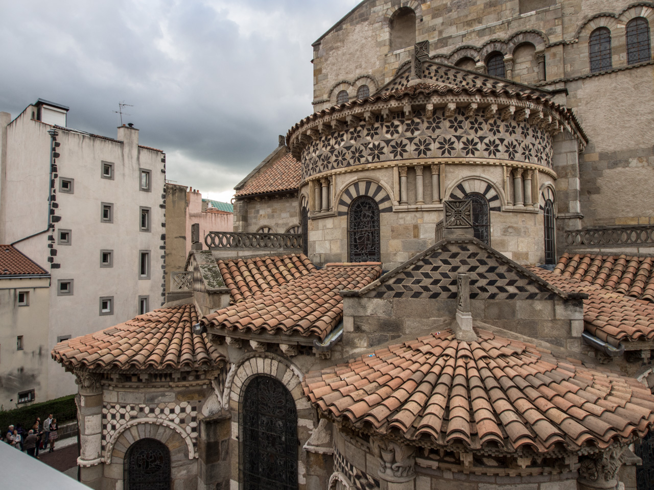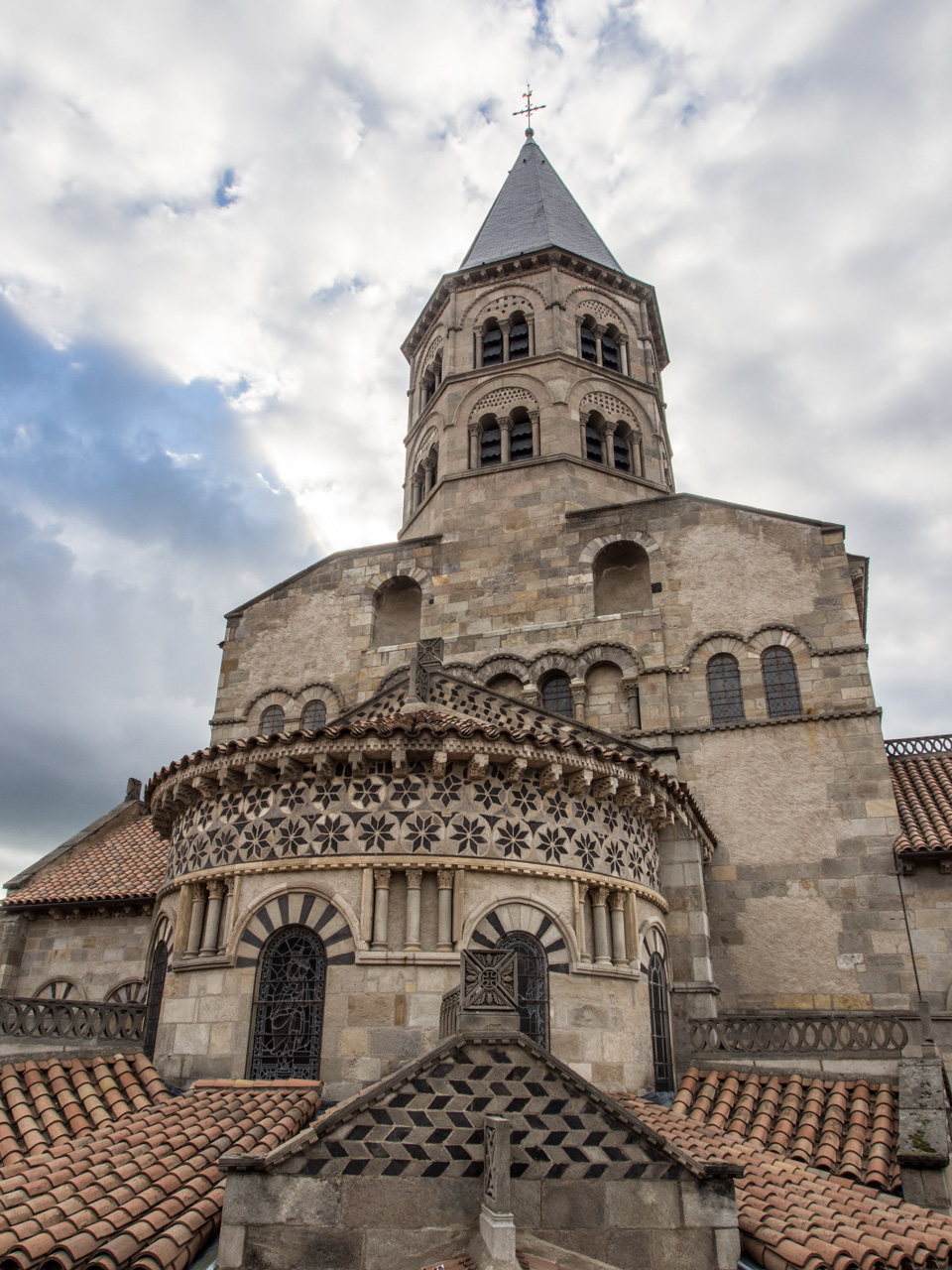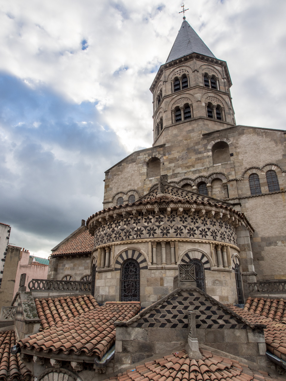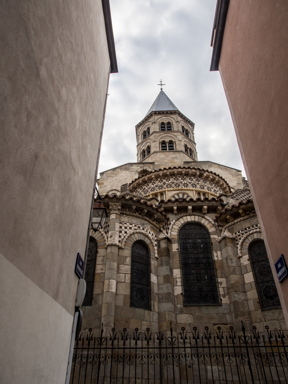 Nous sortons de la cathédrale pour nous diriger vers l’autre bâtiment emblématique de la ville : la Basilique Notre-Dame-du-Port. Celle-ci est bien différente… claire et plus ancienne (la pierre de Volvic n’a su être utilisée en construction qu’à la fin du Moyen-âge), c’est un fleuron du patrimoine roman que compte l’Auvergne. En contraste avec la cathédrale, la basilique a un petit air folâtre avec ses mosaïques en pierres blanches et noires. Même l’intérieur est en totale opposition : rénovée tout récemment, ses murs sont peints en jaune jonquille, couleur d’origine. Mais pour mieux l’admirer, il suffit de se rendre sur une espèce de terrasse, le Belvédère, assez difficile à trouver (il y a des panneaux mais ouvrez l’œil), qui permet d’admirer le chevet de la basilique… et vu de là, elle est encore plus belle !