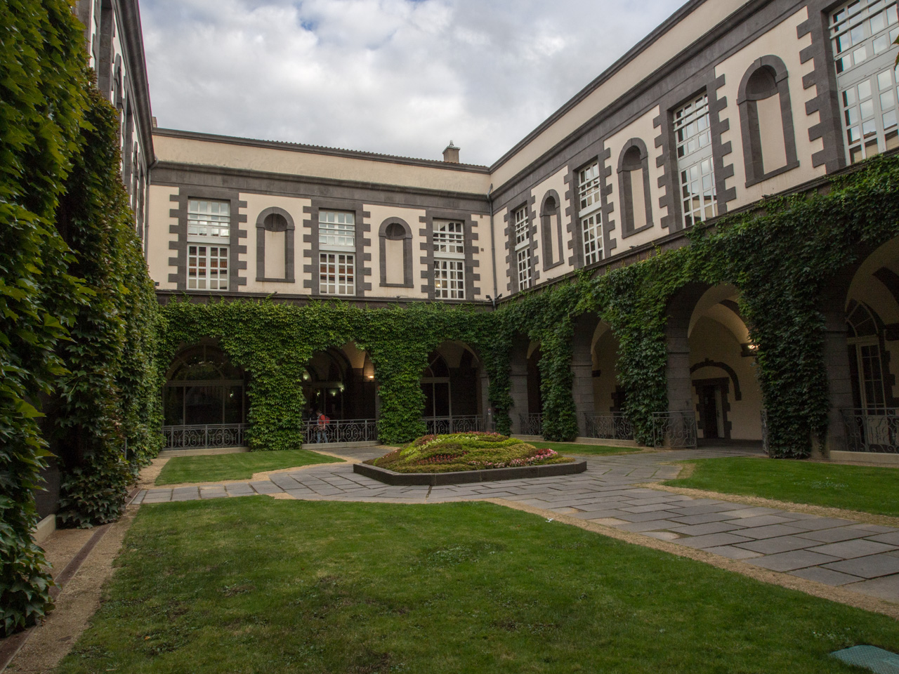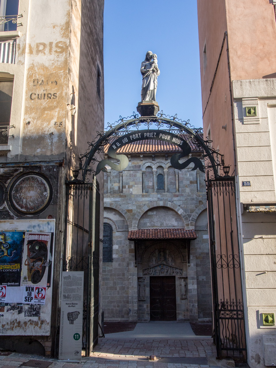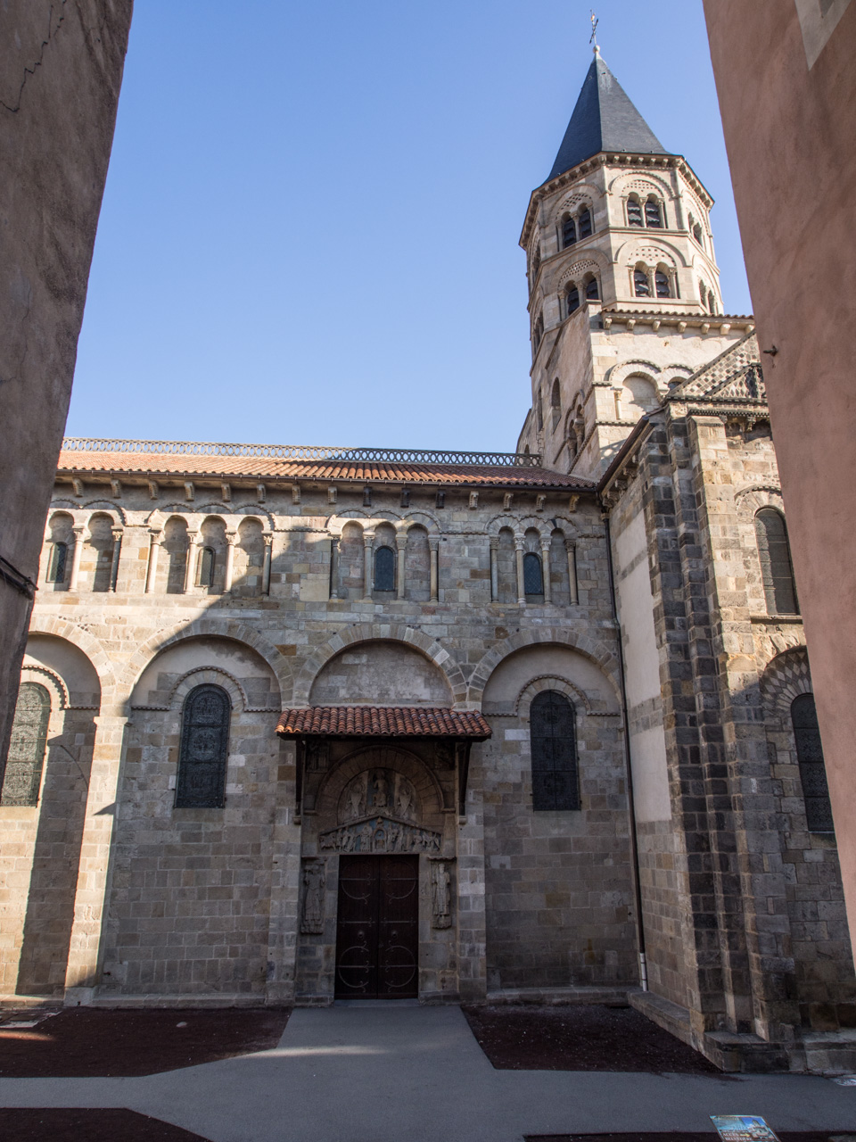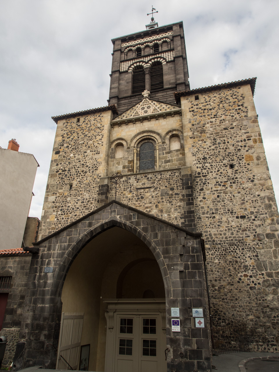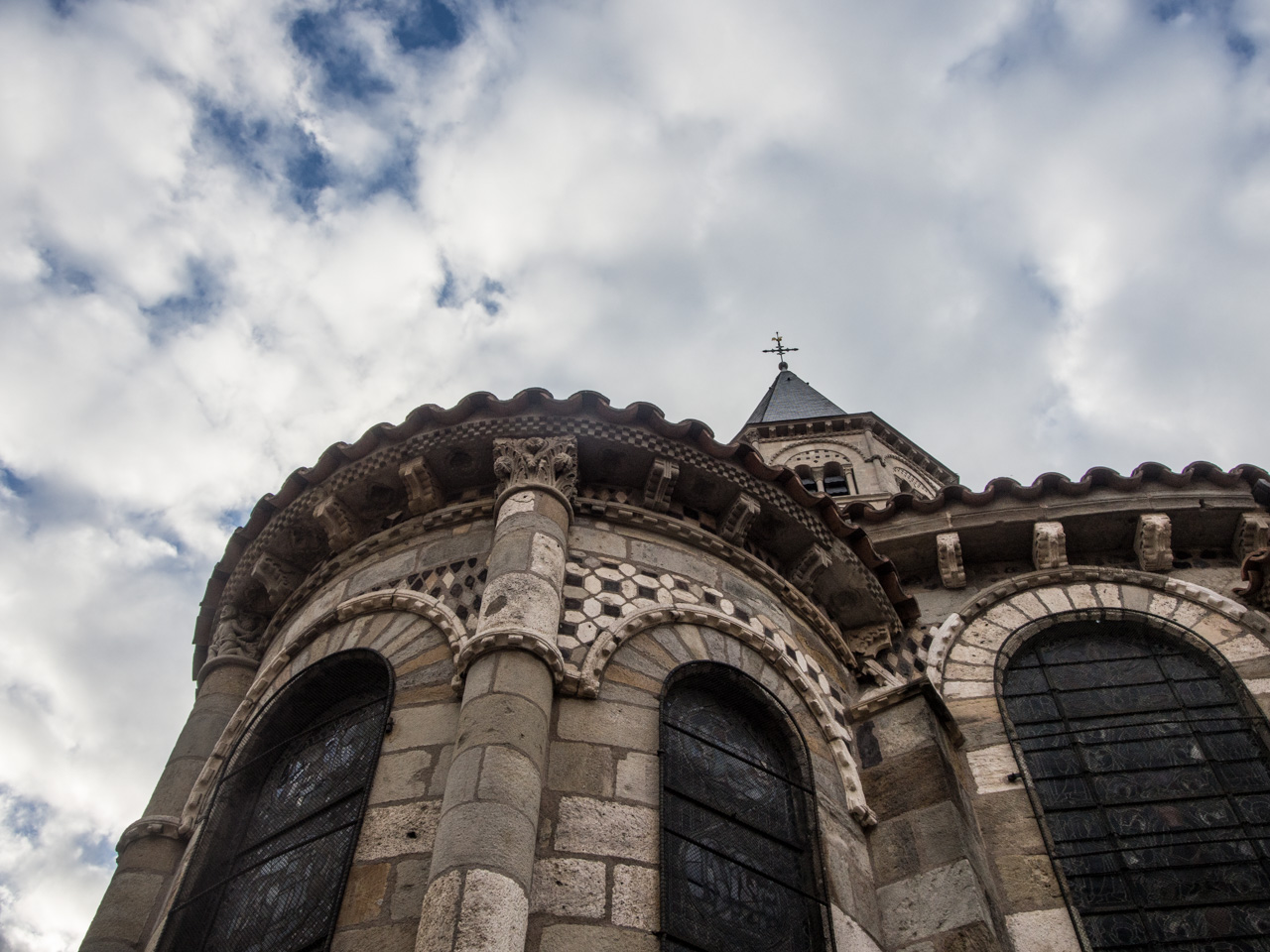 Nous sortons de la cathédrale pour nous diriger vers l’autre bâtiment emblématique de la ville : la Basilique Notre-Dame-du-Port. Celle-ci est bien différente… claire et plus ancienne (la pierre de Volvic n’a su être utilisée en construction qu’à la fin du Moyen-âge), c’est un fleuron du patrimoine roman que compte l’Auvergne. En contraste avec la cathédrale, la basilique a un petit air folâtre avec ses mosaïques en pierres blanches et noires. Même l’intérieur est en totale opposition : rénovée tout récemment, ses murs sont peints en jaune jonquille, couleur d’origine. Mais pour mieux l’admirer, il suffit de se rendre sur une espèce de terrasse, le Belvédère, assez difficile à trouver (il y a des panneaux mais ouvrez l’œil), qui permet d’admirer le chevet de la basilique… et vu de là, elle est encore plus belle !
