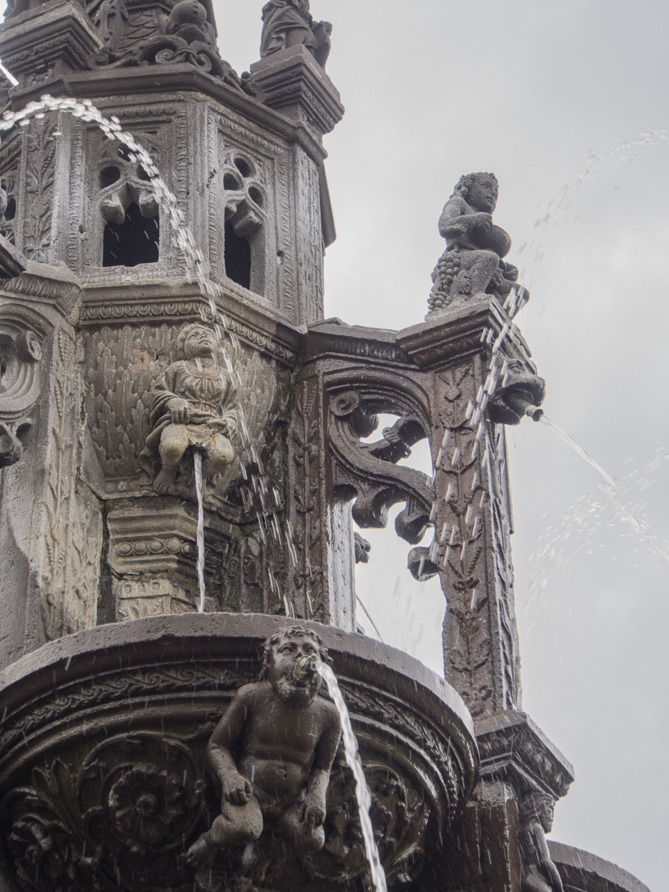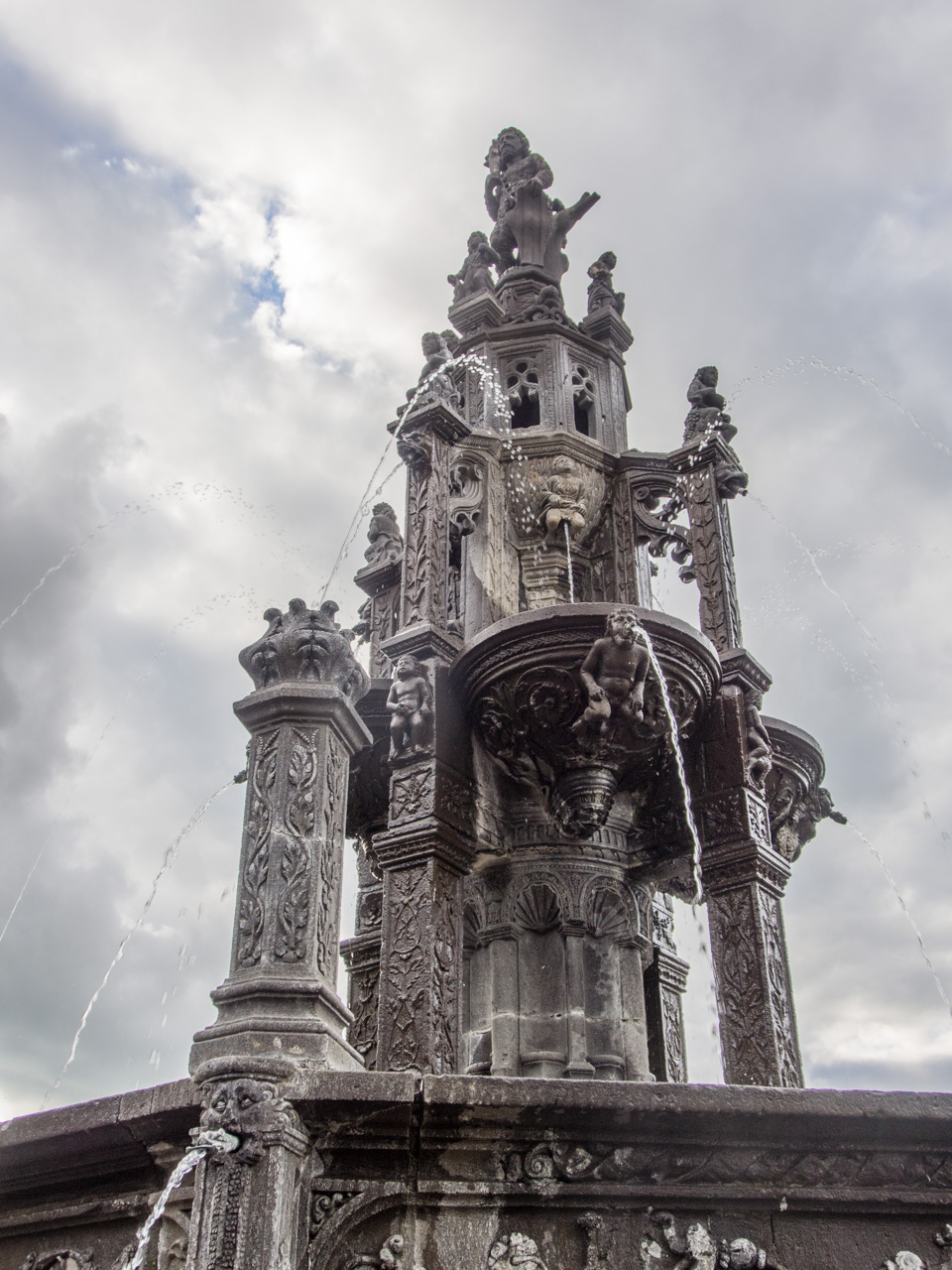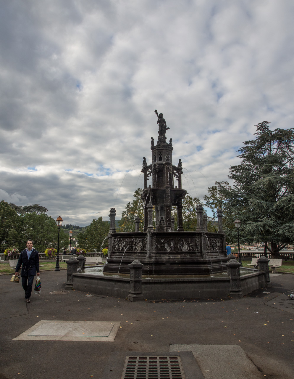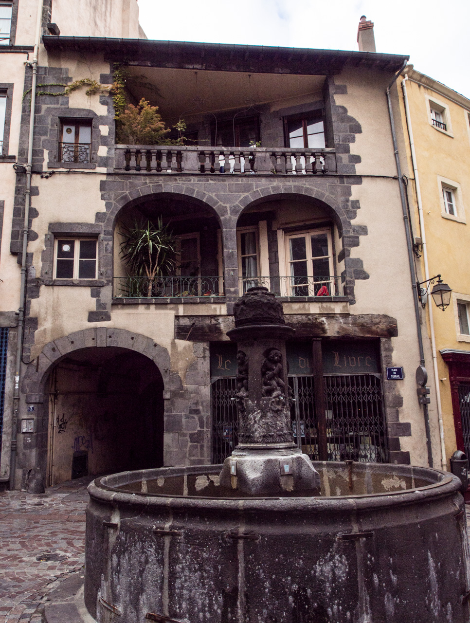Clermont-Ferrand est aussi une ville de fontaines, il existe d’ailleurs un circuit des fontaines qui vous fait visiter la ville tout en les découvrant. Et Virginie tient à nous faire découvrir la plus connue d’entre elles : la fontaine d’Amboise. Celle-ci et elle est plutôt intrigante : le liquide y représenté sous toutes ses formes par de petits personnages mimant des scènes de la vie courante, comme une femme qui lève sa robe pour se soulager ou un bourgeois qui tient une gueule de bois monstrueuse et répand les excès de la veille dans la fontaine. Je vois çà comme des proches parents de notre Manneken Pis ! 😉