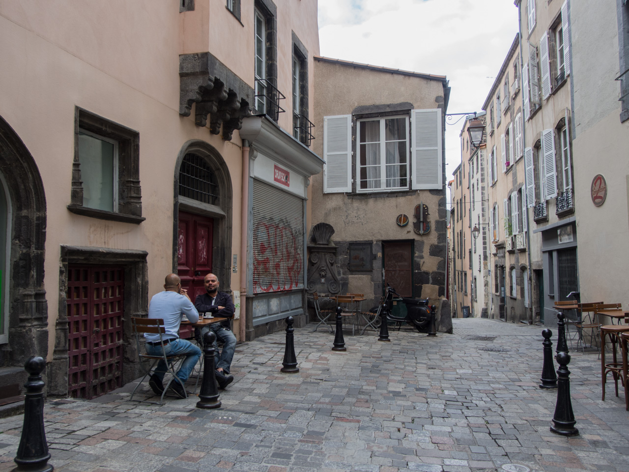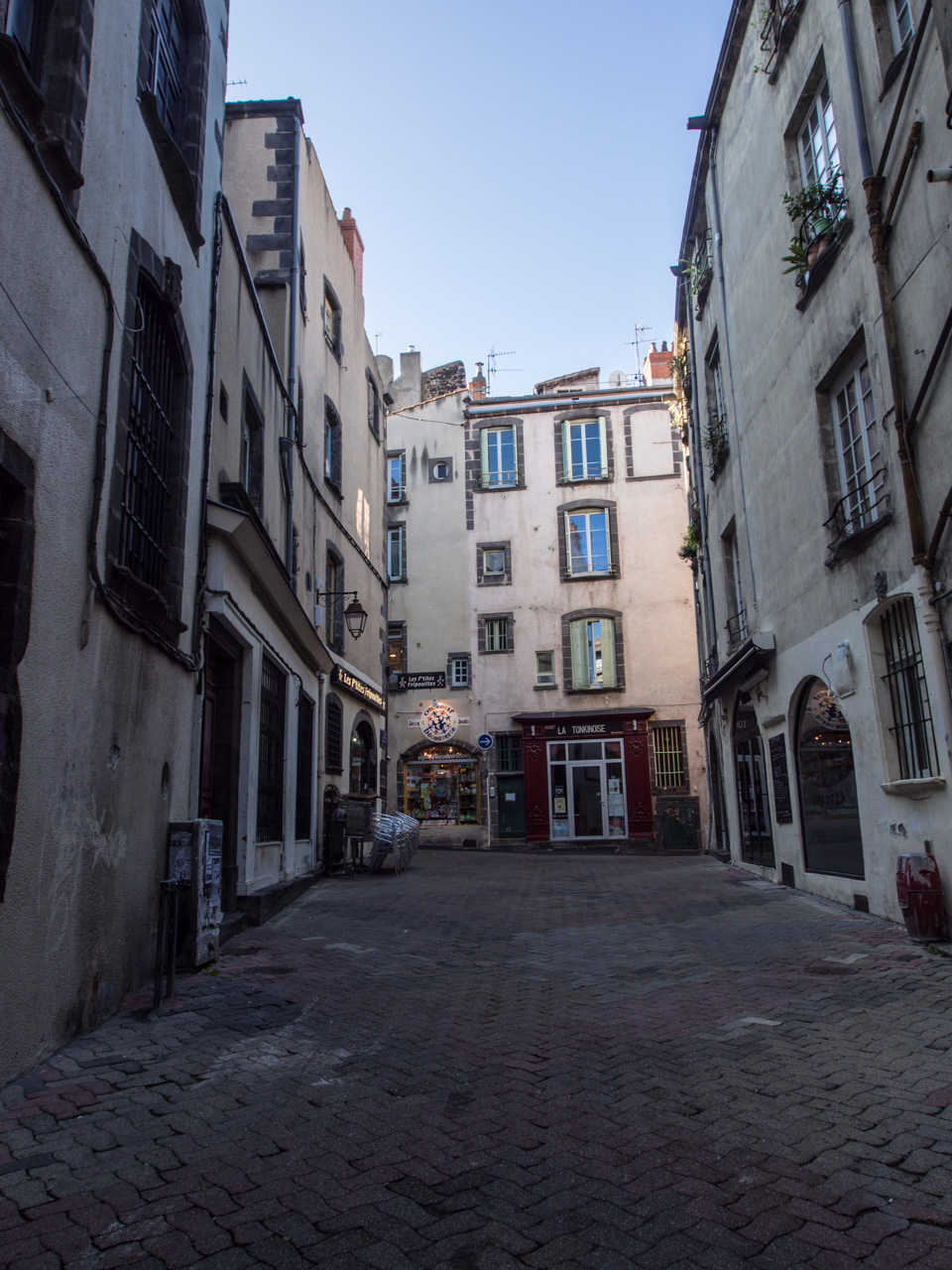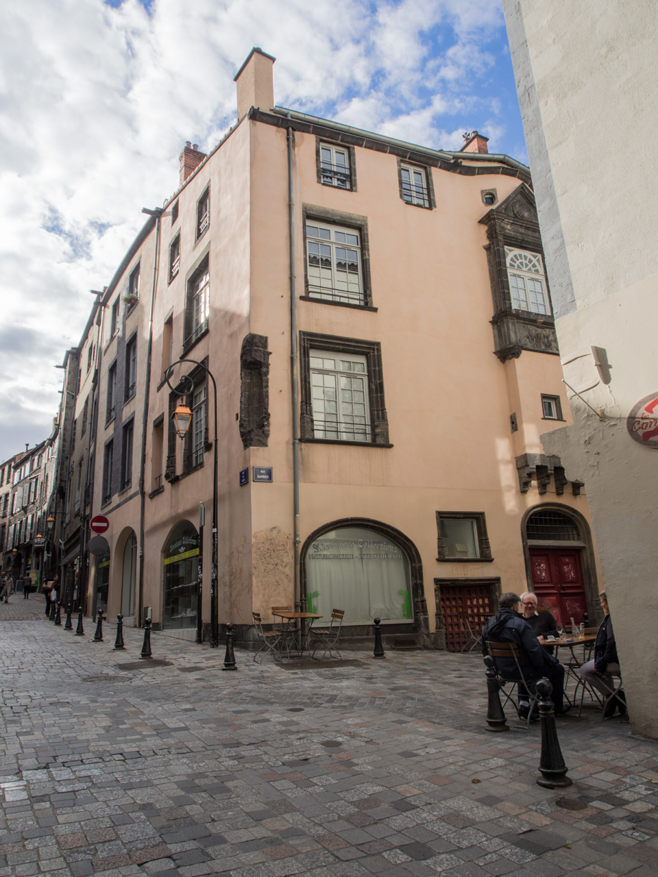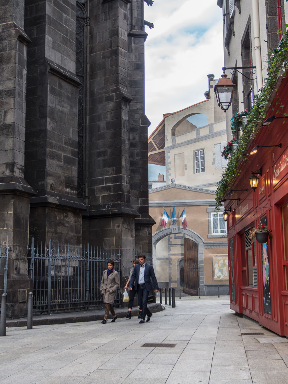 Pour visiter la ville, il faut un peu de bonnes jambes. Le centre-ville est située sur une butte, qu’il faut gravir à partir de mon hôtel, le Best Western Hôtel des Puys, avant de redescendre et au sommet de la butte, la Cathédrale qui règne au dessus de tout çà. Pour la rejoindre, il faudra emprunter la rue du Port. une jolie rue pentue bordée de maisons anciennes et c’est là qu’on fait connaissance avec ce qui donne le cachet de la vieille ville de Clermont-Ferrand : la pierre de Volvic, une pierre volcanique qui devient complètement noire une fois exposée aux éléments. Quelques fois, elle est utilisée pour de la décoration, ou en détails comme des pierres d’angles ou des frontispices. Quelque fois, elle est utilisée pour construire un bâtiment entier. Ça donne un côté graphique à la vieille ville, le noir tranchant sur du blanc, du jaune ou du vieux rose. Ça procure aussi une drôle de lumière à la ville, plus sombre, plus mystérieuse… sans celà, les petites rues ressembleraient fort à celles d’une ville italienne. Et il fait bon s’y perdre. Cette butte, c’est quasi un village ! La rue du Port et ses environs, c’est le royaume des antiquaires. Les chineurs deviendront littéralement fous en y découvrant les boutiques.