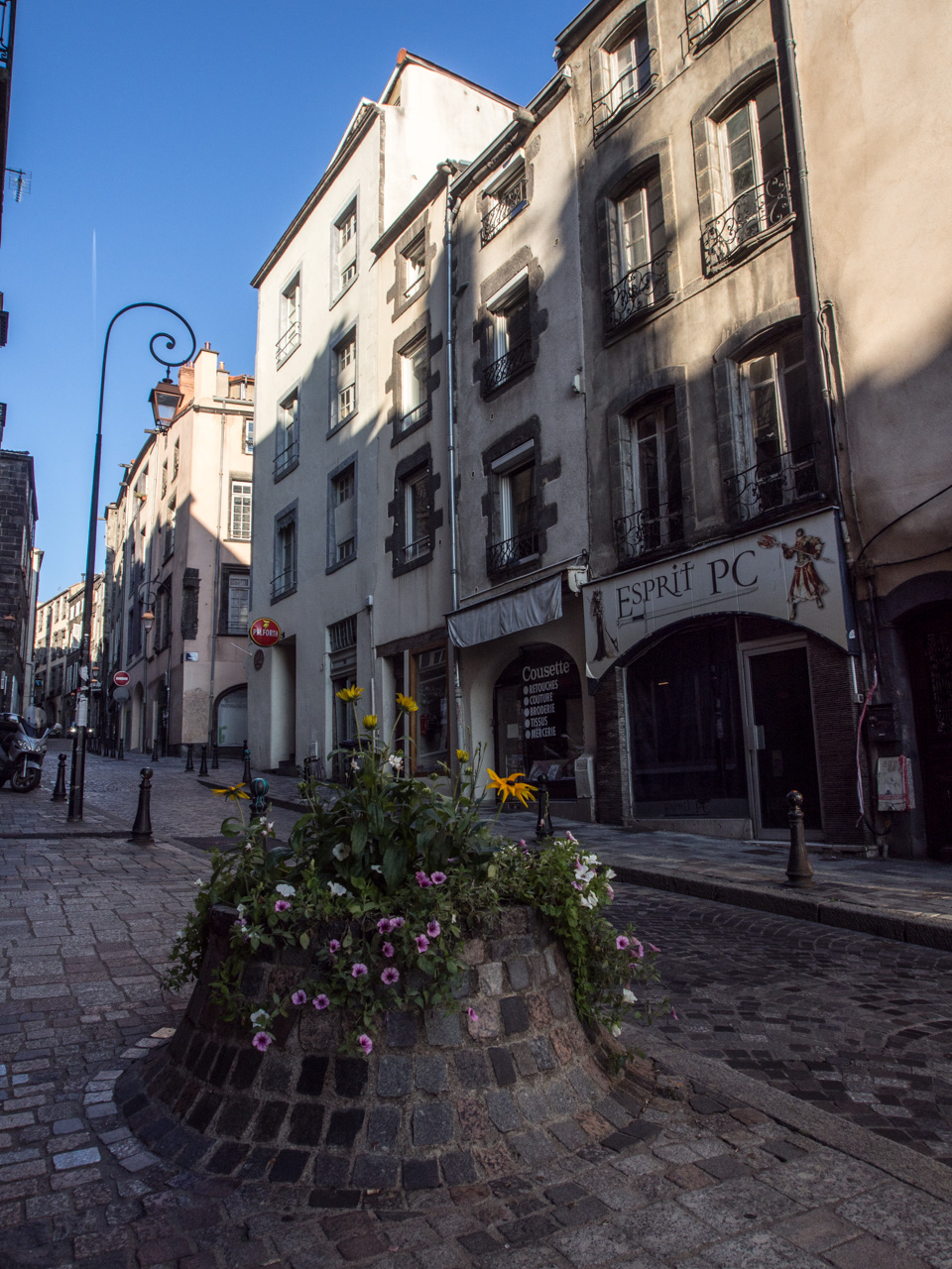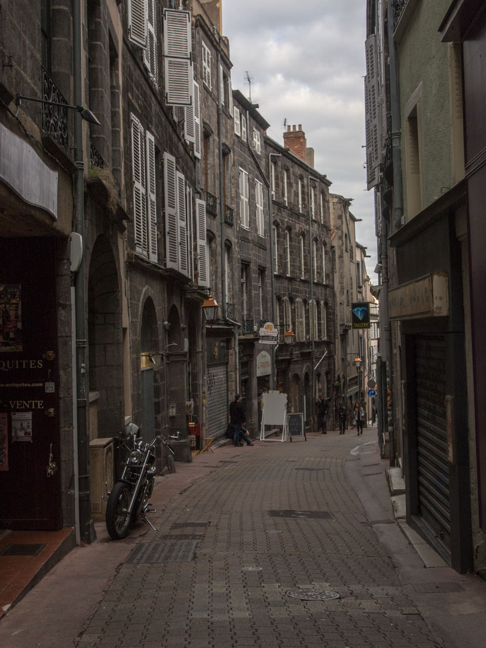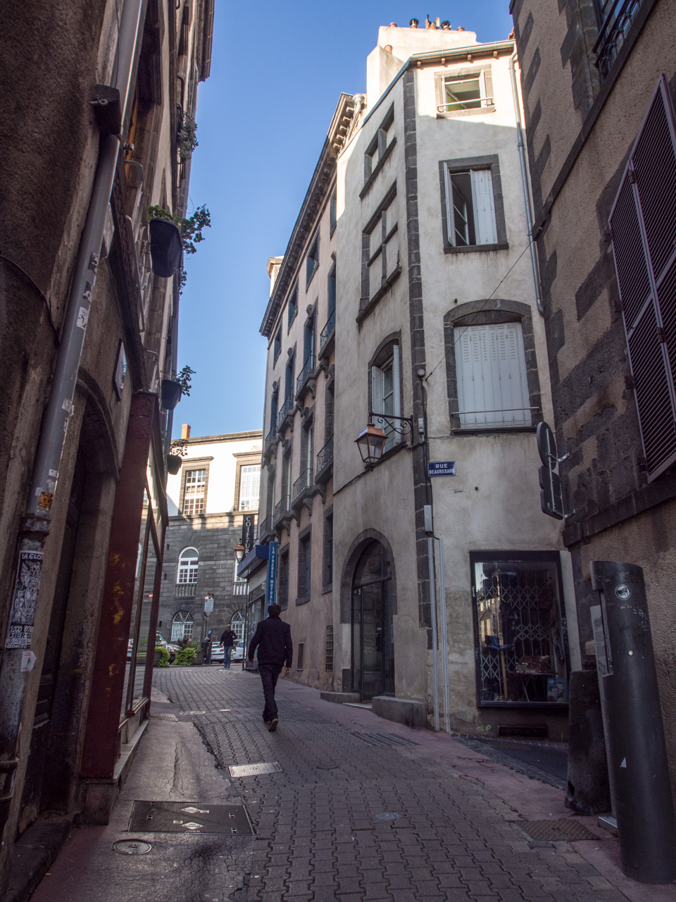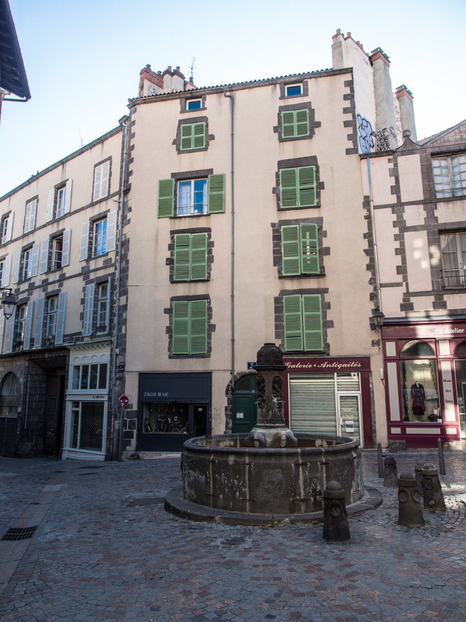 Pour visiter la ville, il faut un peu de bonnes jambes. Le centre-ville est située sur une butte, qu’il faut gravir à partir de mon hôtel, le Best Western Hôtel des Puys, avant de redescendre et au sommet de la butte, la Cathédrale qui règne au dessus de tout çà. Pour la rejoindre, il faudra emprunter la rue du Port. une jolie rue pentue bordée de maisons anciennes et c’est là qu’on fait connaissance avec ce qui donne le cachet de la vieille ville de Clermont-Ferrand : la pierre de Volvic, une pierre volcanique qui devient complètement noire une fois exposée aux éléments. Quelques fois, elle est utilisée pour de la décoration, ou en détails comme des pierres d’angles ou des frontispices. Quelque fois, elle est utilisée pour construire un bâtiment entier. Ça donne un côté graphique à la vieille ville, le noir tranchant sur du blanc, du jaune ou du vieux rose. Ça procure aussi une drôle de lumière à la ville, plus sombre, plus mystérieuse… sans celà, les petites rues ressembleraient fort à celles d’une ville italienne. Et il fait bon s’y perdre. Cette butte, c’est quasi un village ! La rue du Port et ses environs, c’est le royaume des antiquaires. Les chineurs deviendront littéralement fous en y découvrant les boutiques.