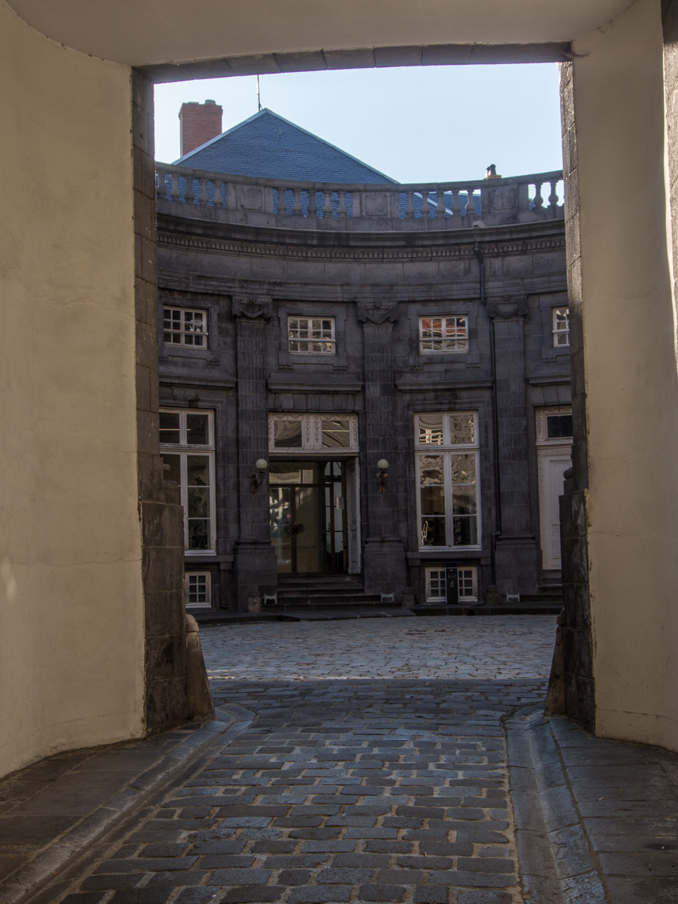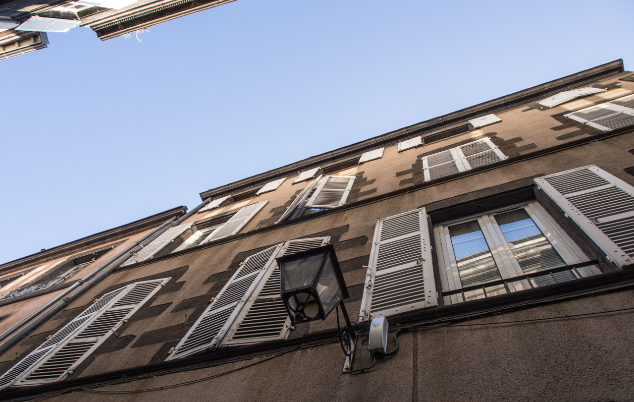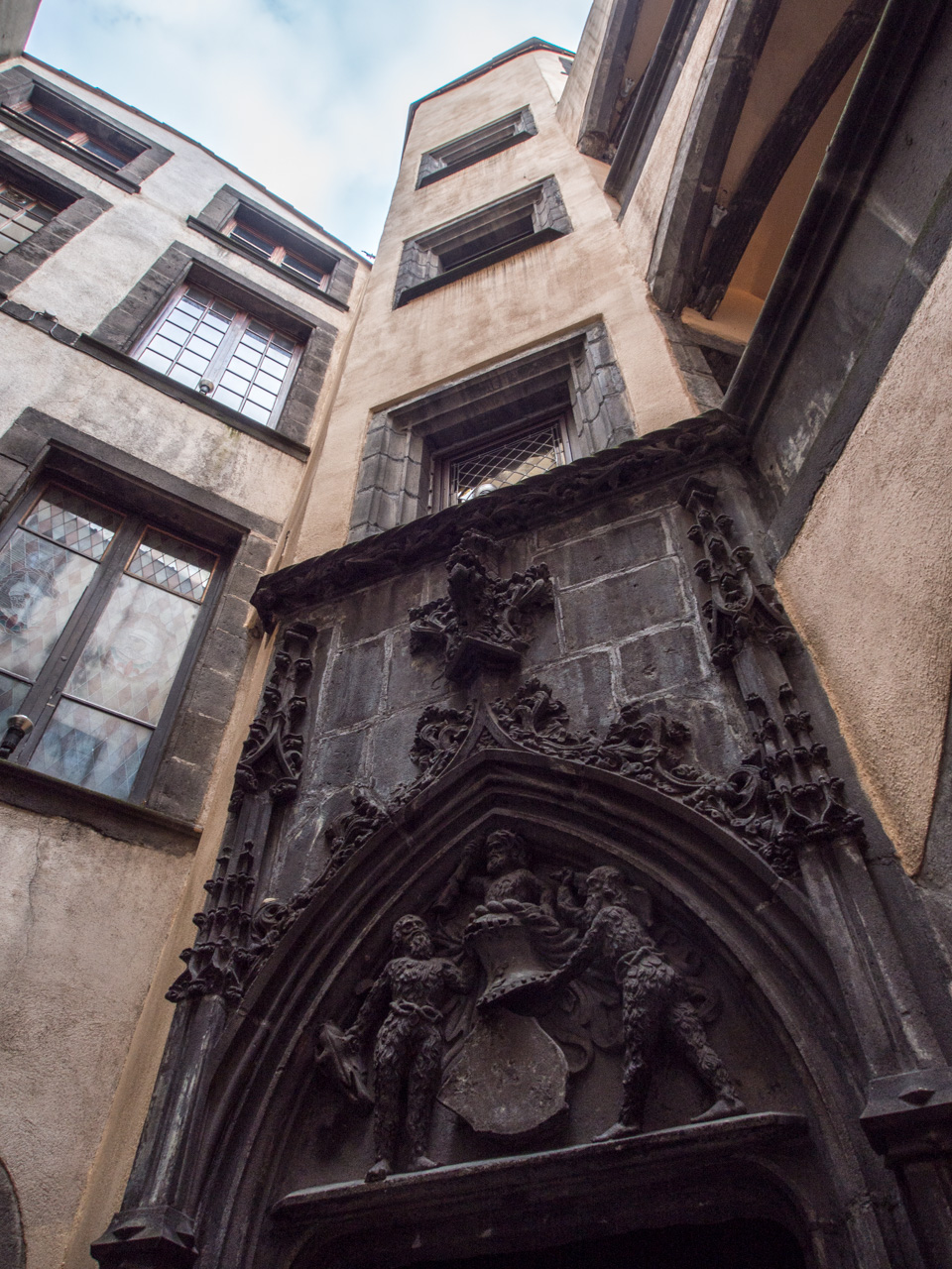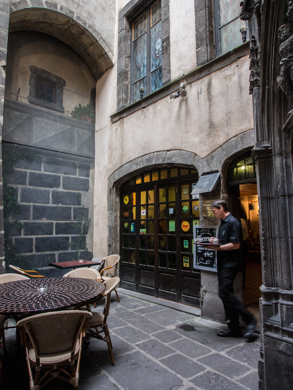 Pour visiter la ville, il faut un peu de bonnes jambes. Le centre-ville est située sur une butte, qu’il faut gravir à partir de mon hôtel, le Best Western Hôtel des Puys, avant de redescendre et au sommet de la butte, la Cathédrale qui règne au dessus de tout çà. Pour la rejoindre, il faudra emprunter la rue du Port. une jolie rue pentue bordée de maisons anciennes et c’est là qu’on fait connaissance avec ce qui donne le cachet de la vieille ville de Clermont-Ferrand : la pierre de Volvic, une pierre volcanique qui devient complètement noire une fois exposée aux éléments. Quelques fois, elle est utilisée pour de la décoration, ou en détails comme des pierres d’angles ou des frontispices. Quelque fois, elle est utilisée pour construire un bâtiment entier. Ça donne un côté graphique à la vieille ville, le noir tranchant sur du blanc, du jaune ou du vieux rose. Ça procure aussi une drôle de lumière à la ville, plus sombre, plus mystérieuse… sans celà, les petites rues ressembleraient fort à celles d’une ville italienne. Et il fait bon s’y perdre. Cette butte, c’est quasi un village ! La rue du Port et ses environs, c’est le royaume des antiquaires. Les chineurs deviendront littéralement fous en y découvrant les boutiques.