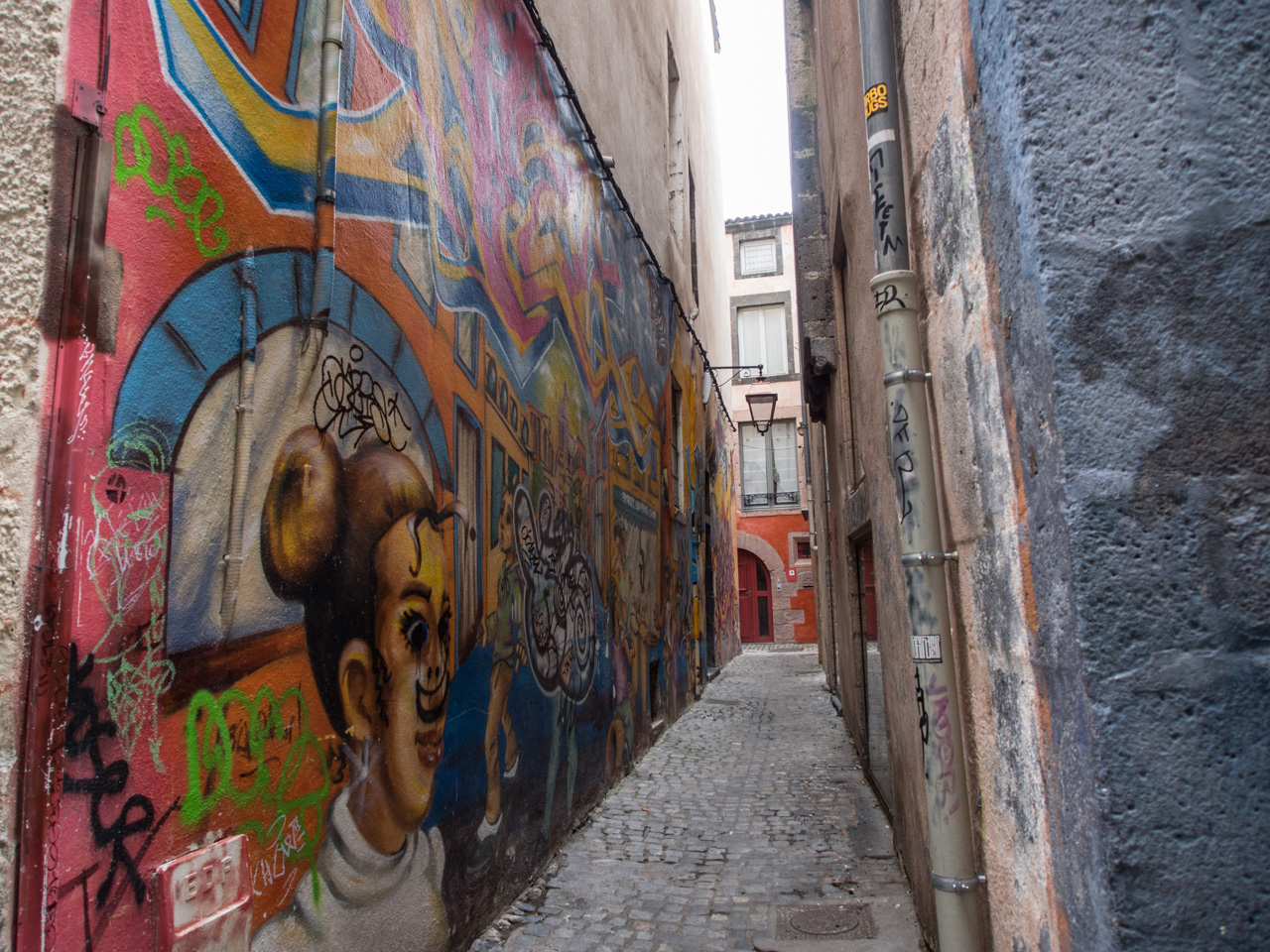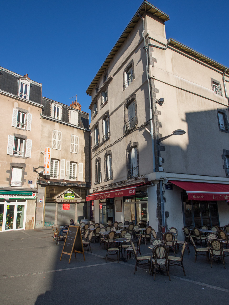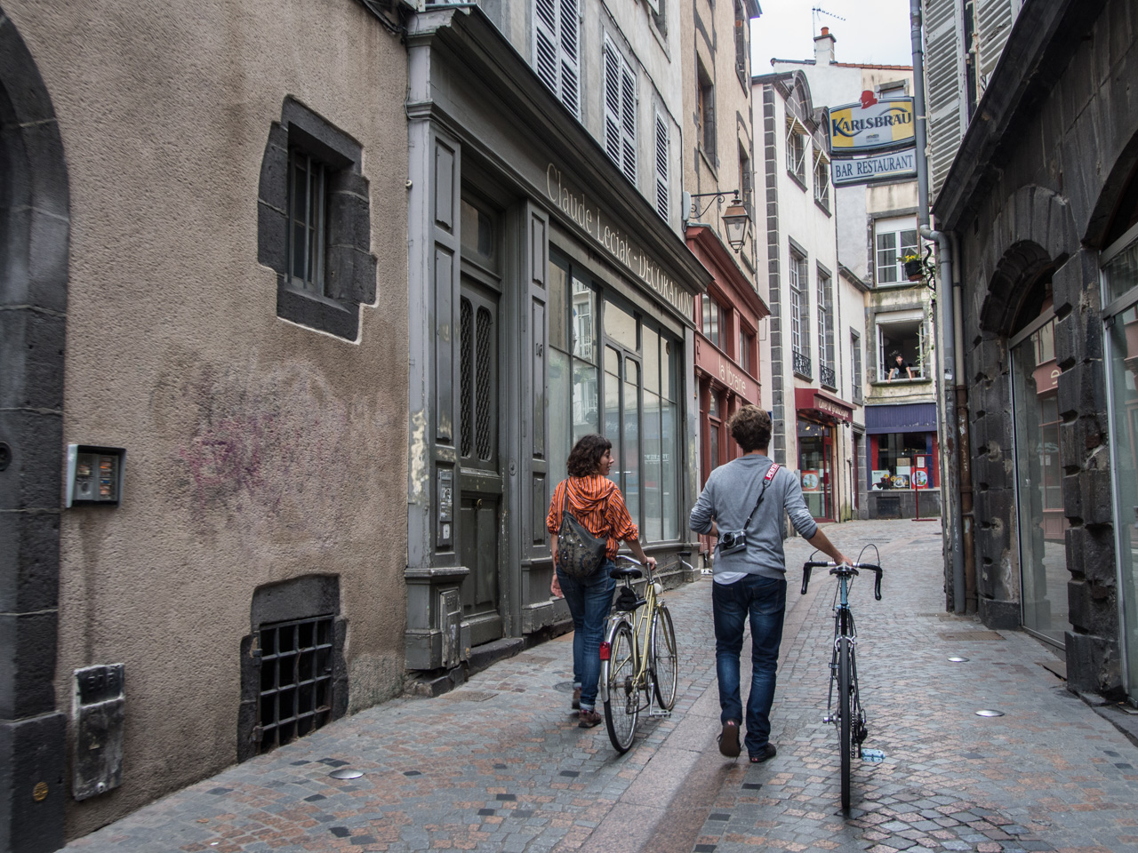 Retour vers la Cathédrale, de là, nous redescendons via la rue des Gras, une rue qui commence en escalier et offre le plus joli point de vue sur la cathédrale. Après les ruelles et impasses de l’autre côté de la butte, la rue des Gras a l’air immense. C’est ici que les accros du shopping commenceront à saliver. En bas de la butte, on trouve la Place de Jaude, un énorme espace public qui est un peu devenu le cœur battant de Clermont : restaurants, centre commercial, bar et le fameux opéra-théâtre qui en impose la nuit ! Car Clermont-Ferrand bouge pas mal la nuit. Ville étudiante, ses bars bruissent toutes la semaine entre chopes et concerts de groupes en devenir. Il suffit de regarder un peu les gens qui passent pour se rendre compte de la proportion de jeunes adultes qui habitent ici.
