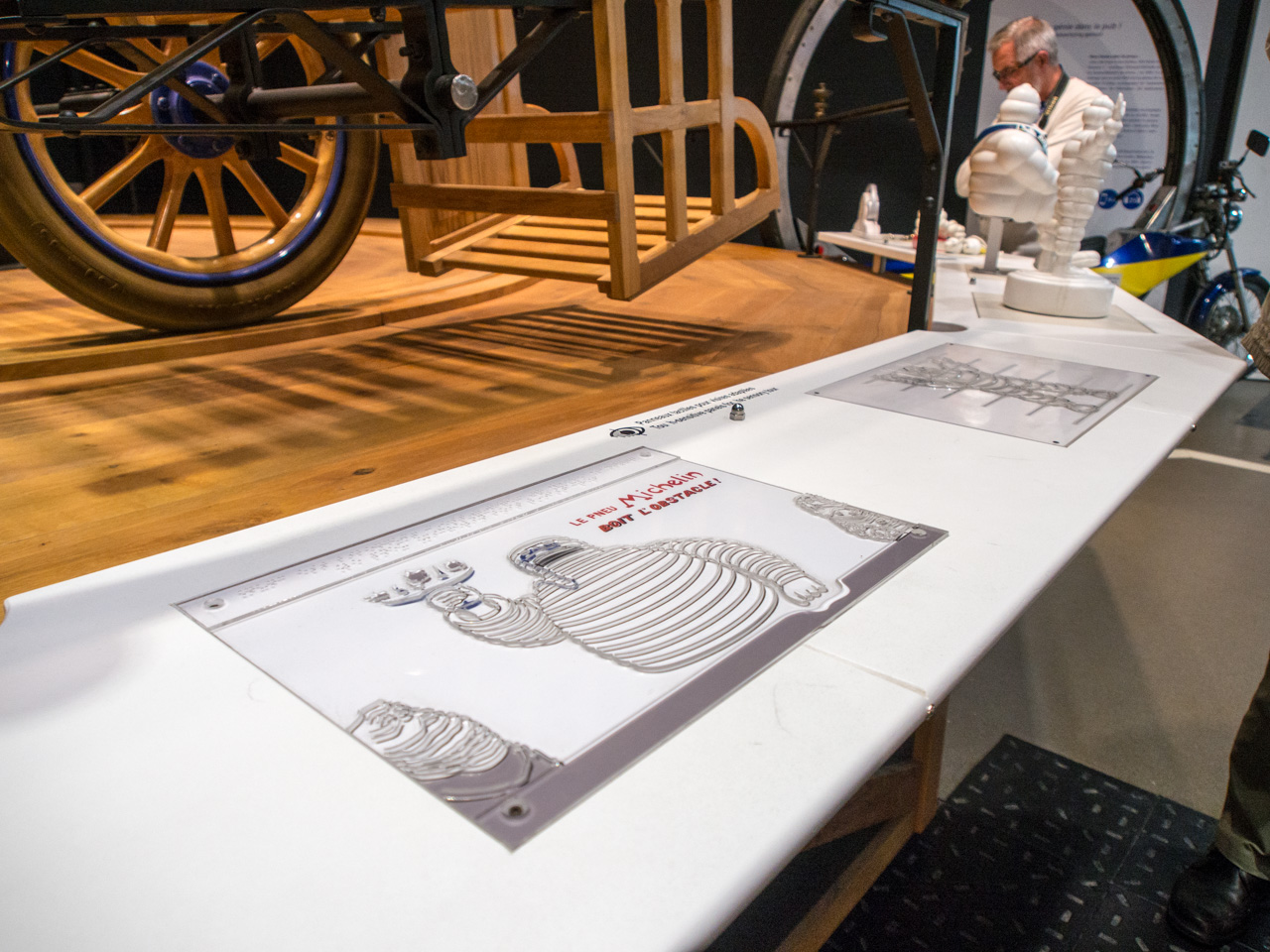 Pour la visite, vous avez le choix : vous suivez les panneaux, ou vous louez soit un audio-guide, soit un guide multimédia ou encore, vous pouvez télécharger la même app que le guide multimédia sur votre smartphone (n’oubliez pas vos écouteurs). Le wi-fi est accessible partout dans le musée, ça aide. Et c’est parti pour la visite ! Comme tous les musées, il y a différentes salles, se déclinant à la fois chronologiquement (la création du pneu, la construction de la société Michelin, son évolution et son avenir) ou par thème (Bibendum, Michelin et son personnel…) sauf que tout ce qui exposé est à la gloire d’une seule marque. Ca me fait un peu bizarre, j’ai l’impression qu’on essaie de me vendre quelque chose par la force MAIS, il faut le noter, Clermont-Ferrand a vécu Michelin pendant des années. La société construisait des logements pour ses employés, avait créé mutuelles et bourses, il y avait des clubs, une vie sociale « Michelin ». Des générations de Clermontois ont eu leur avenir et ceux de leurs enfants assurés par cette compagnie et si on veut comprendre Clermont-Ferrand, ce musée est immanquable. Mes salles préférées ? L’immense hall consacré à Bibendum, l’homme-sandwich de la marque depuis ses débuts. Avec la démocratisation de l’automobile, Bibendum a laissé tomber le monocle et a donné quelques affiches qui sont restées dans l’histoire de la publicité.