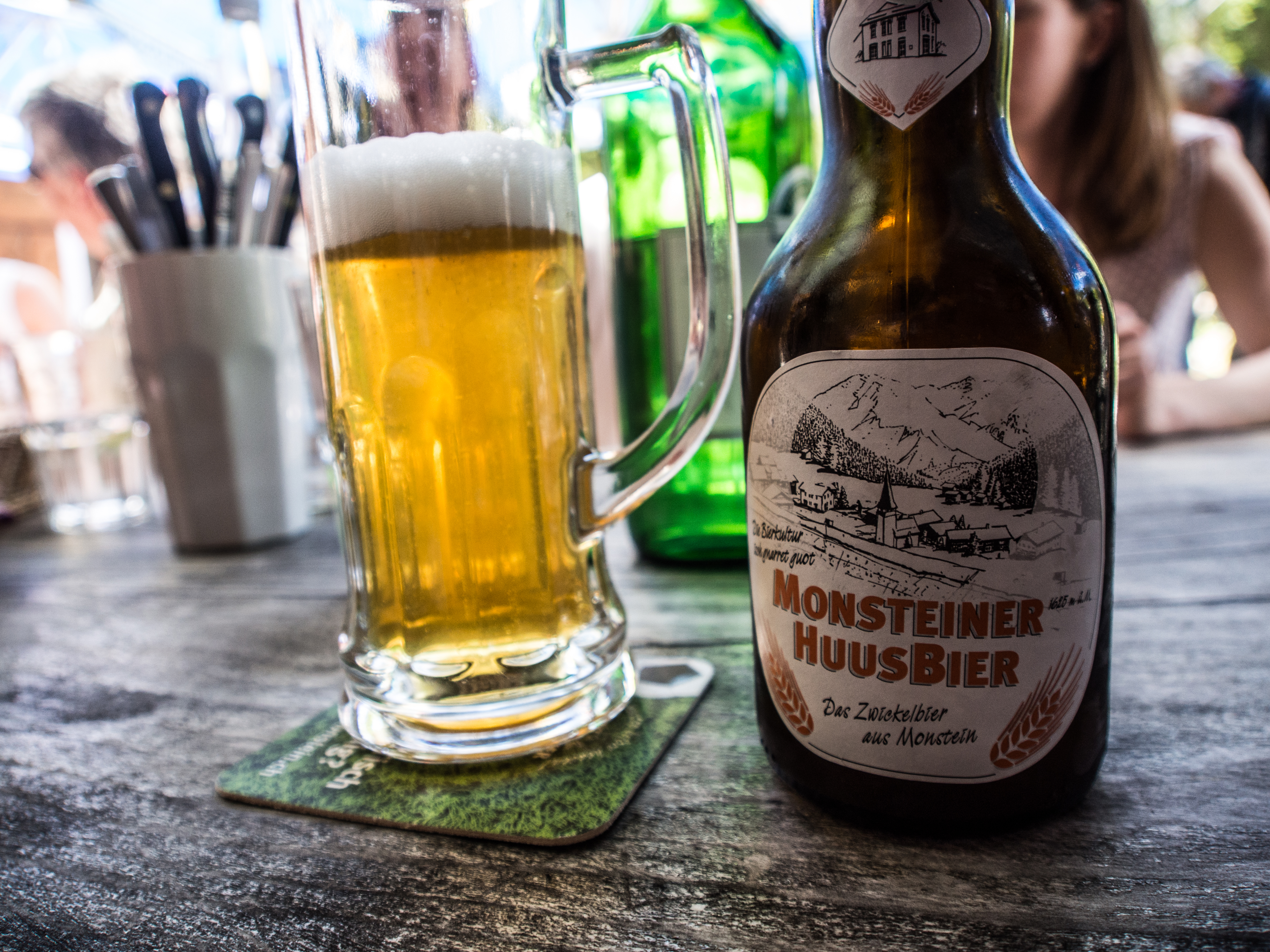 Caché dans un petit bois pas très loin du lac de Davos est l'endroit idéal pour s'éclater en famille. En tout cas, j'y ai vu pas d'enfants et d'ados en bande venus tester l'accrobranche et tyrolienne mais avant tout de chose : on a faim et c'est au snack de la base de loisirs qu'on va manger, à la bonne franquette : ce sera frites-saucisses. Que la gastronomie tessinoise aux doux accents italiens me semble loin ! Mais les frites parsemées de paprika sont bonnes et je ne crache jamais sur une bonne saucisse, surtout quand mes dents raient le parquet en bois du snack. Et alors que la majorité du groupe est au soda ou à l'eau pétillante, je ne peux m'empêcher de remarquer que les 3 Belges du groupe ont opté... pour la bière ! Après tout, nous sommes là pour tester les spécialités locales, et la Monsteiner Huusbier en fait partie.