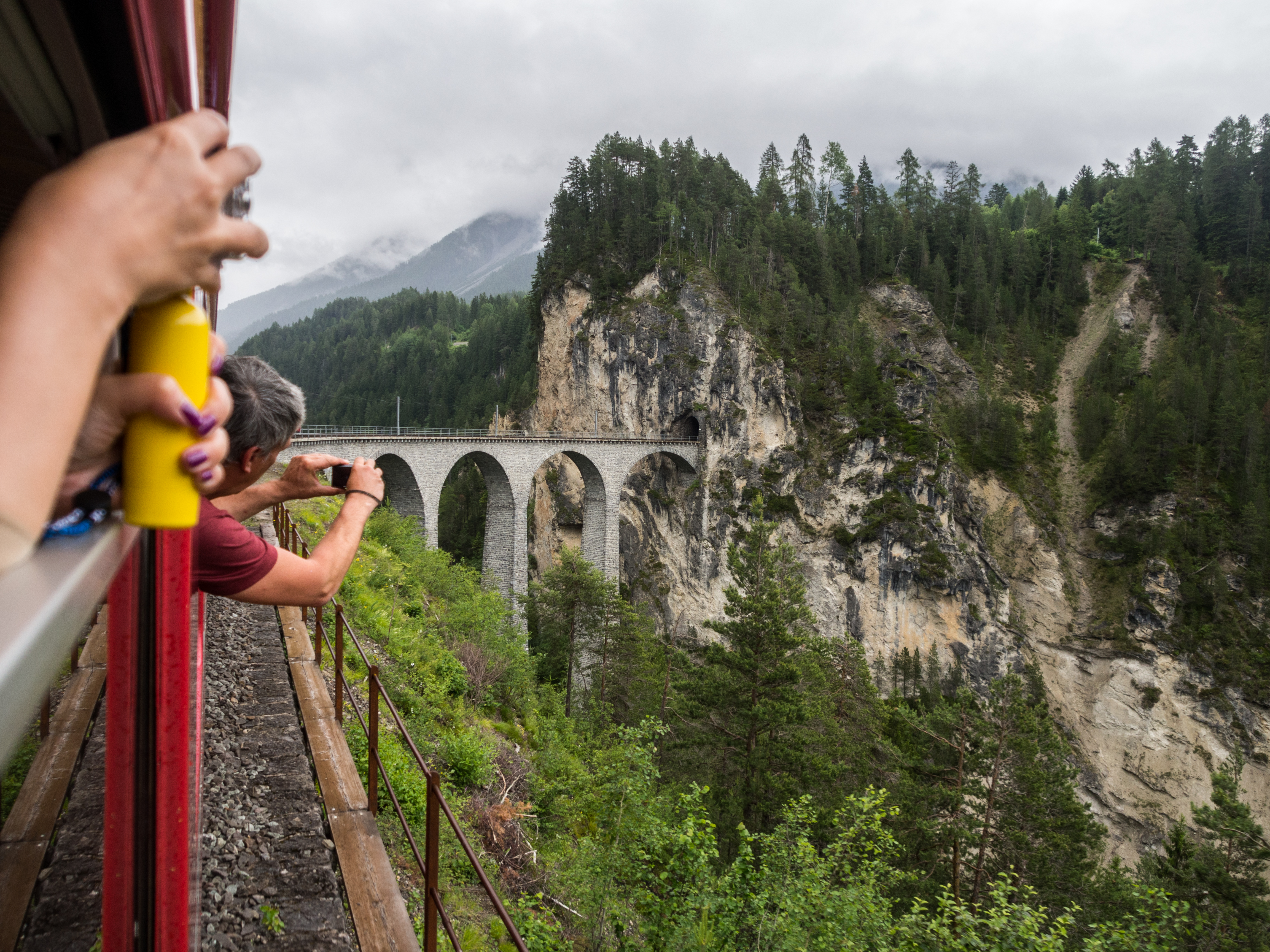 A Thusis, j'embarque dans un train, direction Fillisur. Ce ne sont pas les chemins de fer fédéraux suisses mais la Rhättische Bahn, les chemins de fer propres aux Grisons et là, je ne mets pas les pieds n'importe où, mais sur la ligne de l'Albula, classée au Patrimoine mondial de l'UNECSO, tout comme l'autre grande ligne des Grisons : la Bernina. Un train spécial à fenêtres panoramiques, le Glacier Express, y passe mais pour le commun de voyageurs, un train régulier vous fait le même parcours. Et que dire ? Le paysage est enchanteur ! J'ai l'impression de me retrouver dans un livre d'image ! Les images de mes premiers souvenirs de passage en Suisse, quand j'avais 6 ans, déferlent de ma mémoire, venant se superposer aux nouveaux souvenirs que je suis en train de me faire.