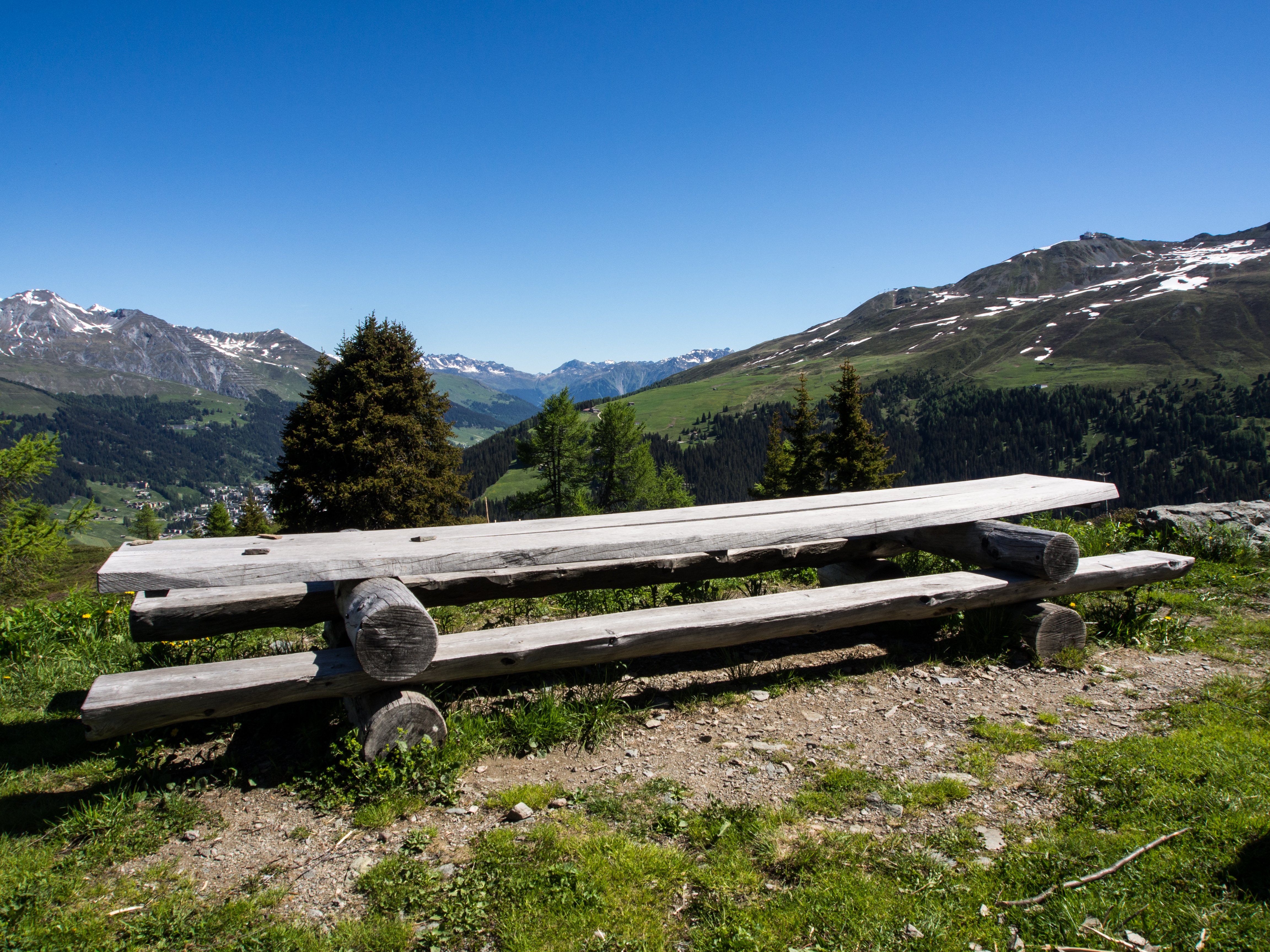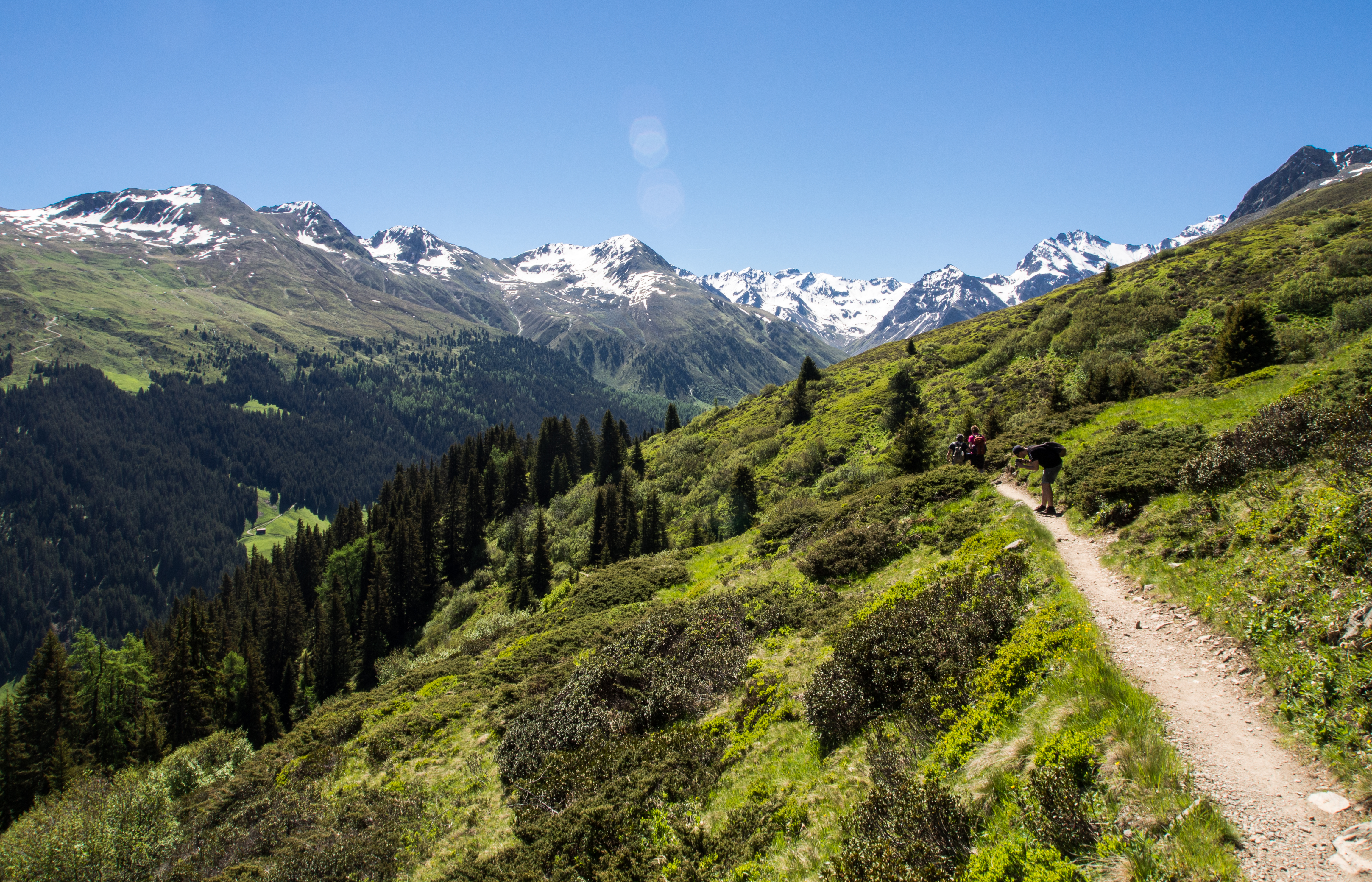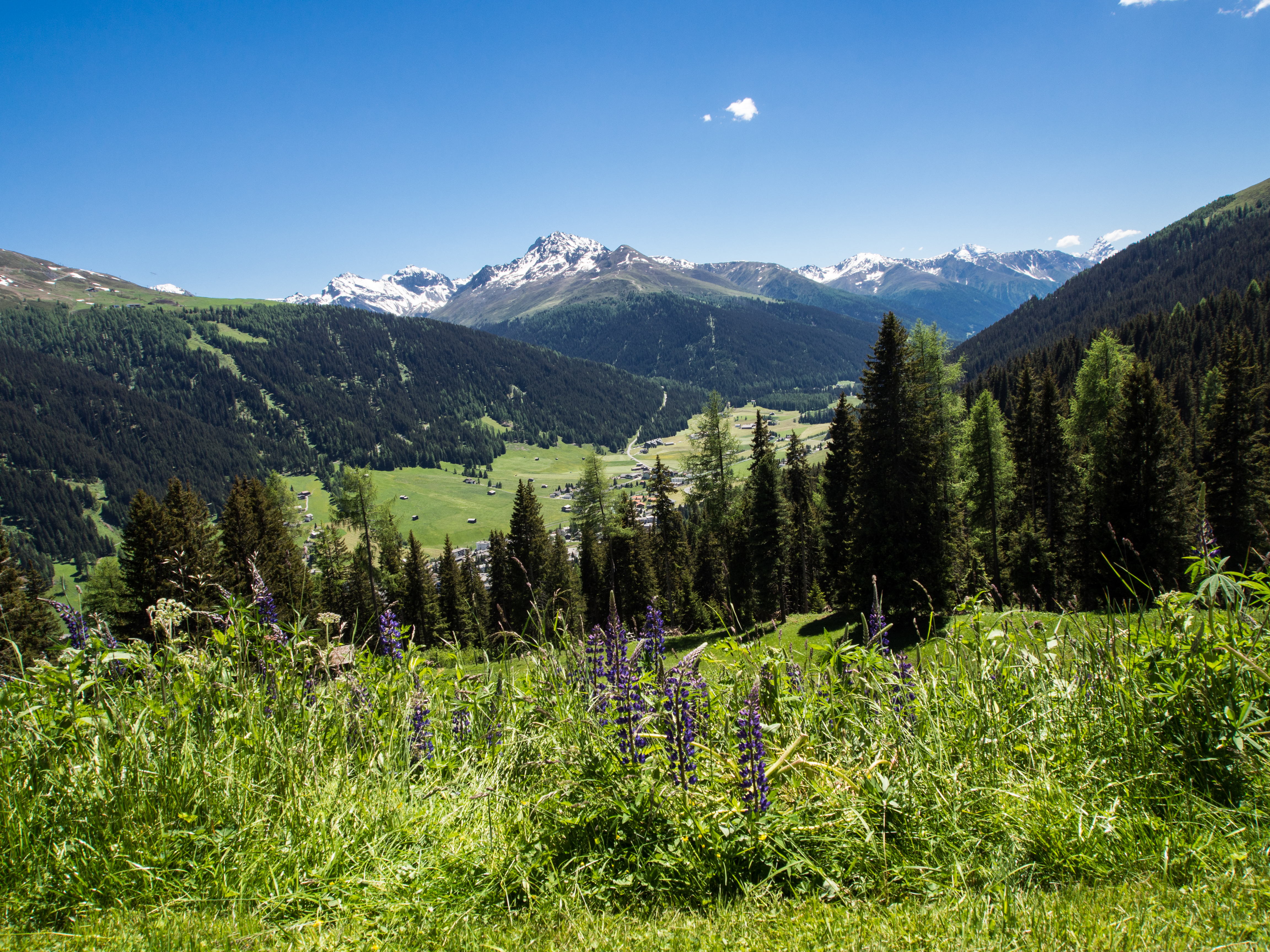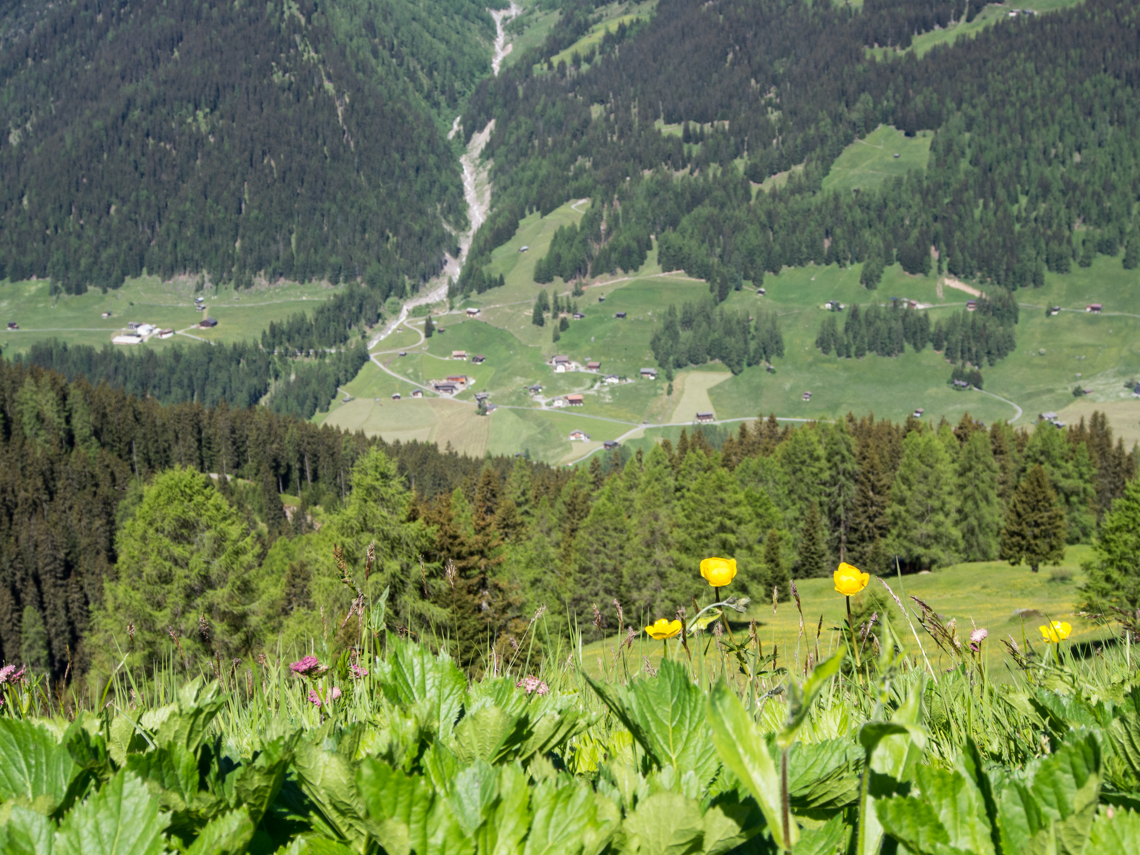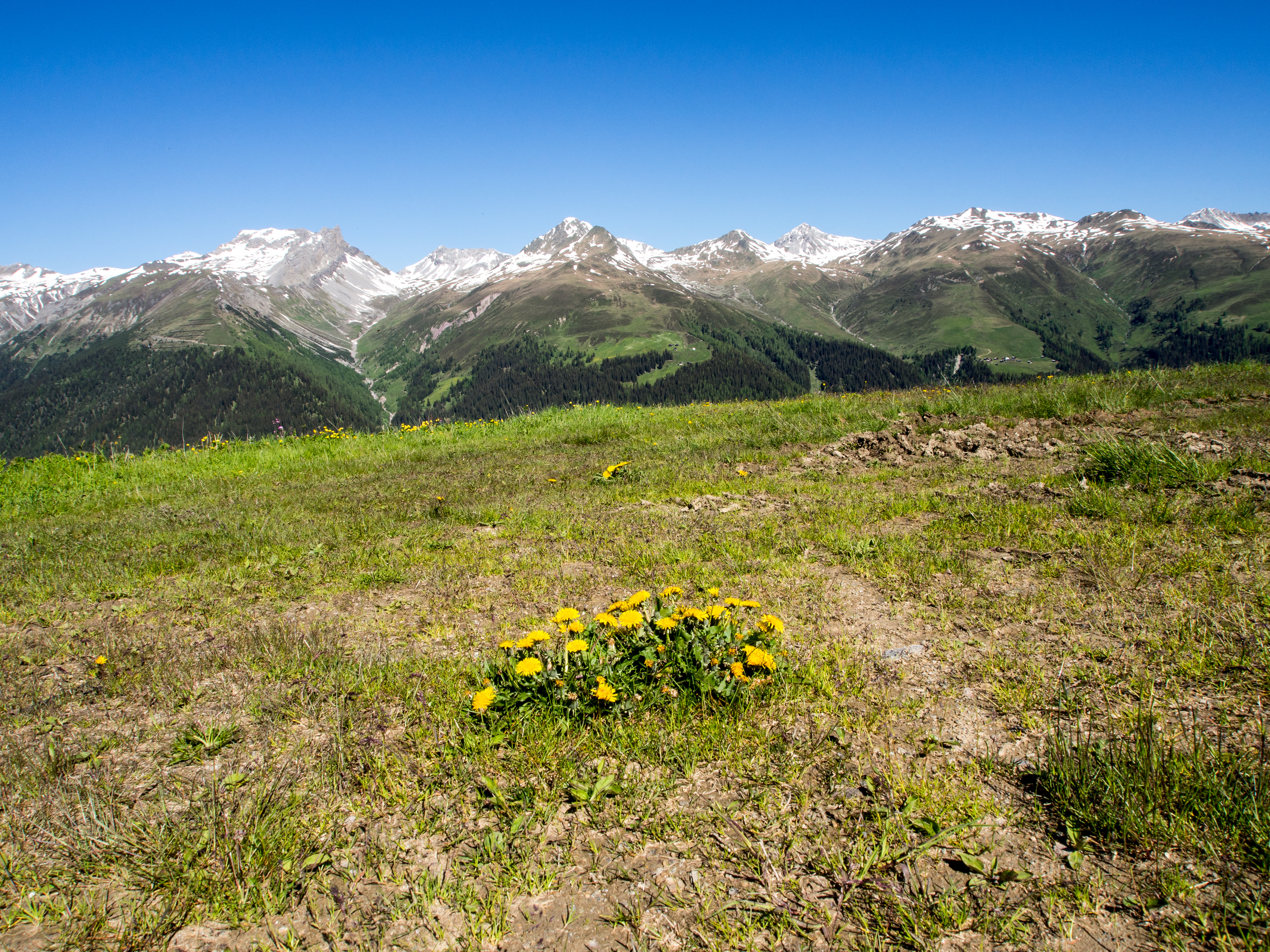 Le lendemain, après un solide petit-déjeuner, nous passons réceptionner notre lunch à emporter, et en petit cortège, nous allons prendre le bus avant de rejoindre la station de téléphérique de Rinerhorn (le tout compris dans la Davos Klosters Active Card). Une fois là haut, la vue est à couper le souffle : sur fond de ciel bleu pur, des montagnes couronnées de neige, des sapins vert foncé et des alpages vert tendre, parsemés de blanc, de jaune, de rose, de fuschia, de mauve et de bleu, les couleurs des milliers de fleurs de montagne : marguerite, renoncules, myosotis, gentianes ou roses des Alpes. C'est superbe, j'ai envie de gambader, de me rouler dans les fleurs, de yodeler et de chanter à tue-tête "Heidiiiii, Heeeeeeeidiiiiiii!" (les Grisons est le canton de la petite fille de l'Alpe). Pas le temps de s'arrêter dans la randonnée pour ça. Heureusement, elle est plutôt facile et pensée pour ceux qui ont envie de marcher, sans devoir trop faire d'effort. Le sentier fait le tour de la montagne avant de descendre vers la vallée. Dans les heures qui vont suivre, ce sera une succession de paysages à couper le souffle, à marcher entre prairie et petit bois de pins, avec de temps en temps des petits torrents à traverser. Pendant la marche, j'essaierai de "perdre" mes compagnons de randonnée pour profiter de toute cette magie. C'est un peu un plaisir coupable.