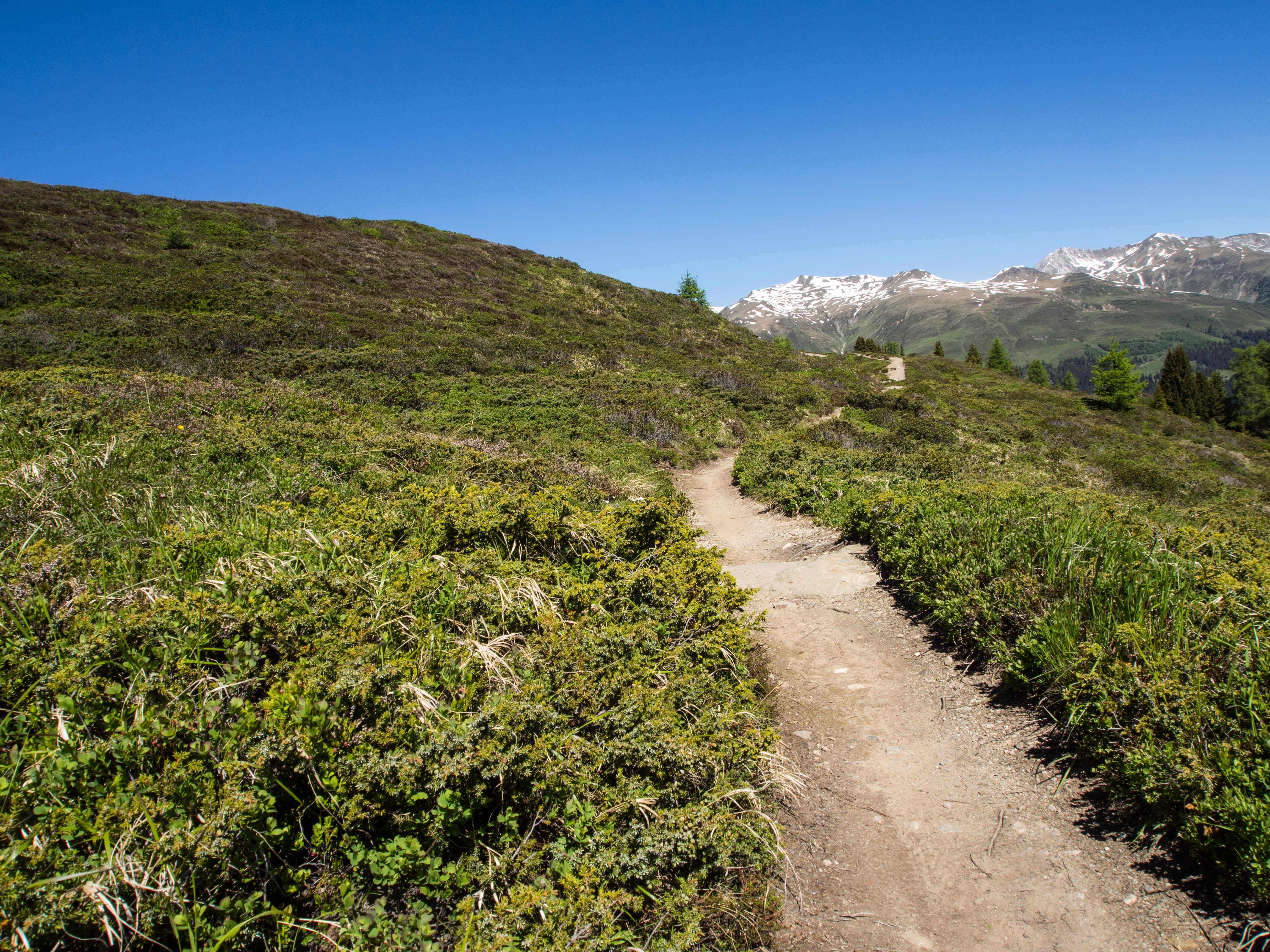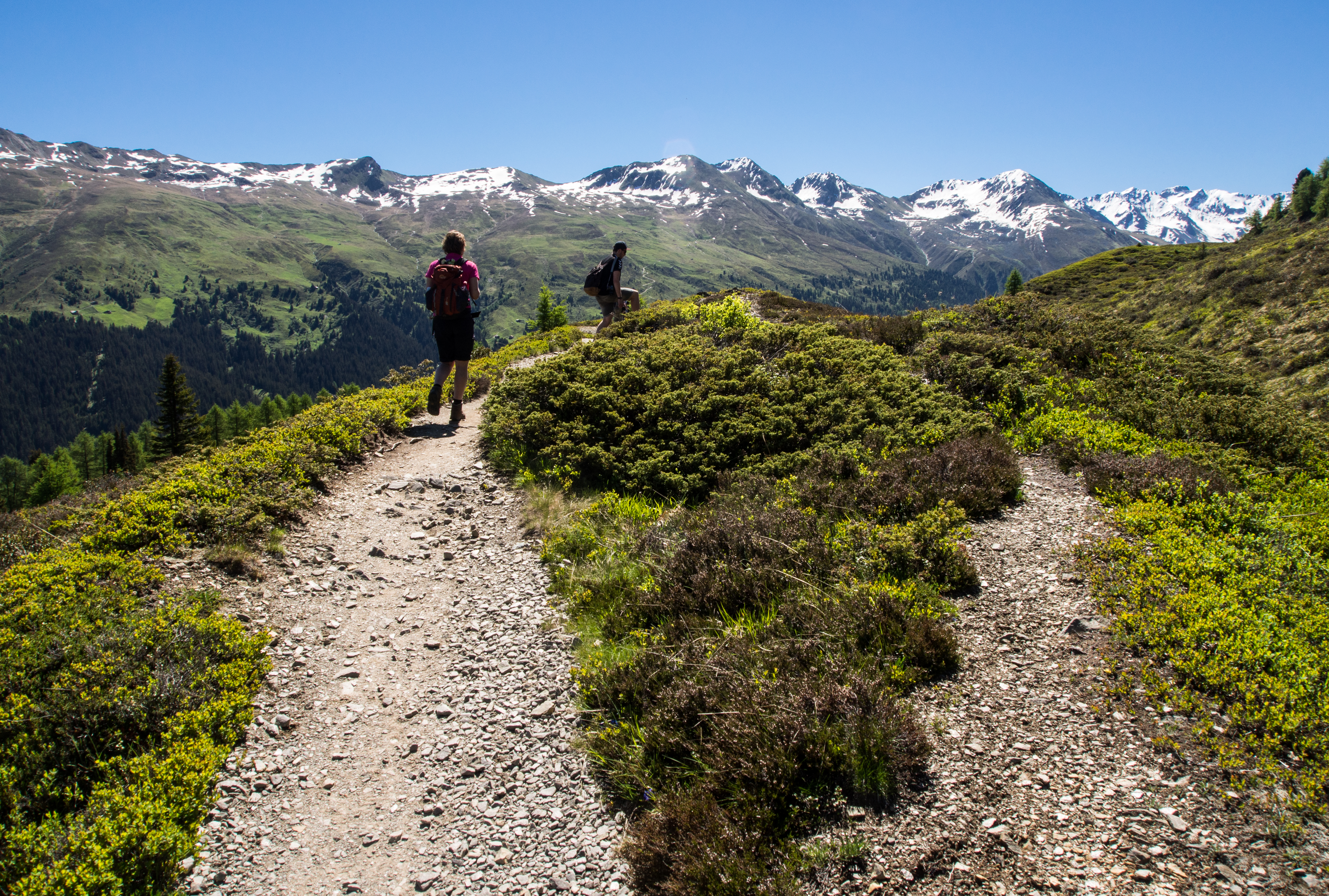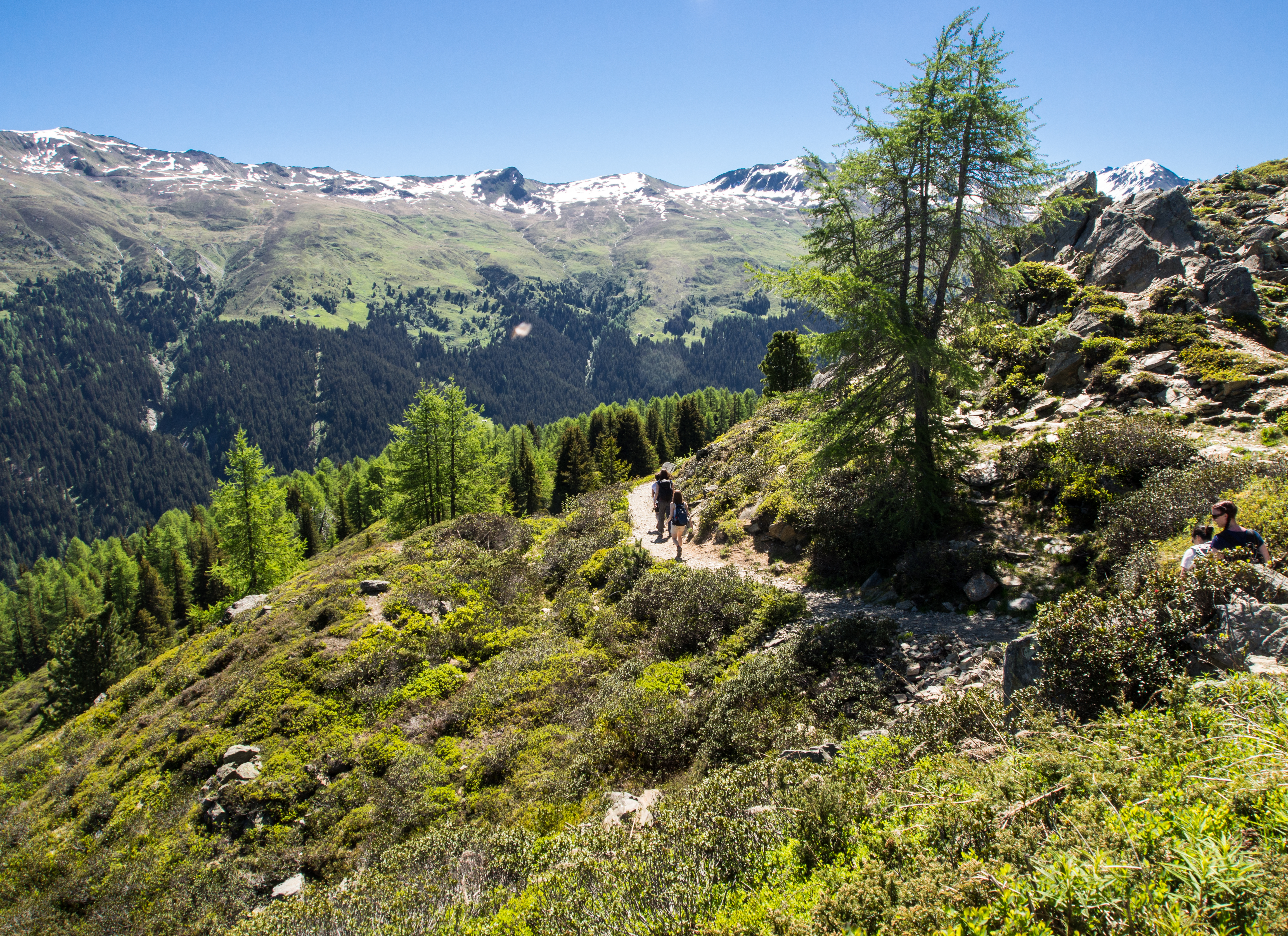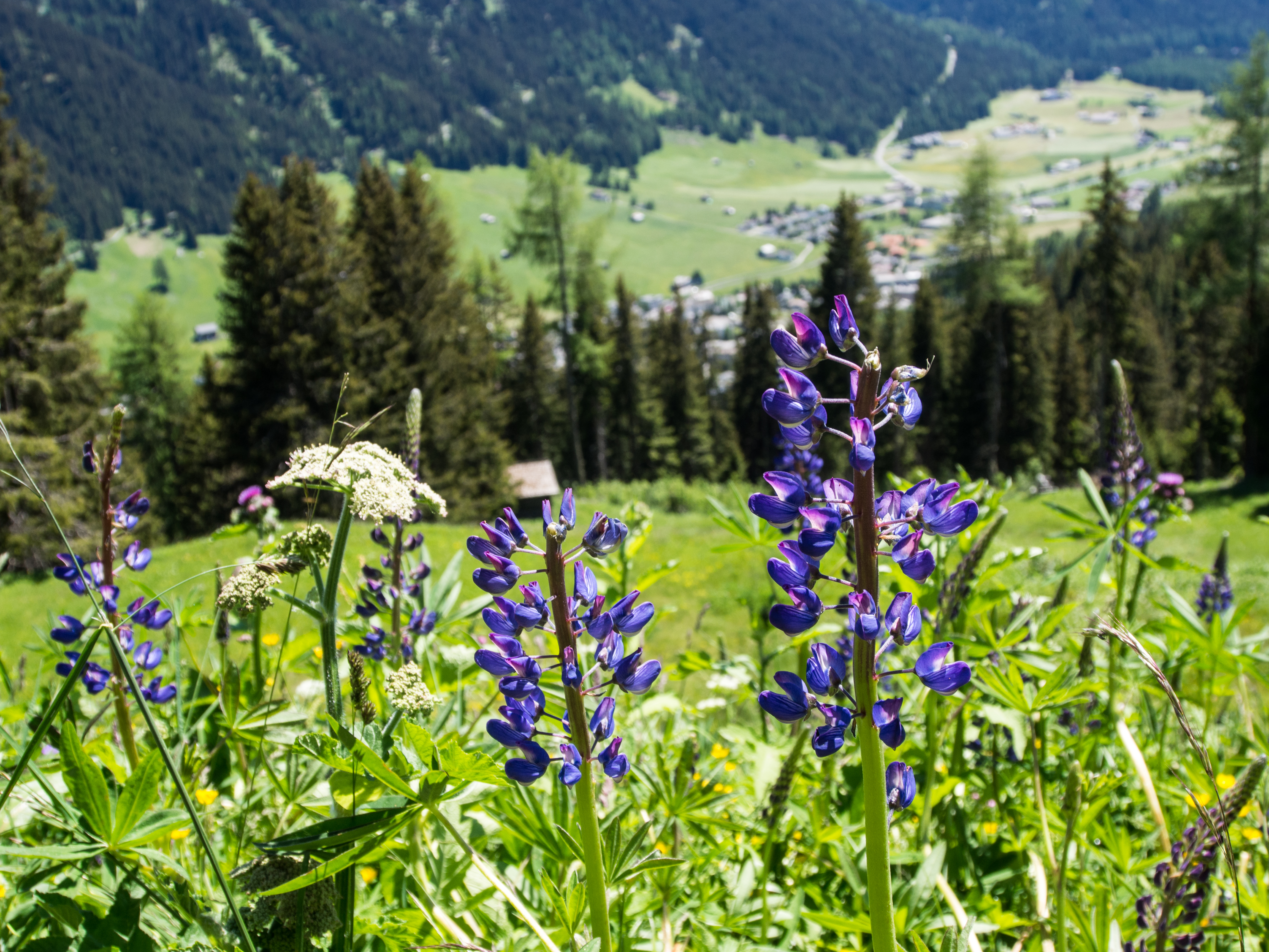 Le lendemain, après un solide petit-déjeuner, nous passons réceptionner notre lunch à emporter, et en petit cortège, nous allons prendre le bus avant de rejoindre la station de téléphérique de Rinerhorn (le tout compris dans la Davos Klosters Active Card). Une fois là haut, la vue est à couper le souffle : sur fond de ciel bleu pur, des montagnes couronnées de neige, des sapins vert foncé et des alpages vert tendre, parsemés de blanc, de jaune, de rose, de fuschia, de mauve et de bleu, les couleurs des milliers de fleurs de montagne : marguerite, renoncules, myosotis, gentianes ou roses des Alpes. C'est superbe, j'ai envie de gambader, de me rouler dans les fleurs, de yodeler et de chanter à tue-tête "Heidiiiii, Heeeeeeeidiiiiiii!" (les Grisons est le canton de la petite fille de l'Alpe). Pas le temps de s'arrêter dans la randonnée pour ça. Heureusement, elle est plutôt facile et pensée pour ceux qui ont envie de marcher, sans devoir trop faire d'effort. Le sentier fait le tour de la montagne avant de descendre vers la vallée. Dans les heures qui vont suivre, ce sera une succession de paysages à couper le souffle, à marcher entre prairie et petit bois de pins, avec de temps en temps des petits torrents à traverser. Pendant la marche, j'essaierai de "perdre" mes compagnons de randonnée pour profiter de toute cette magie. C'est un peu un plaisir coupable.