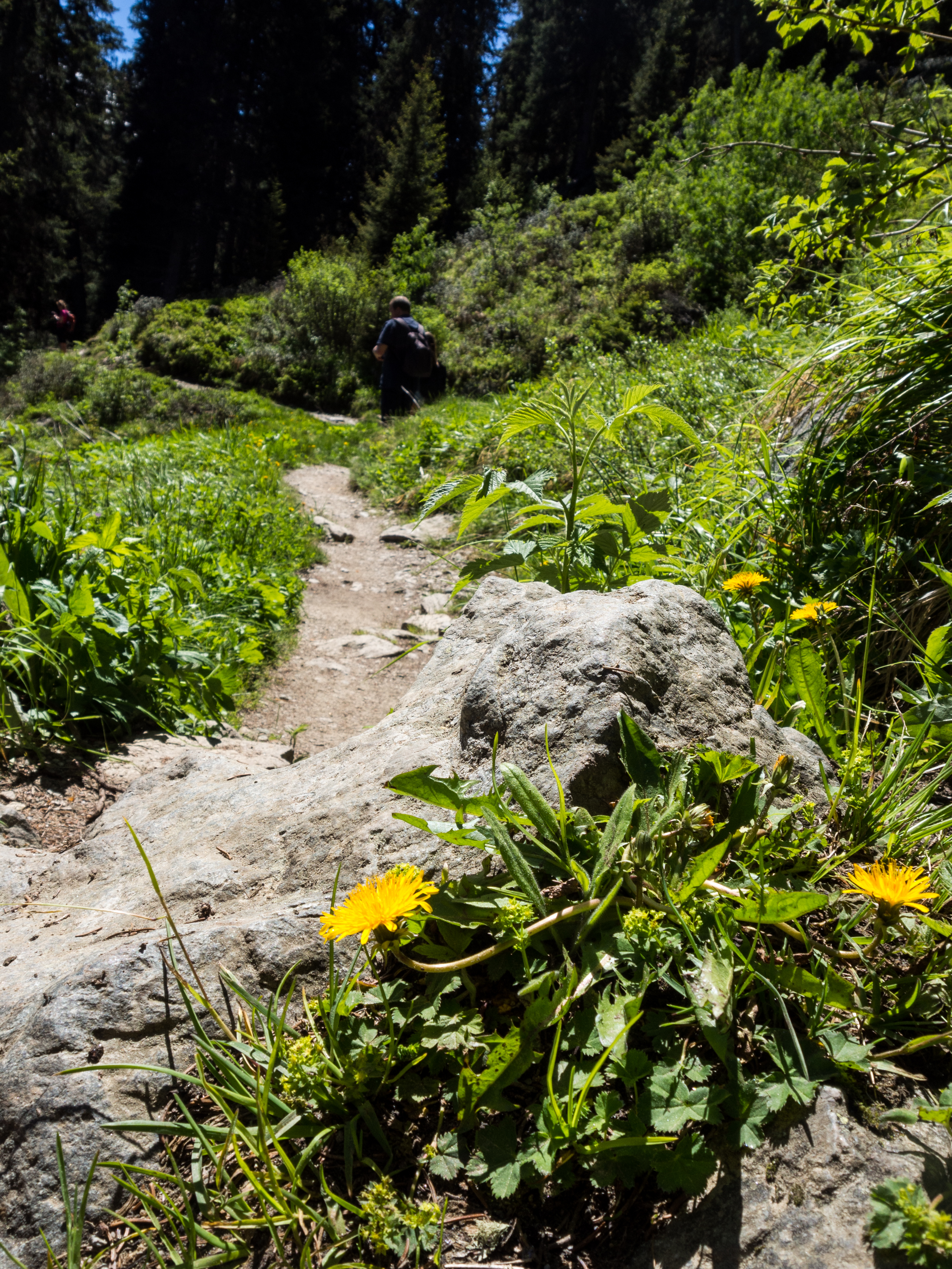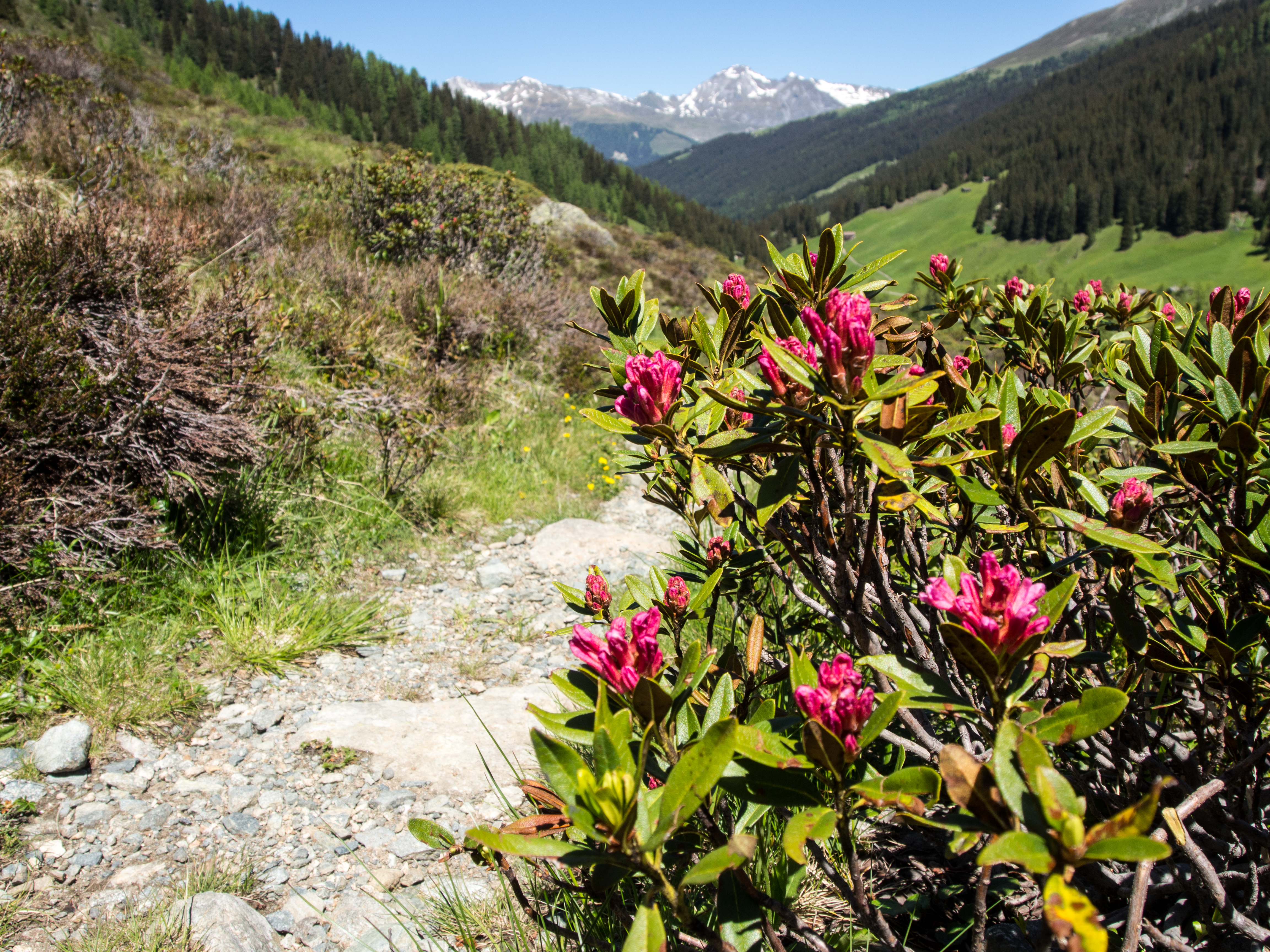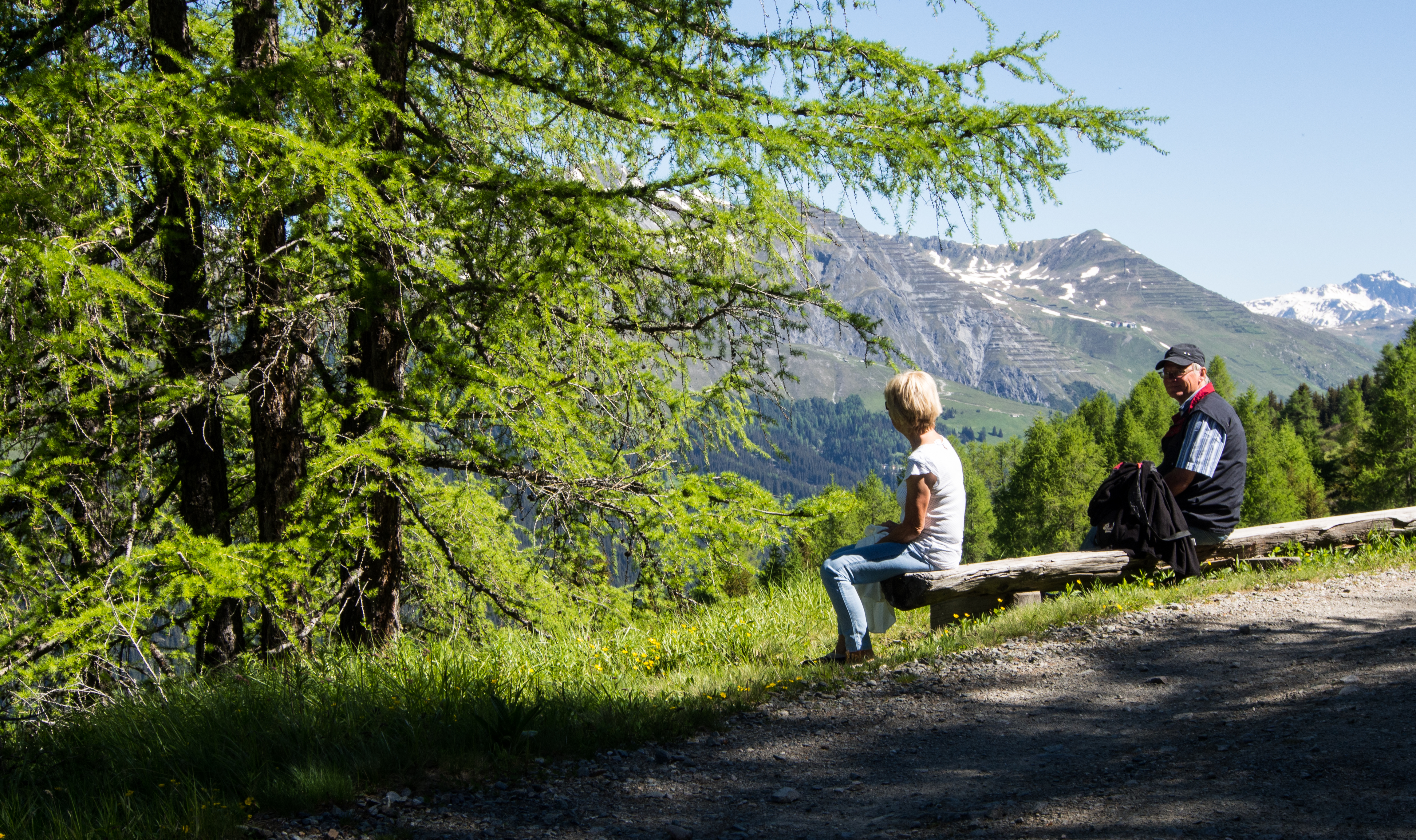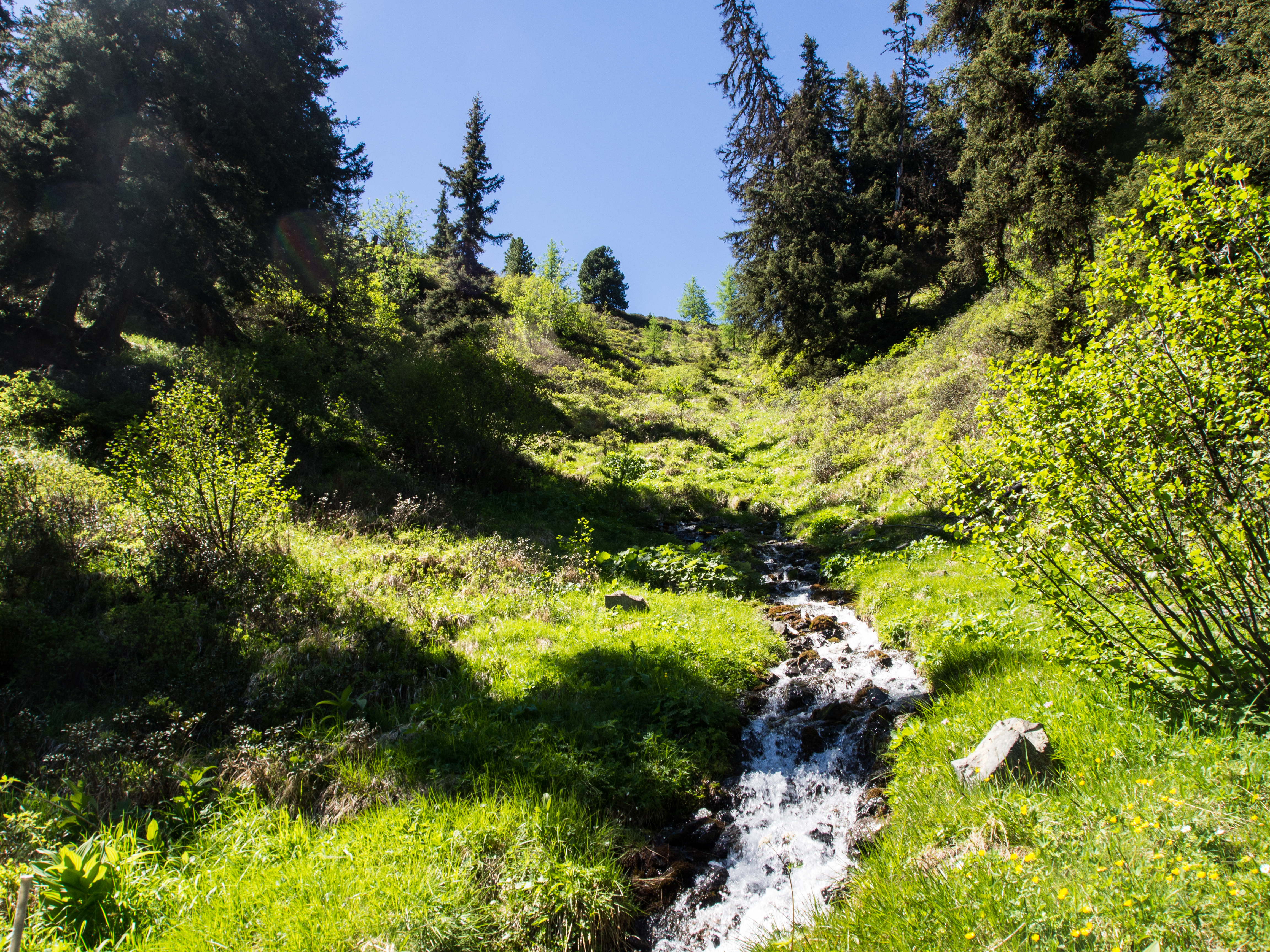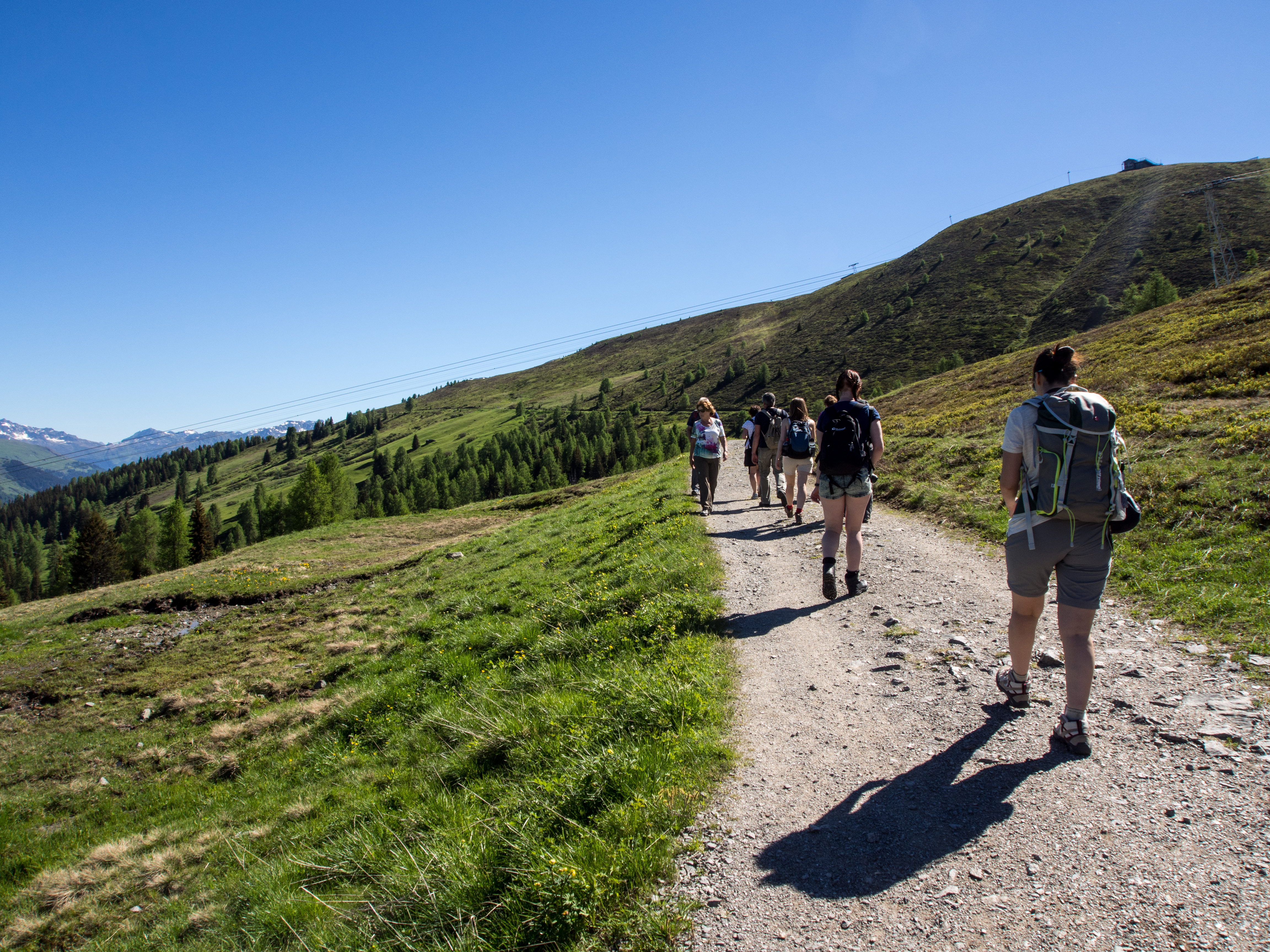 Le lendemain, après un solide petit-déjeuner, nous passons réceptionner notre lunch à emporter, et en petit cortège, nous allons prendre le bus avant de rejoindre la station de téléphérique de Rinerhorn (le tout compris dans la Davos Klosters Active Card). Une fois là haut, la vue est à couper le souffle : sur fond de ciel bleu pur, des montagnes couronnées de neige, des sapins vert foncé et des alpages vert tendre, parsemés de blanc, de jaune, de rose, de fuschia, de mauve et de bleu, les couleurs des milliers de fleurs de montagne : marguerite, renoncules, myosotis, gentianes ou roses des Alpes. C'est superbe, j'ai envie de gambader, de me rouler dans les fleurs, de yodeler et de chanter à tue-tête "Heidiiiii, Heeeeeeeidiiiiiii!" (les Grisons est le canton de la petite fille de l'Alpe). Pas le temps de s'arrêter dans la randonnée pour ça. Heureusement, elle est plutôt facile et pensée pour ceux qui ont envie de marcher, sans devoir trop faire d'effort. Le sentier fait le tour de la montagne avant de descendre vers la vallée. Dans les heures qui vont suivre, ce sera une succession de paysages à couper le souffle, à marcher entre prairie et petit bois de pins, avec de temps en temps des petits torrents à traverser. Pendant la marche, j'essaierai de "perdre" mes compagnons de randonnée pour profiter de toute cette magie. C'est un peu un plaisir coupable.