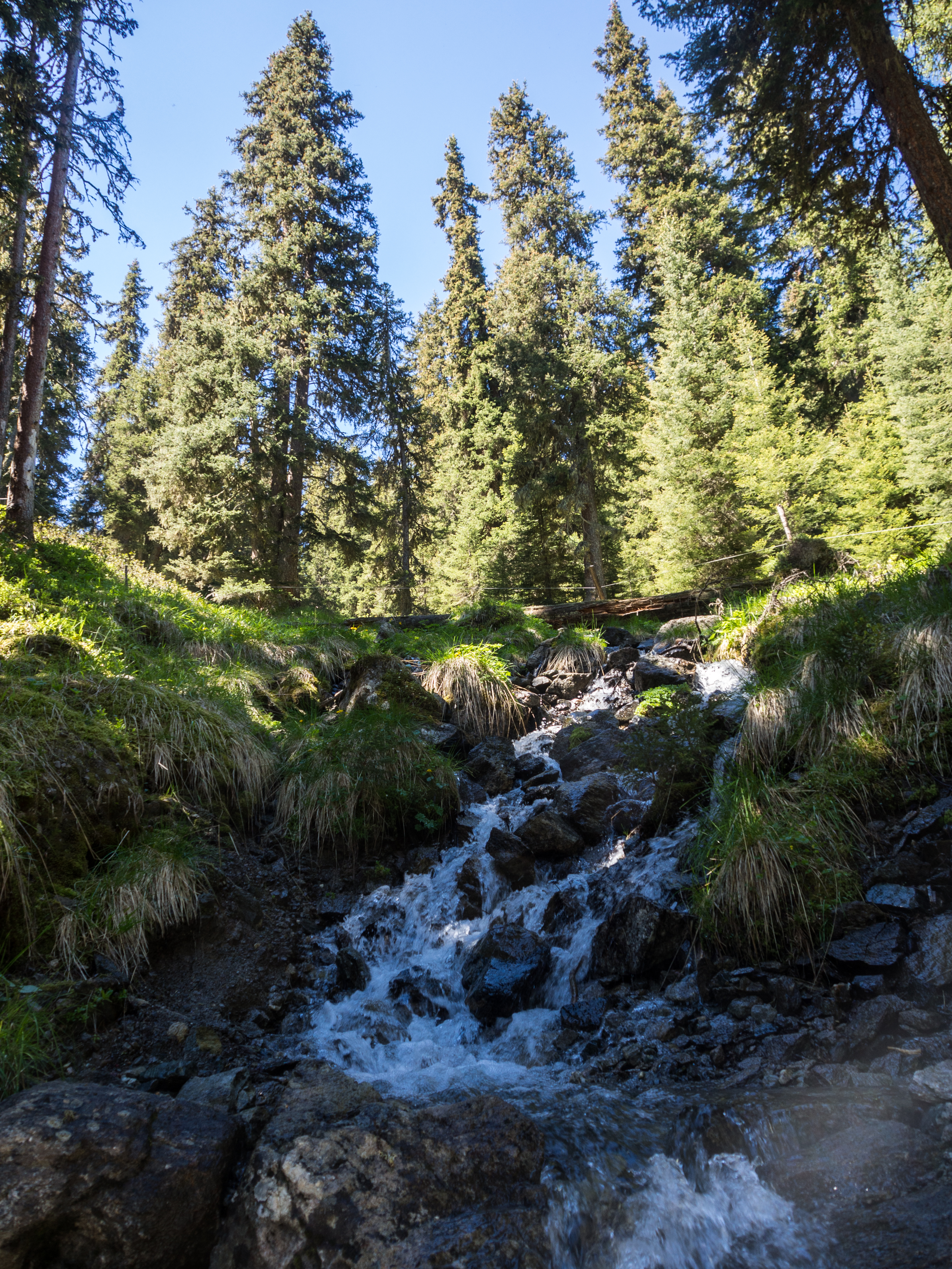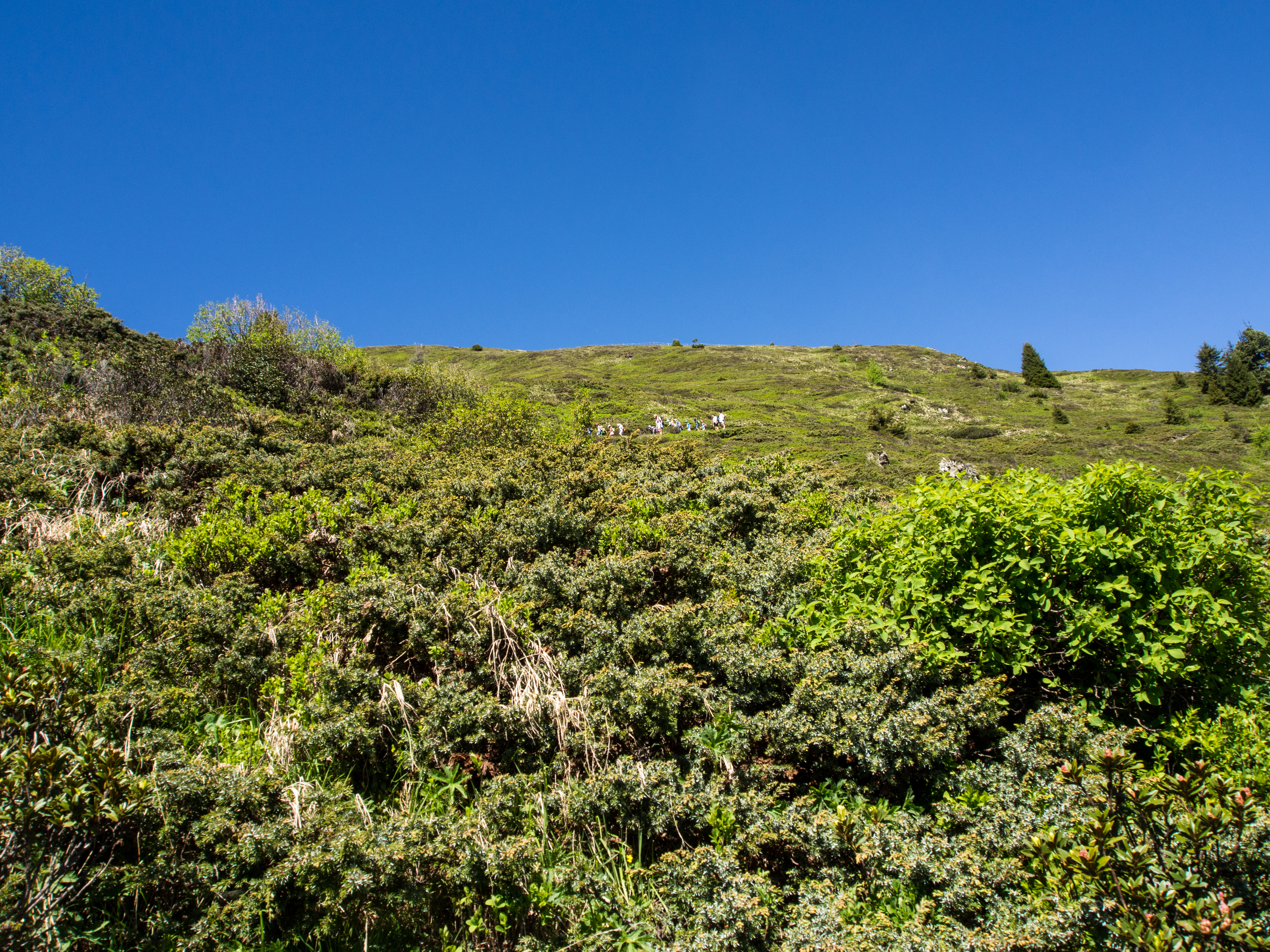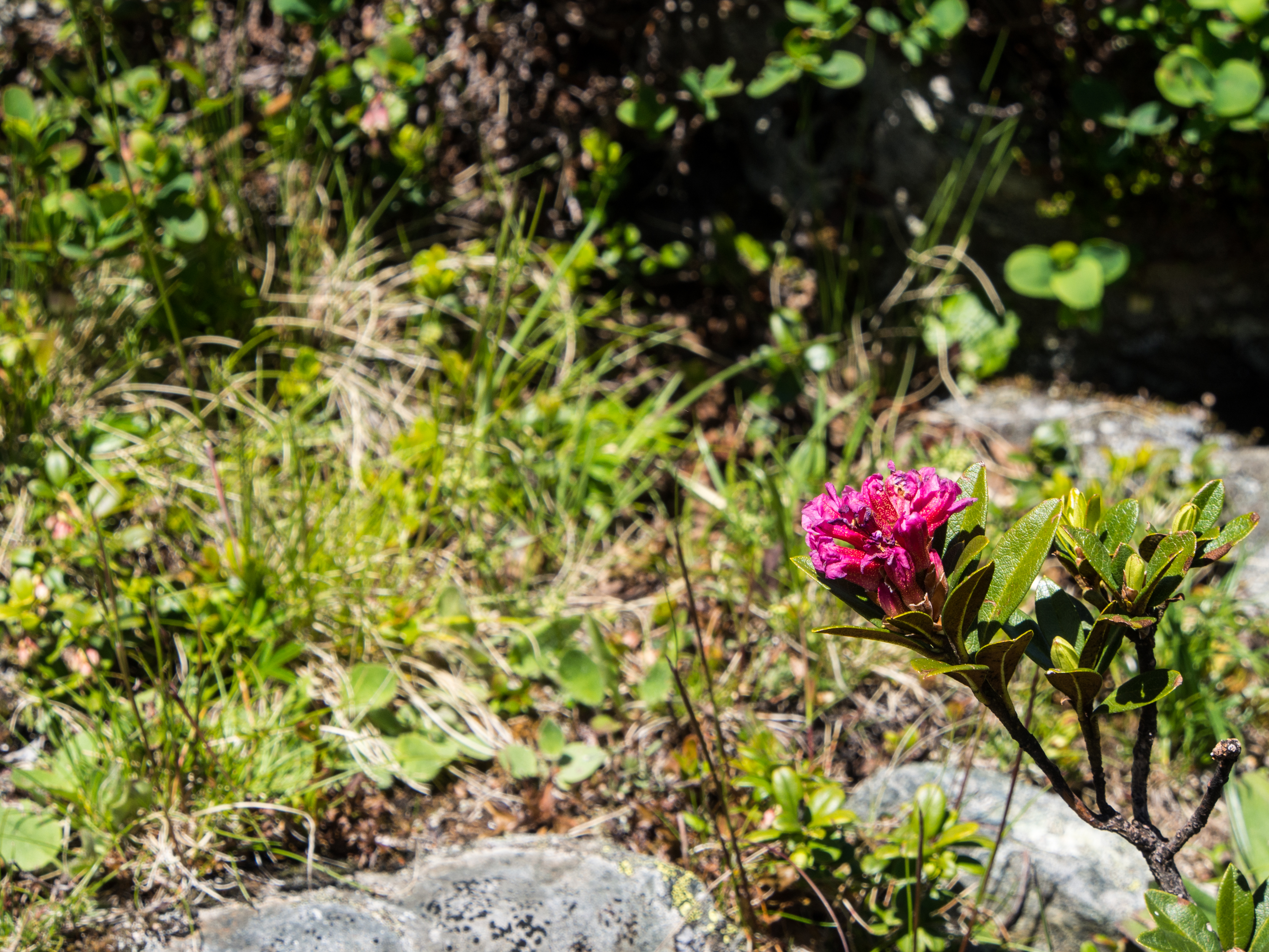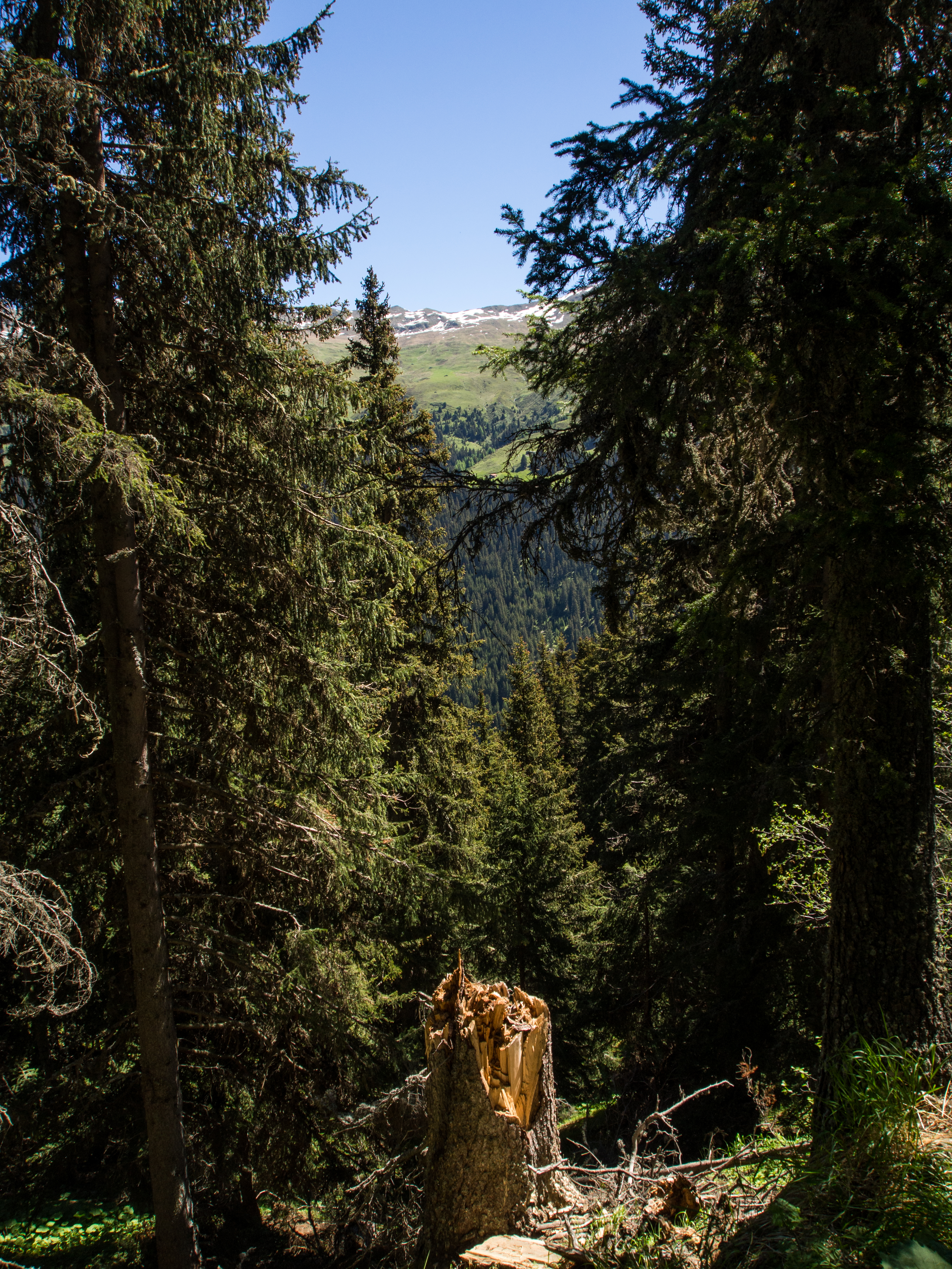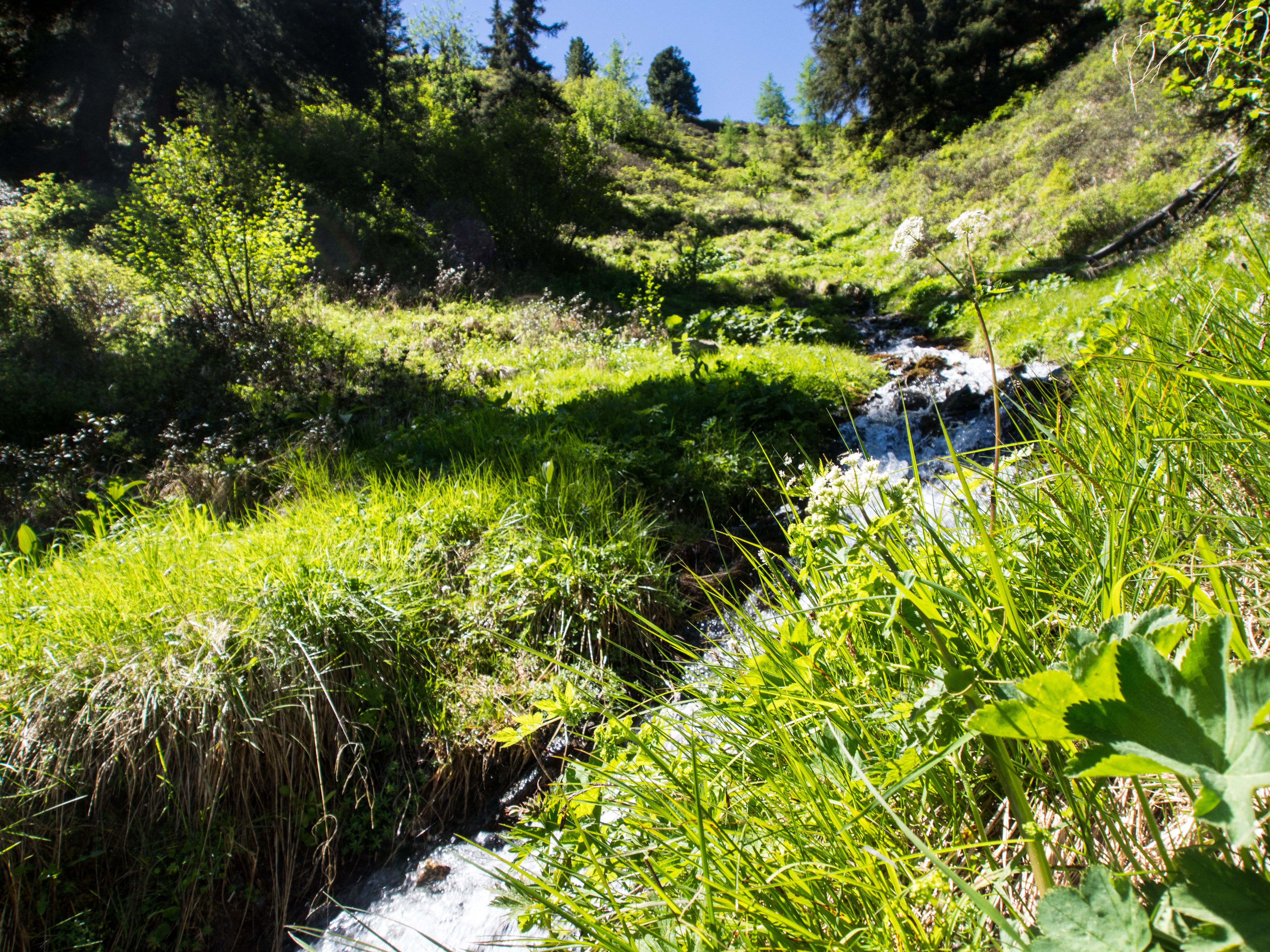 Le lendemain, après un solide petit-déjeuner, nous passons réceptionner notre lunch à emporter, et en petit cortège, nous allons prendre le bus avant de rejoindre la station de téléphérique de Rinerhorn (le tout compris dans la Davos Klosters Active Card). Une fois là haut, la vue est à couper le souffle : sur fond de ciel bleu pur, des montagnes couronnées de neige, des sapins vert foncé et des alpages vert tendre, parsemés de blanc, de jaune, de rose, de fuschia, de mauve et de bleu, les couleurs des milliers de fleurs de montagne : marguerite, renoncules, myosotis, gentianes ou roses des Alpes. C'est superbe, j'ai envie de gambader, de me rouler dans les fleurs, de yodeler et de chanter à tue-tête "Heidiiiii, Heeeeeeeidiiiiiii!" (les Grisons est le canton de la petite fille de l'Alpe). Pas le temps de s'arrêter dans la randonnée pour ça. Heureusement, elle est plutôt facile et pensée pour ceux qui ont envie de marcher, sans devoir trop faire d'effort. Le sentier fait le tour de la montagne avant de descendre vers la vallée. Dans les heures qui vont suivre, ce sera une succession de paysages à couper le souffle, à marcher entre prairie et petit bois de pins, avec de temps en temps des petits torrents à traverser. Pendant la marche, j'essaierai de "perdre" mes compagnons de randonnée pour profiter de toute cette magie. C'est un peu un plaisir coupable.