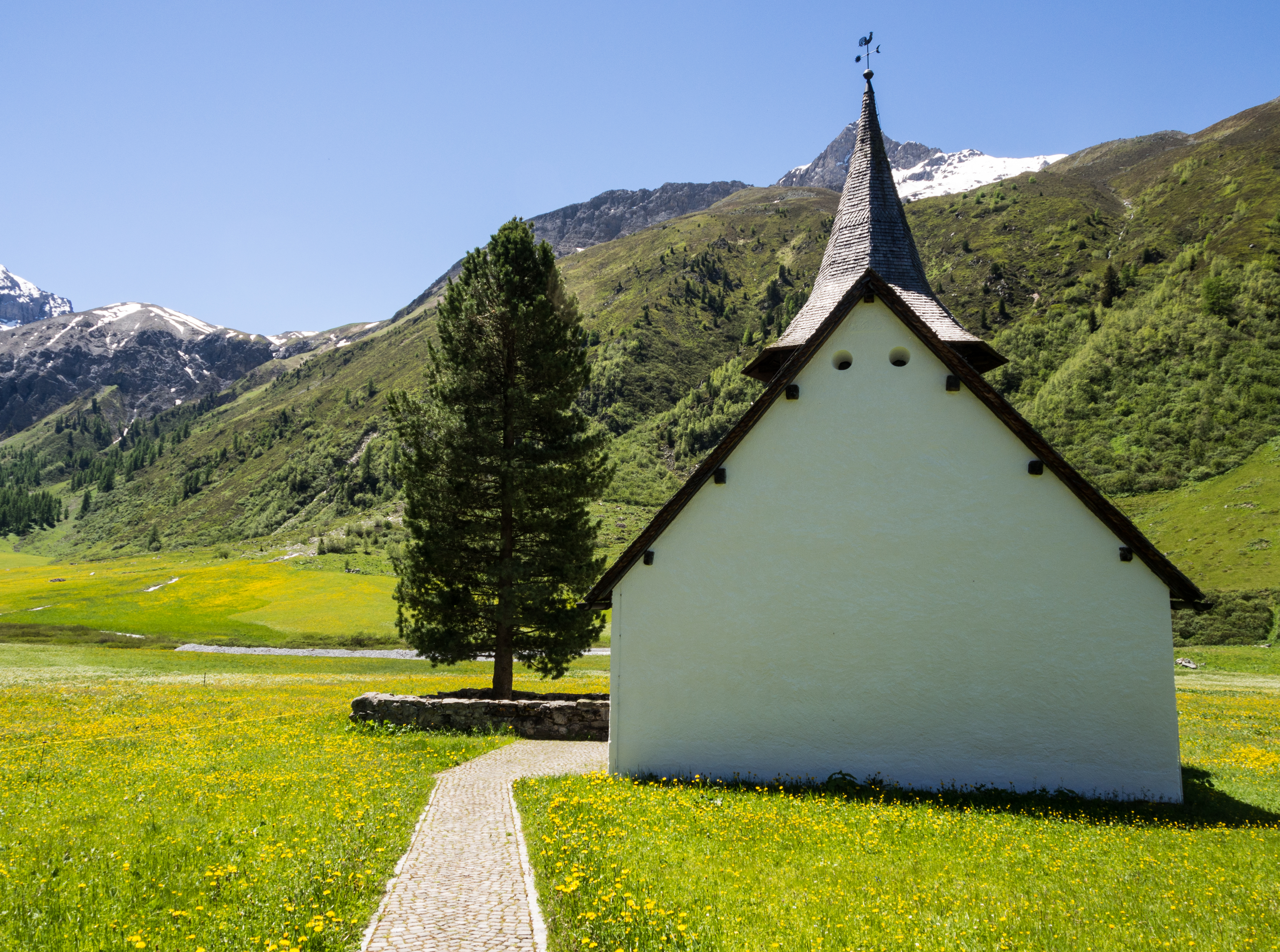 La promenade s'achève à l'entrée du village de Sertig, où nous dévorerons nos tartines à l'ombre d'une petite église entourée de fleurs, à deux pas de la route et d'un arrêt de bus qui nous ramènera en ville.
