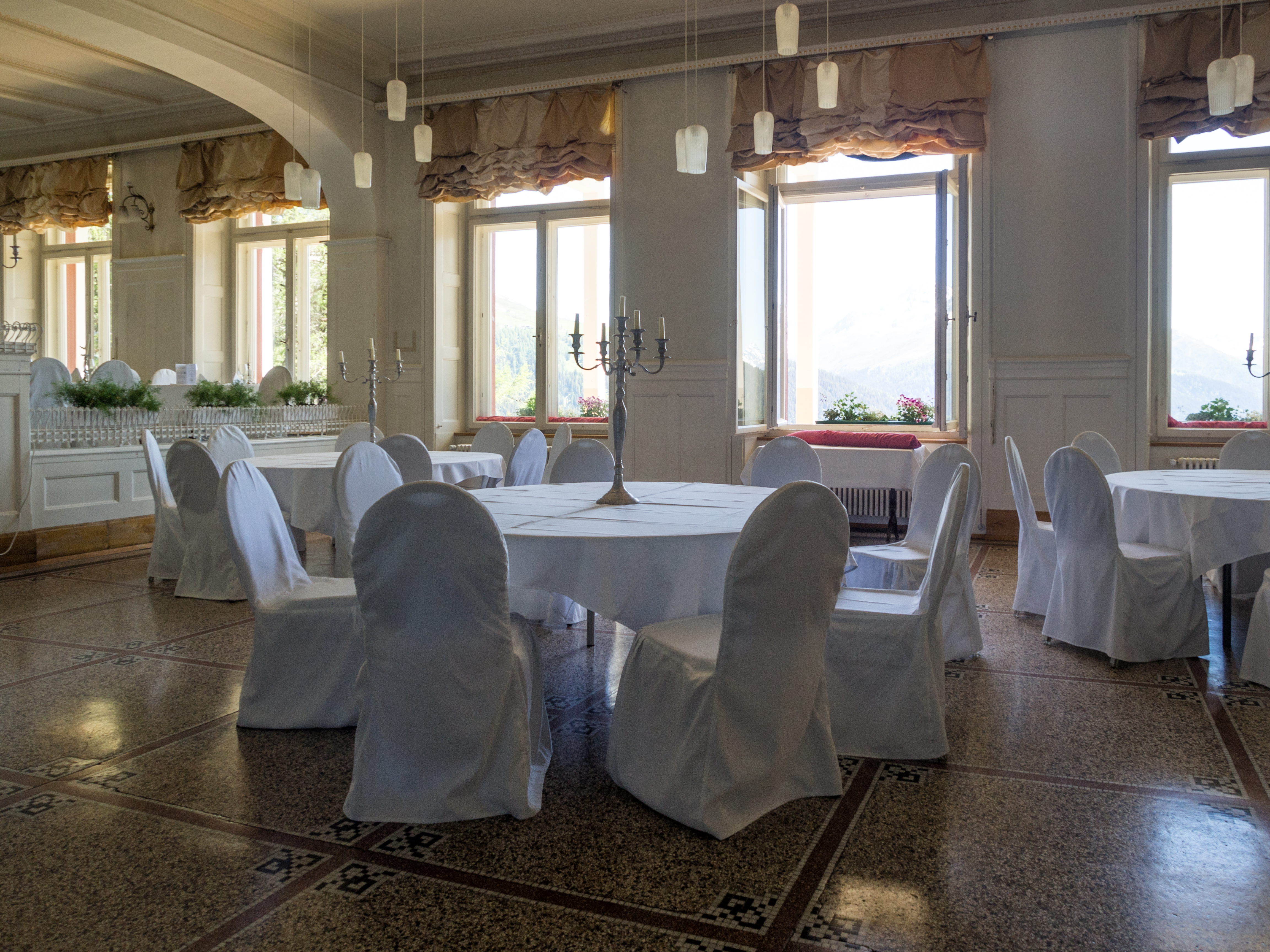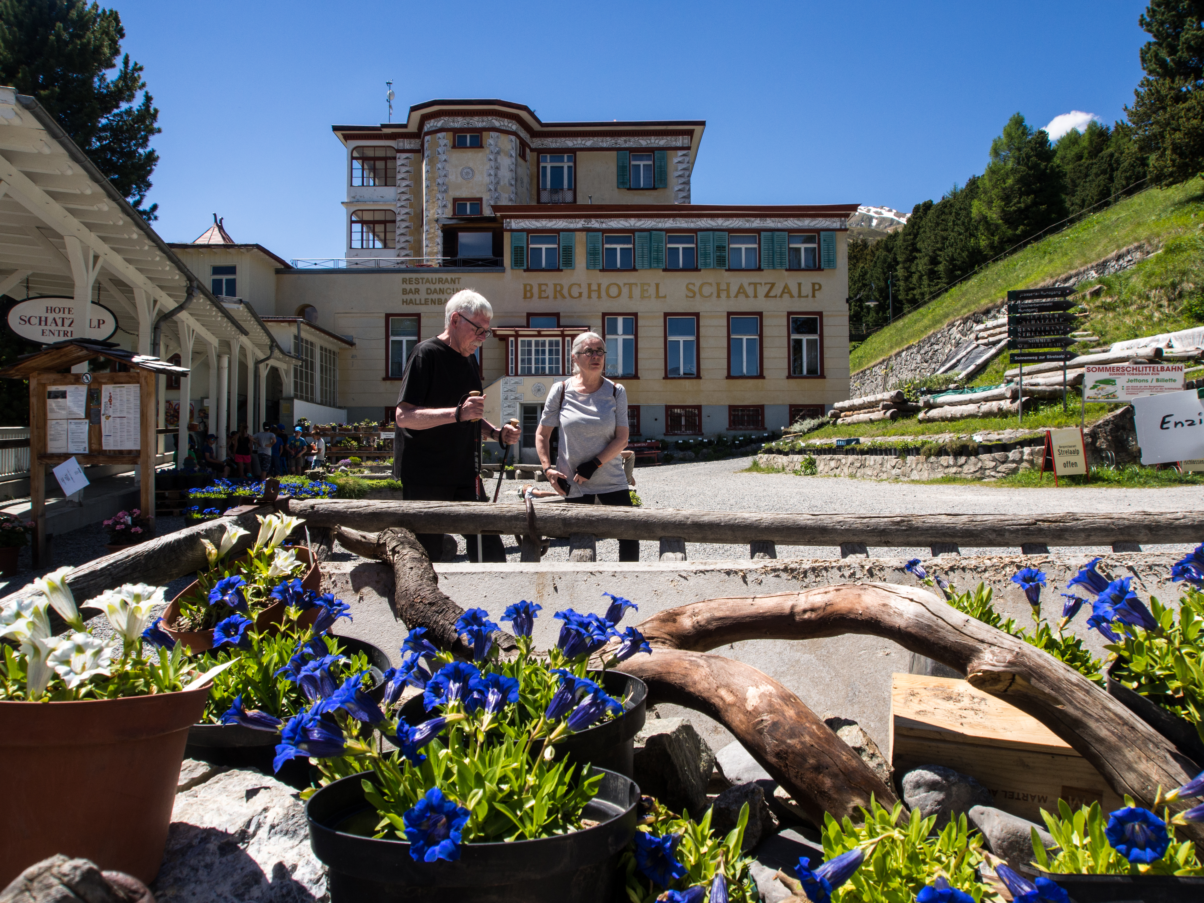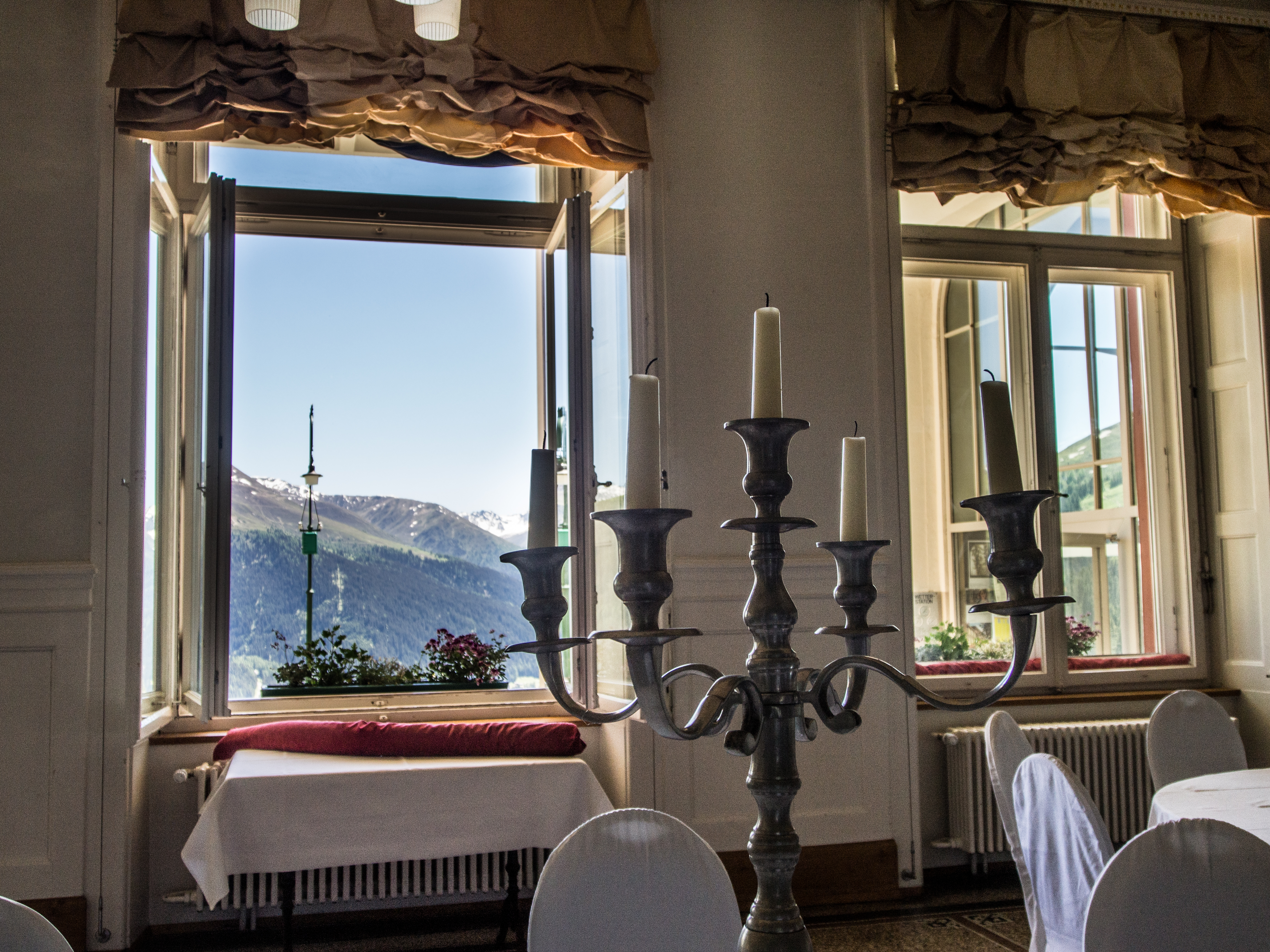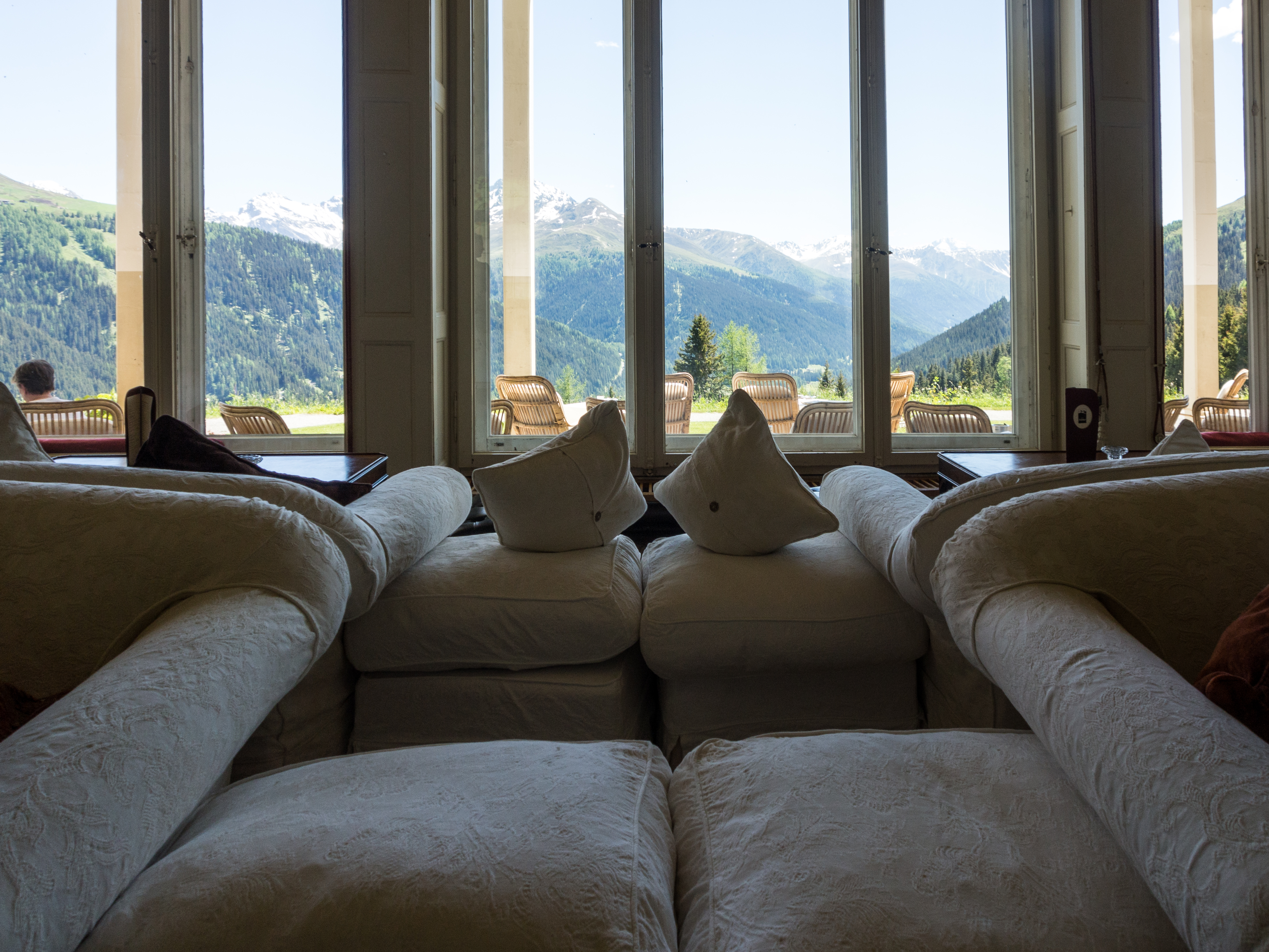 C'est reparti pour un tour de téléphérique ! Nous sommes déposés à la station qui emmène visiteurs et clients à l'Hotel Schatzalp. Cet hôtel ouvert en 1900 en tant qu'ancien sanatorium est encore plus haut que l'auberge de jeunesse et se visite un peu comme un vrai musée (la Davos Kloster Card vous donne d'ailleurs droit à une visite gratuite). Y rentrer, c'est un peu se replonger dans un monde fait de clientèle aisée, venue soigner ses poumons au bon air des Alpes. Probablement la même que Thomas Mann y a croisé. Venu à Davos pour accompagner sa femme qui avait besoin de soins, il est ressortira avec un roman : "La montagne magique" dont l'action se passe au "Berghotel". Sans doute les personnages que son héros croisera ont un peu à voir avec ceux rencontrés pendant son séjour. A part un mobilier plus contemporain, il est certain qu'il reconnaîtrait le restaurant : le menu du soir est déjà disposé sur la table, les grandes tables nappées de blanc sont déjà prêtes et il ne manque plus qu'allumer les bougies des chandeliers ! Les couloirs de l'hôtel par contre, me font furieusement penser à l'Overlook Motel avec son couloir verdâtre et ses lampes d'époque qui semble encore devoir indiquer l'heure des soins ! A l'extérieur par contre, la terrasse est riante et invite à venir déguster un cocktail, allongé sur une chaise longue, avec peut-être des câlins de la part d'un des chats du domaine. Pas de ronrons pour nous, nous reprenons le chemin du village, via le sentier de randonnée.