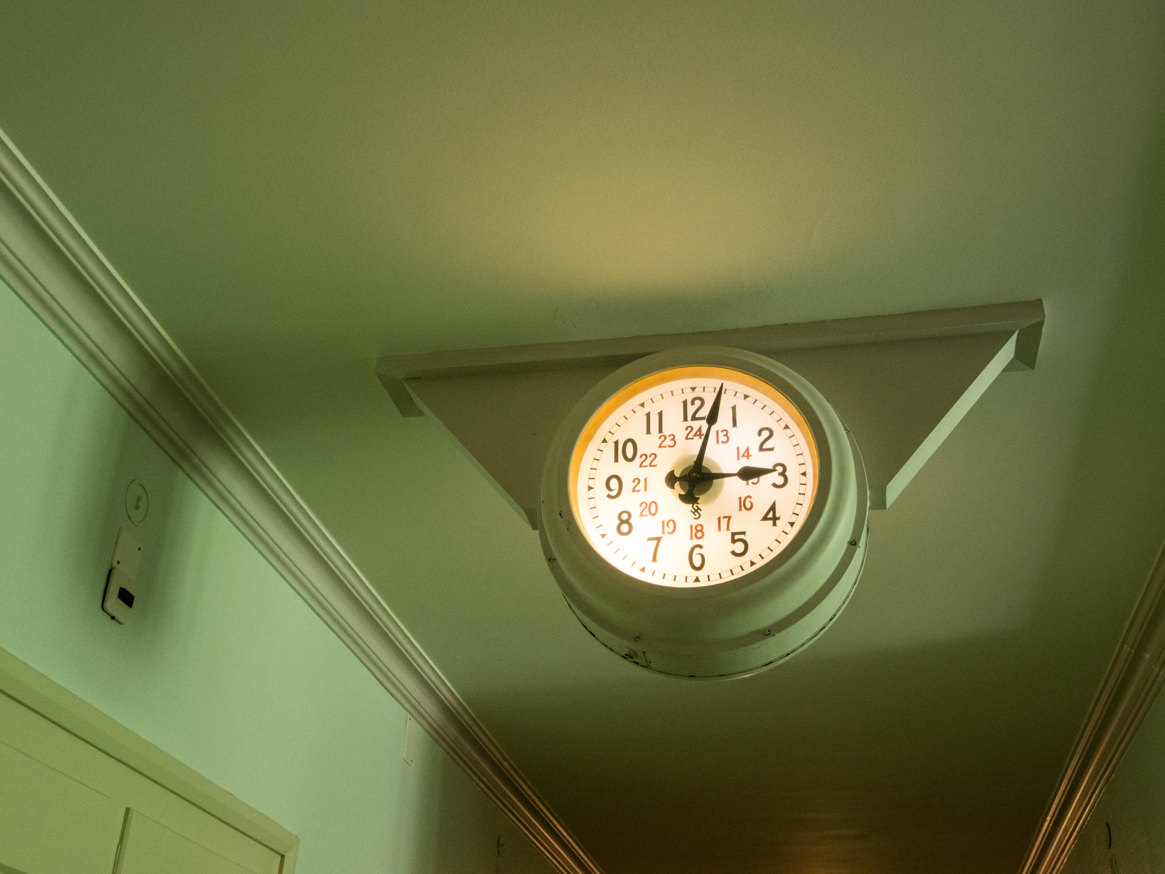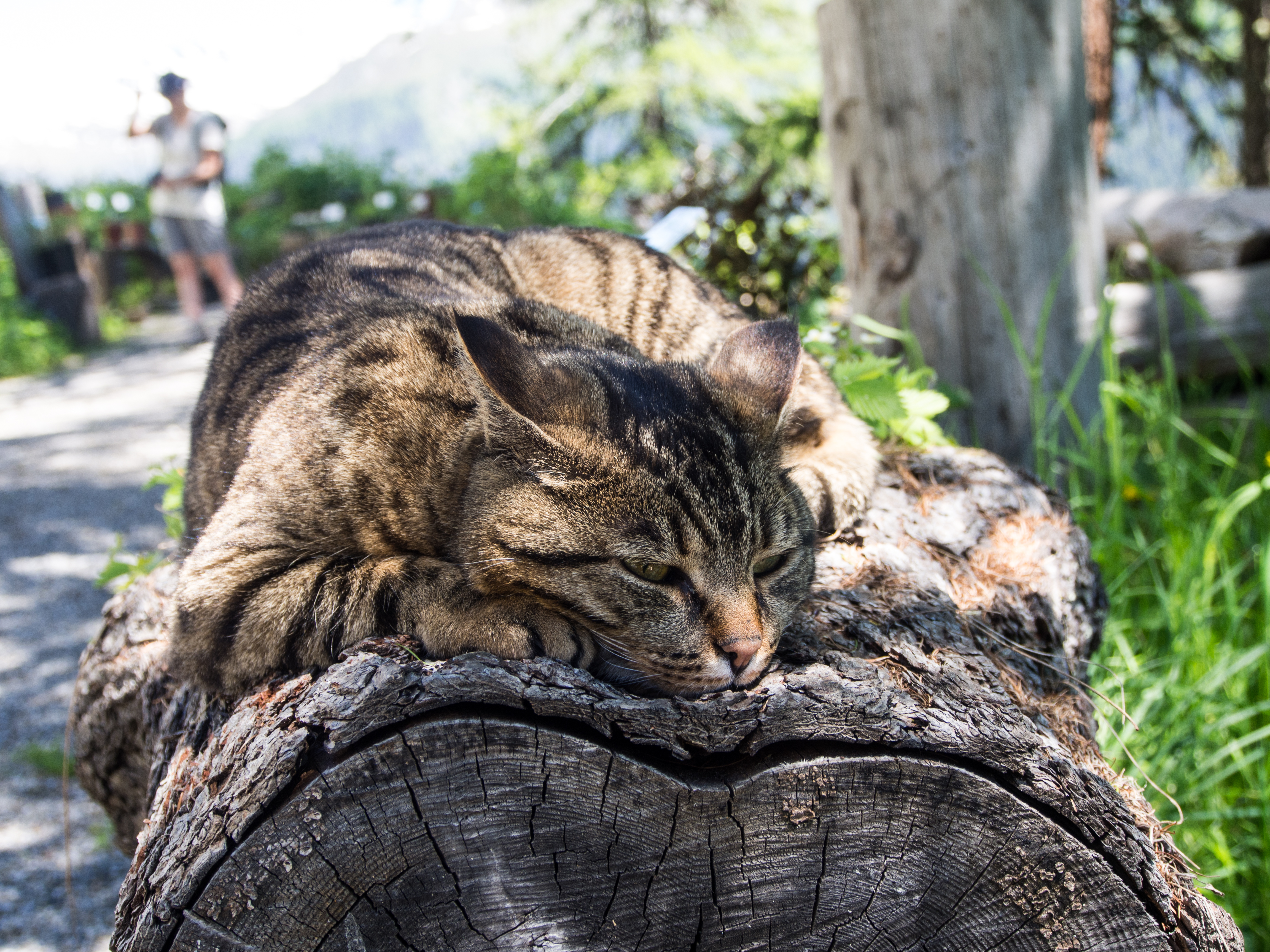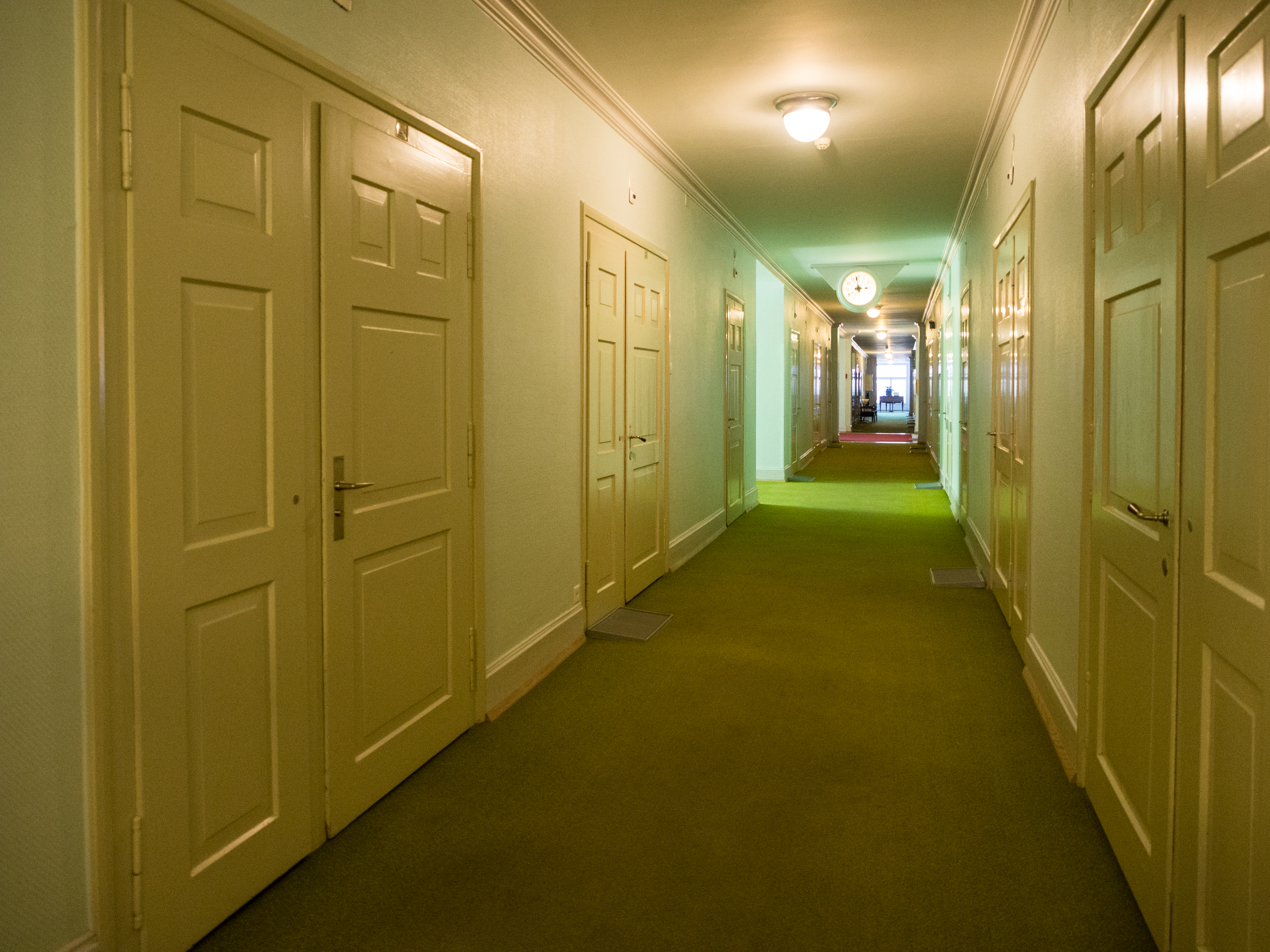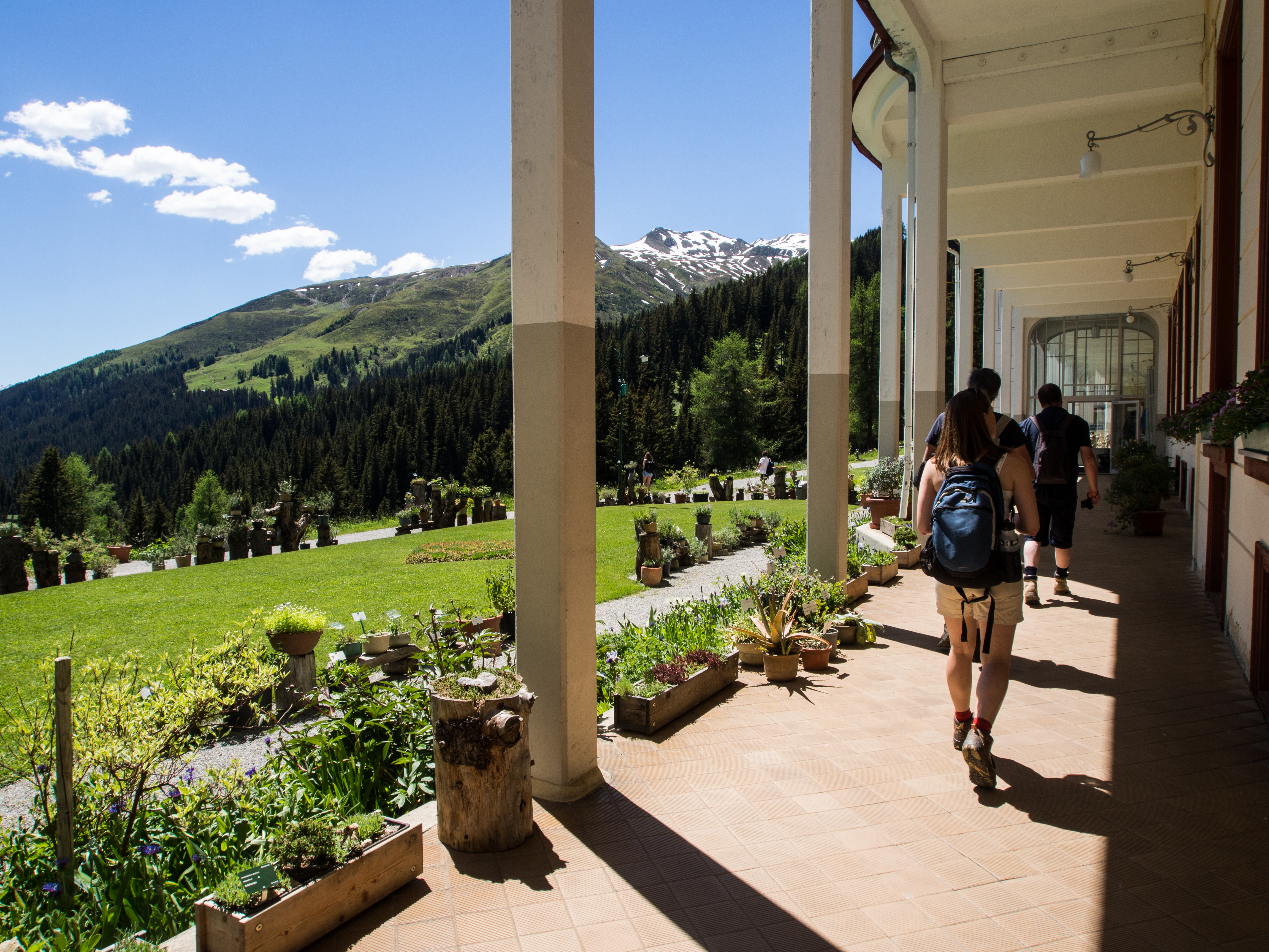 C'est reparti pour un tour de téléphérique ! Nous sommes déposés à la station qui emmène visiteurs et clients à l'Hotel Schatzalp. Cet hôtel ouvert en 1900 en tant qu'ancien sanatorium est encore plus haut que l'auberge de jeunesse et se visite un peu comme un vrai musée (la Davos Kloster Card vous donne d'ailleurs droit à une visite gratuite). Y rentrer, c'est un peu se replonger dans un monde fait de clientèle aisée, venue soigner ses poumons au bon air des Alpes. Probablement la même que Thomas Mann y a croisé. Venu à Davos pour accompagner sa femme qui avait besoin de soins, il est ressortira avec un roman : "La montagne magique" dont l'action se passe au "Berghotel". Sans doute les personnages que son héros croisera ont un peu à voir avec ceux rencontrés pendant son séjour. A part un mobilier plus contemporain, il est certain qu'il reconnaîtrait le restaurant : le menu du soir est déjà disposé sur la table, les grandes tables nappées de blanc sont déjà prêtes et il ne manque plus qu'allumer les bougies des chandeliers ! Les couloirs de l'hôtel par contre, me font furieusement penser à l'Overlook Motel avec son couloir verdâtre et ses lampes d'époque qui semble encore devoir indiquer l'heure des soins ! A l'extérieur par contre, la terrasse est riante et invite à venir déguster un cocktail, allongé sur une chaise longue, avec peut-être des câlins de la part d'un des chats du domaine. Pas de ronrons pour nous, nous reprenons le chemin du village, via le sentier de randonnée.
