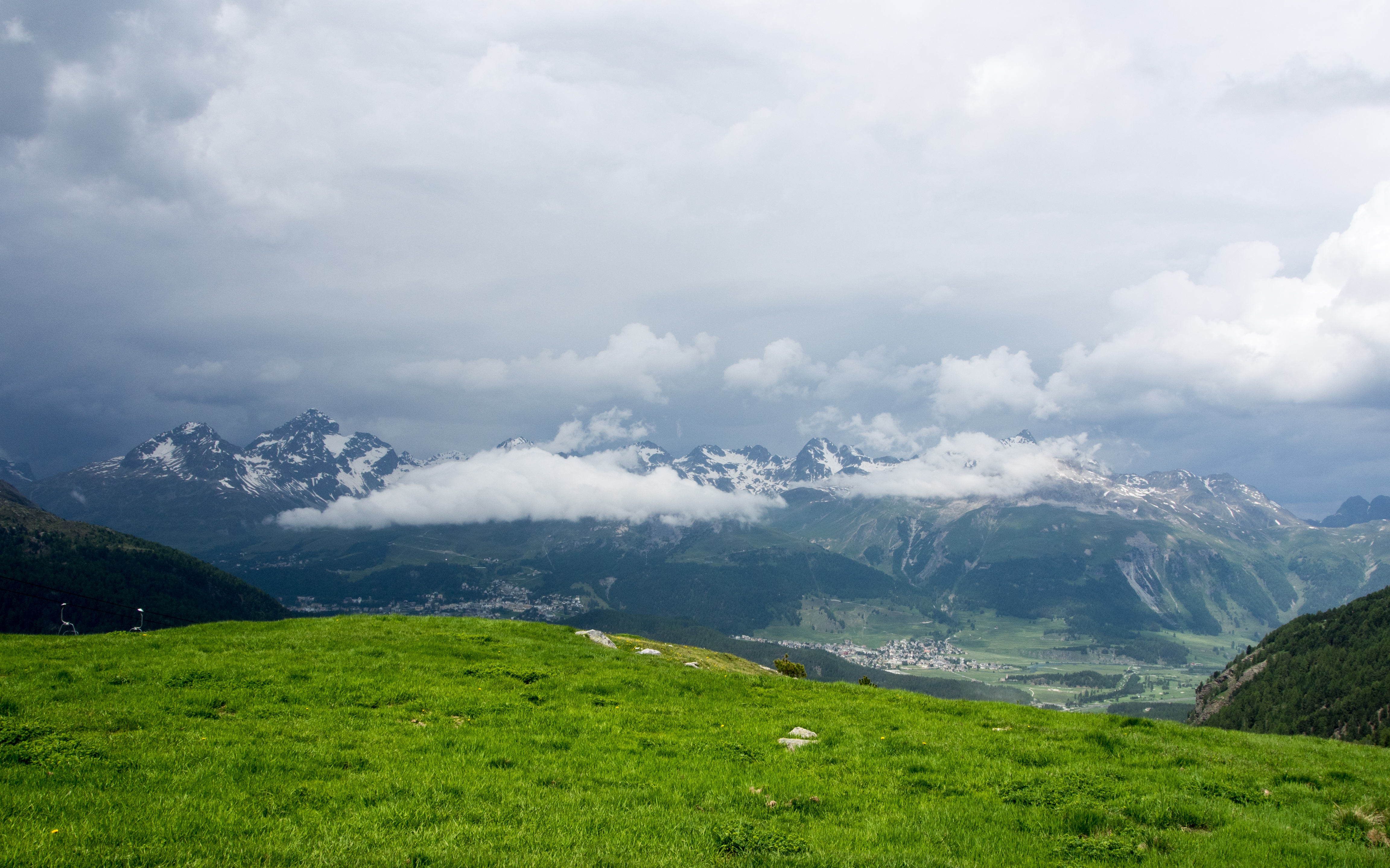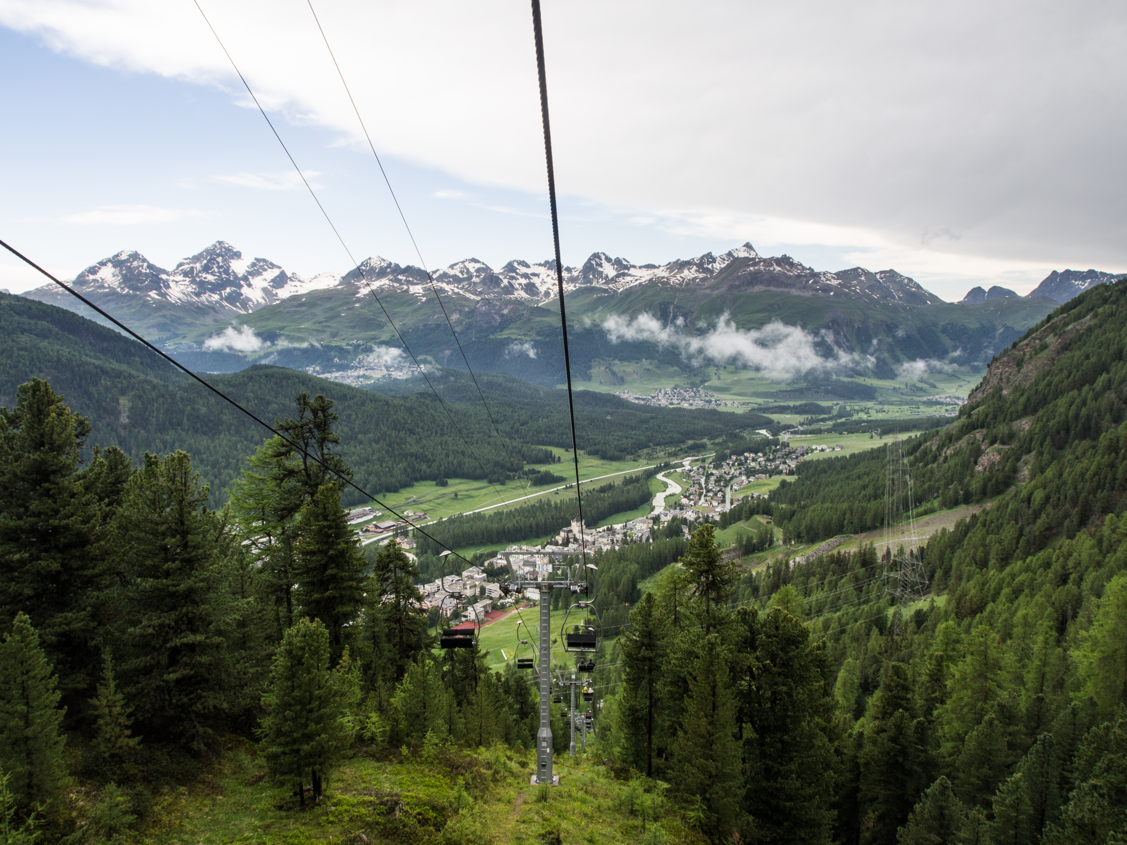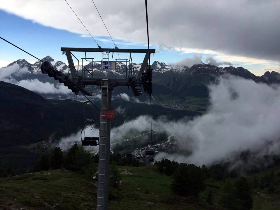 Nous avons échappé au pire : tout d’un coup, le vent s’est mis à souffler, la température chute brutalement et l’orage s’abat sur le restaurant. Les conditions sont tellement mauvaises que le service de remonte-pentes est interrompu. Bien au chaud dans notre cocon de bois, nous attendons que ça passe. Finalement, alors même que nous terminons le café, le ciel commence à se dégager, le ballet des remonte-pentes reprend et il est l’heure de rentrer sur Pontresina. Ultime aventure pour moi. La descente est longue, le paysage grandiose et on se sent bien petite sur notre chaise en fer, pendue comme une araignée au bout de son fil !