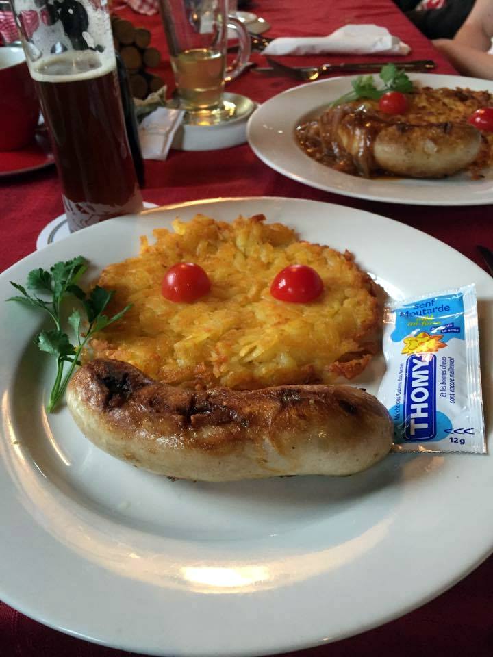 Je me sens comme une petite fille : je vais manger un rösti dans un vrai chalet de montagne suisse ! Il ne manquerait plus qu’un plateau de viande des grisons pour que je sois au paradis ! Pas de chance : ce sera une saucisse et une bouteille de « Piz Palü ». Si le nom vous dit quelque chose : BINGO ! Il est évoqué dans « Inglorious Basterds! » (double point si cela vous évoque le film mentionné dans le film: « L’enfer blanc du Piz Palü ». S’il n’y avait pas autant de nuages, nous pourrions le voir !