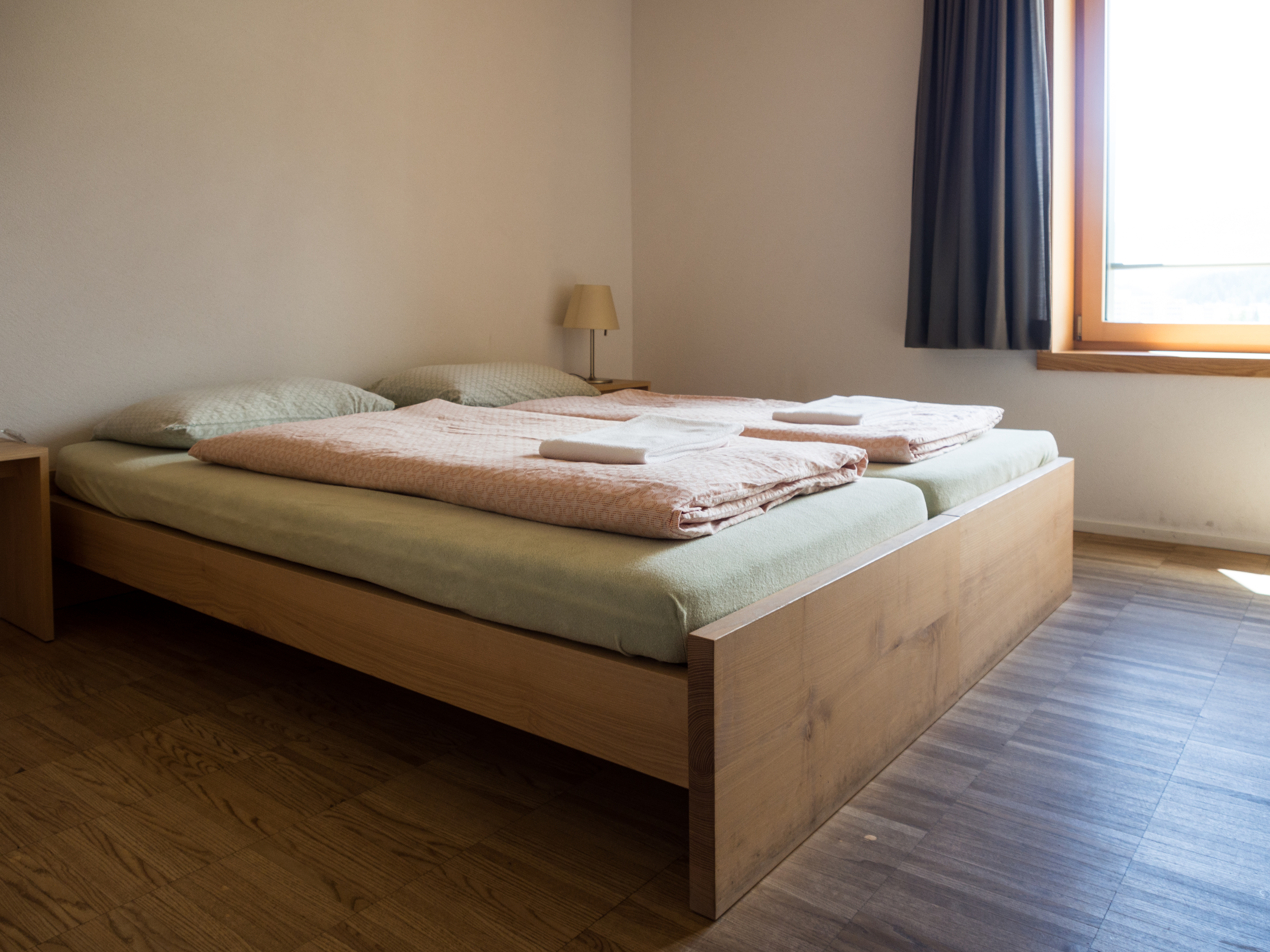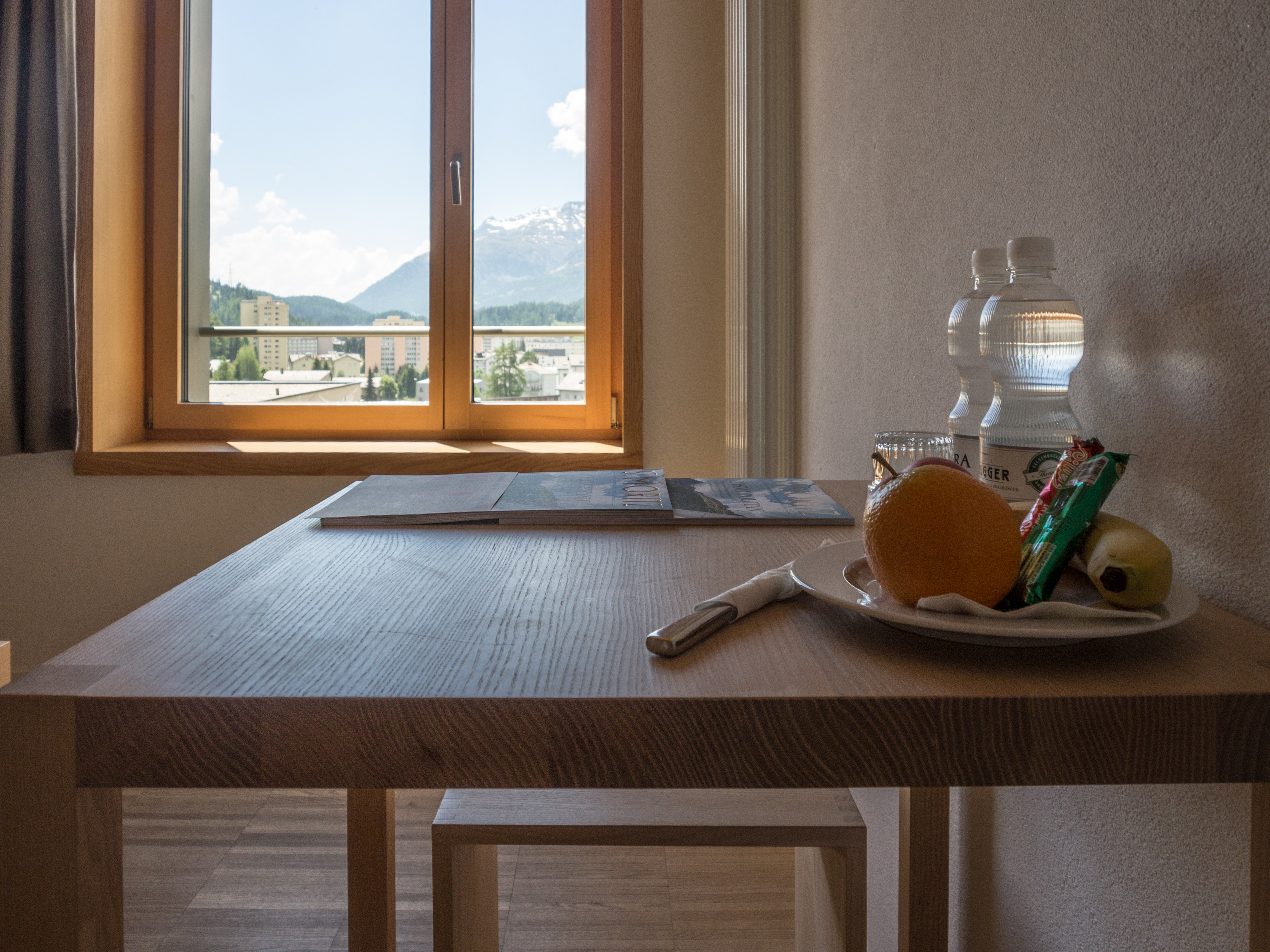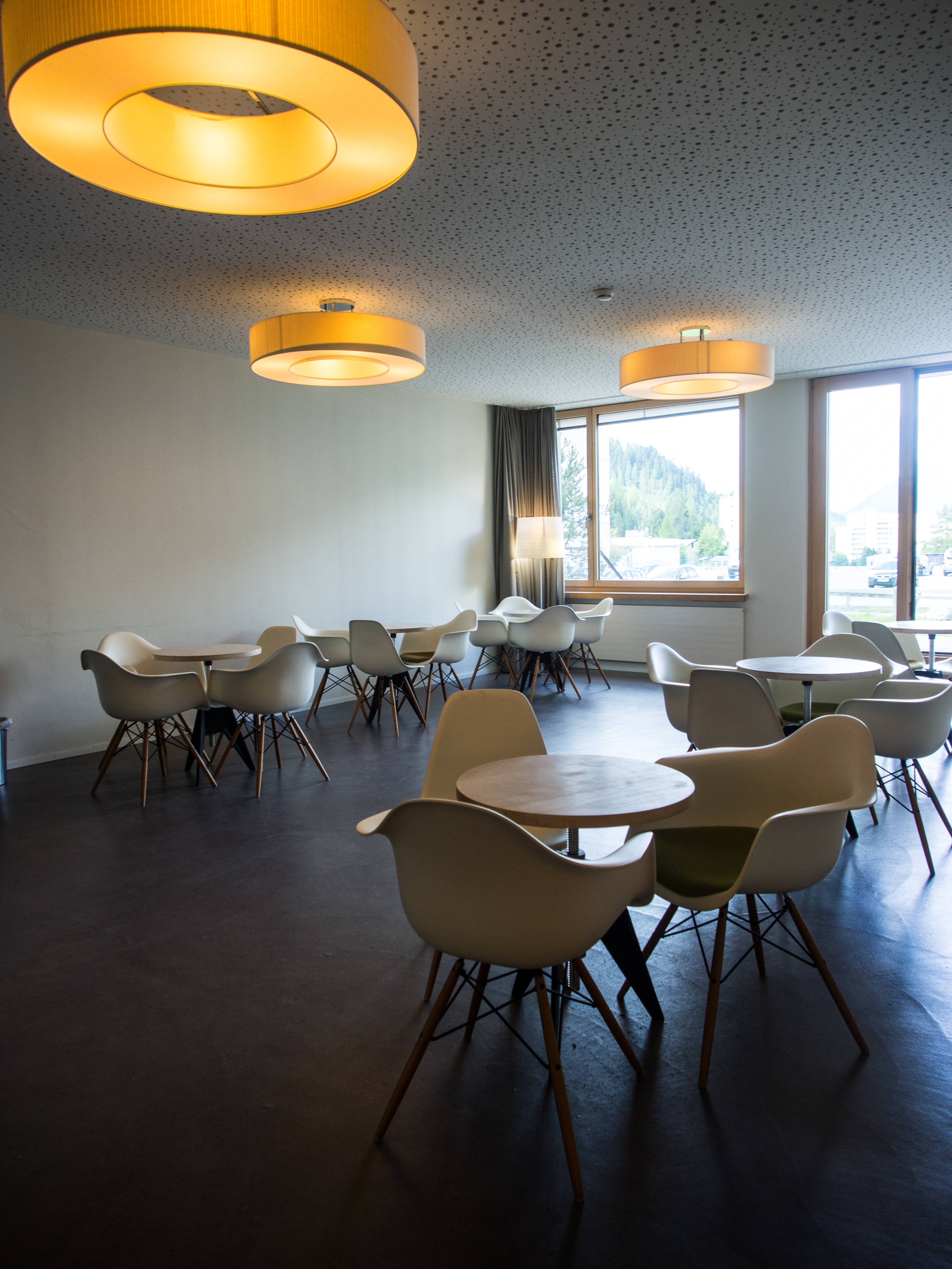 L’auberge de jeunesse de St. Moritz se trouve au terminus de la ligne 3, à l’orée d’une forêt et qu’en dire ? C’est que quand on rentre dans son lobby, on se sent plus dans un boutique hôtel qu’une auberge. Lignes minimalistes, tons beiges, cheminée design… elle a fière allure ! Quant aux chambres, elles sont quasi à tous points semblables à celle de Davos, même la literie est pareil ! Lit en bois, couette et oreiller à petites fleurs, plein d’espace mais malheureusement pas de balcon. Par contre, il y a une très chouette salle de jeu mais aussi, une partie du restaurant décoré en style chalet, que l’on peut louer pour y faire fondues et raclettes. Une jolie petite surprise !