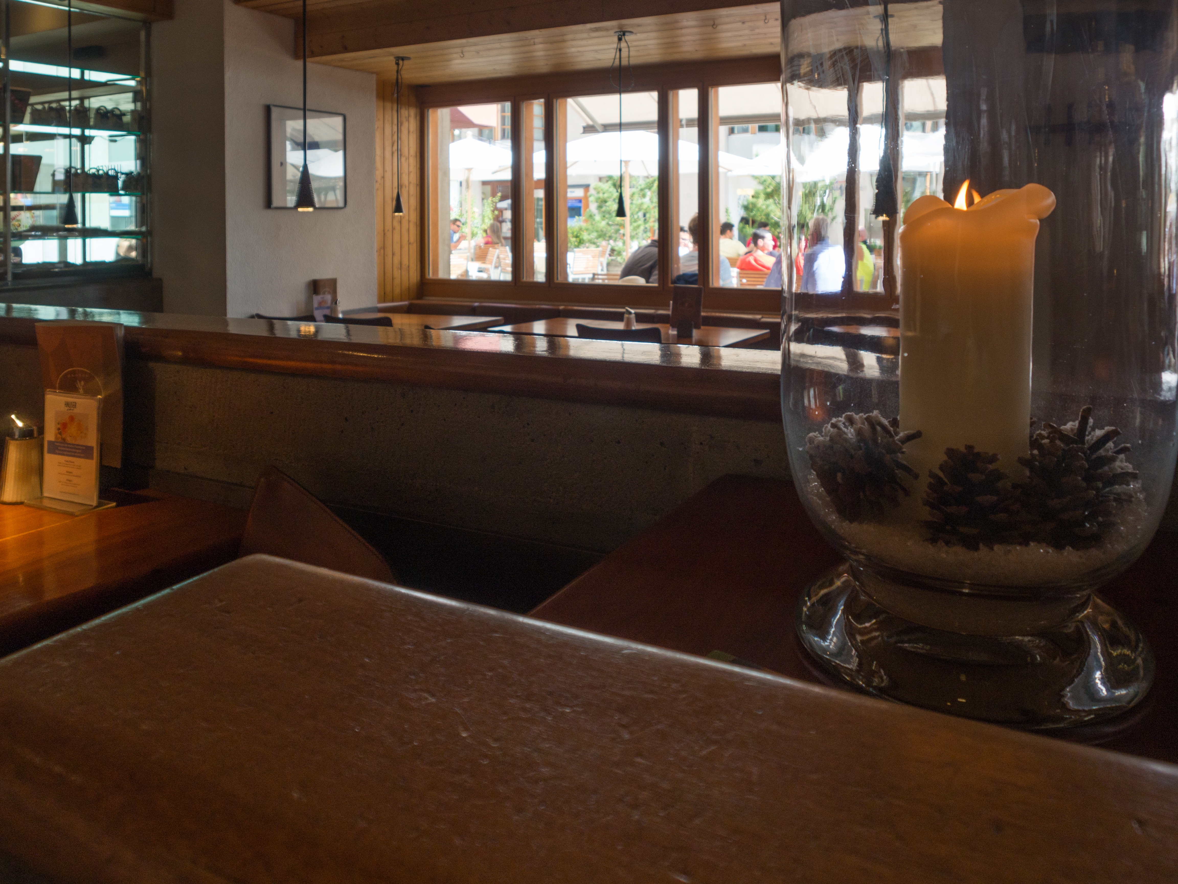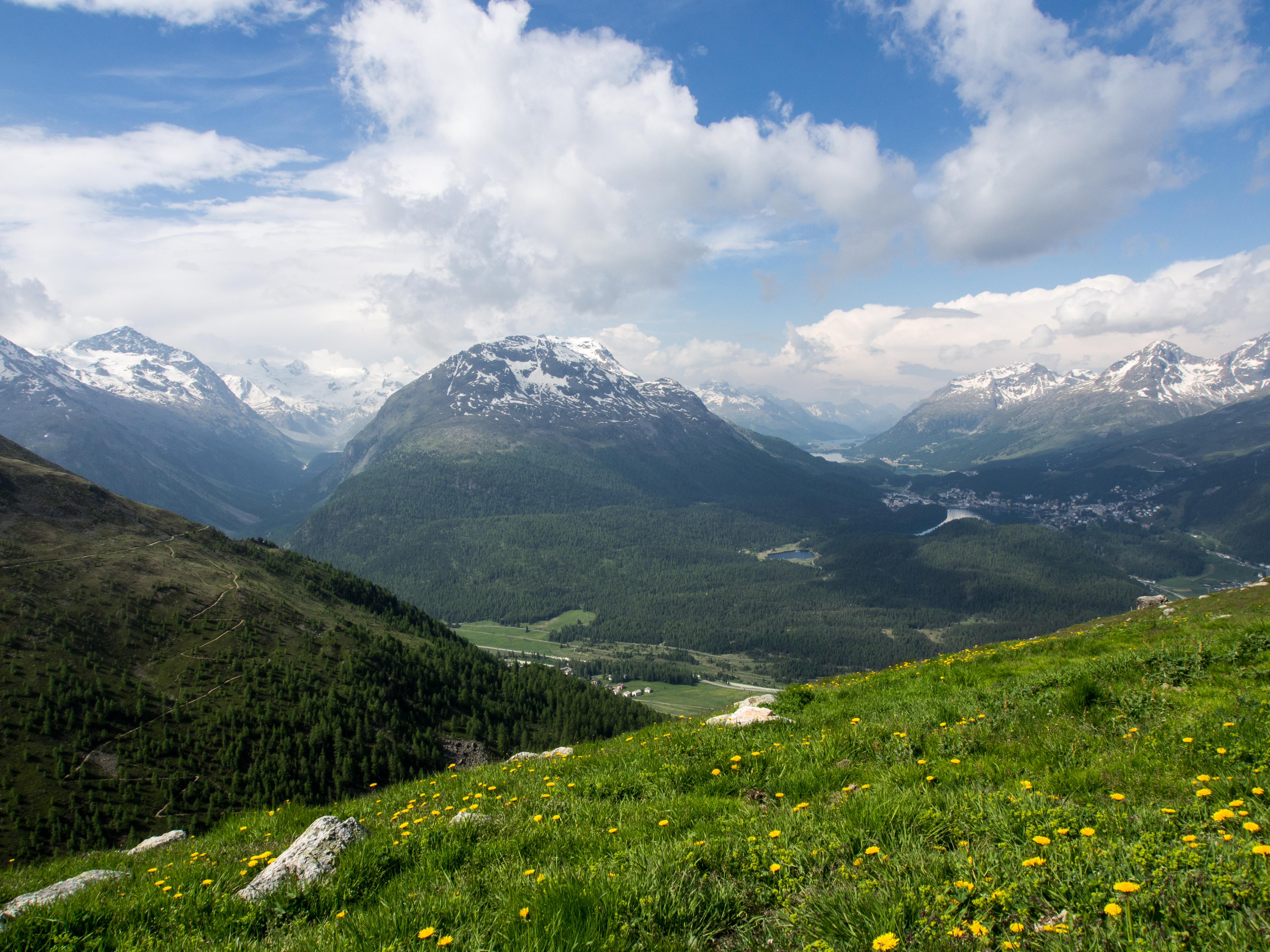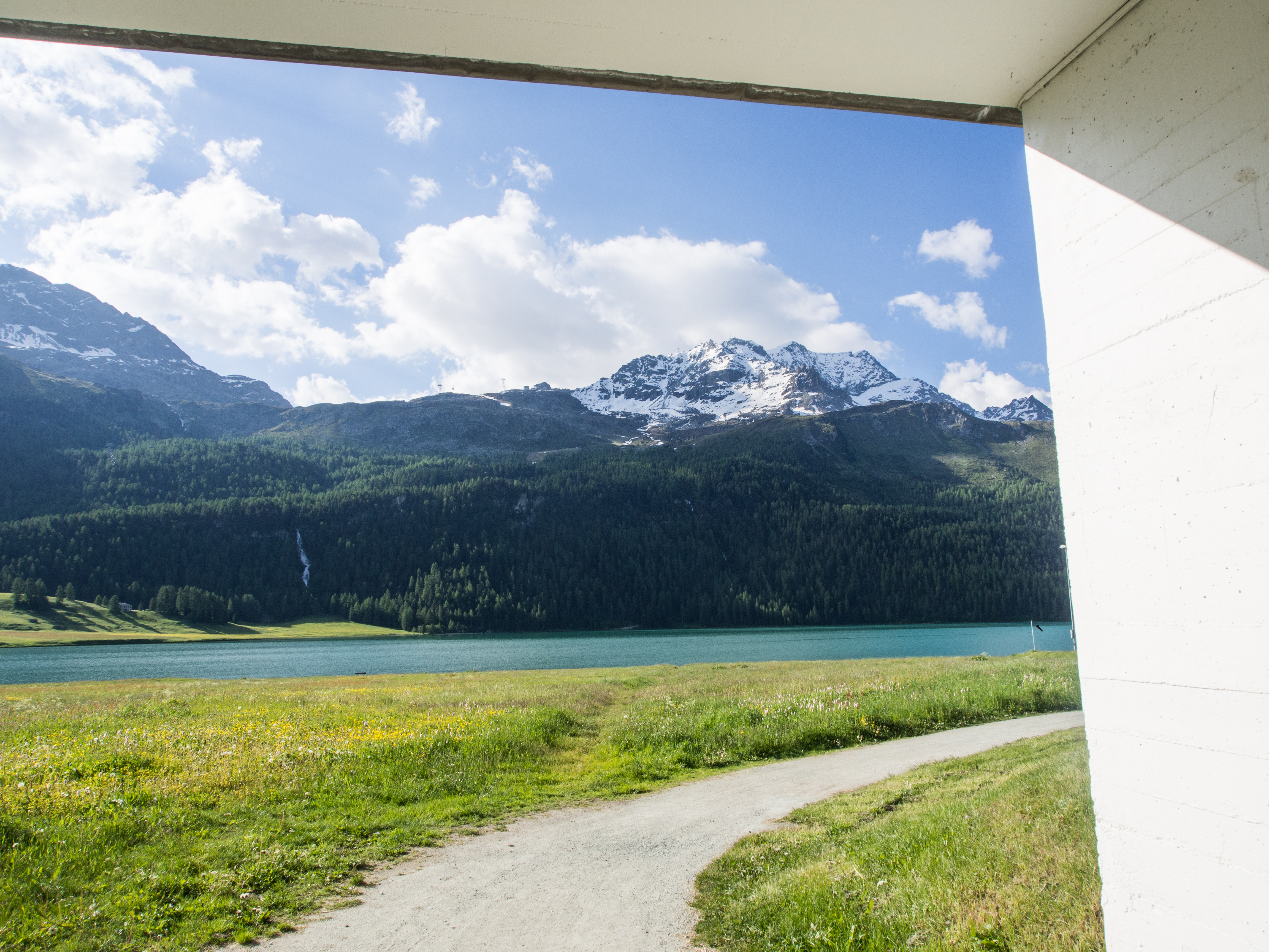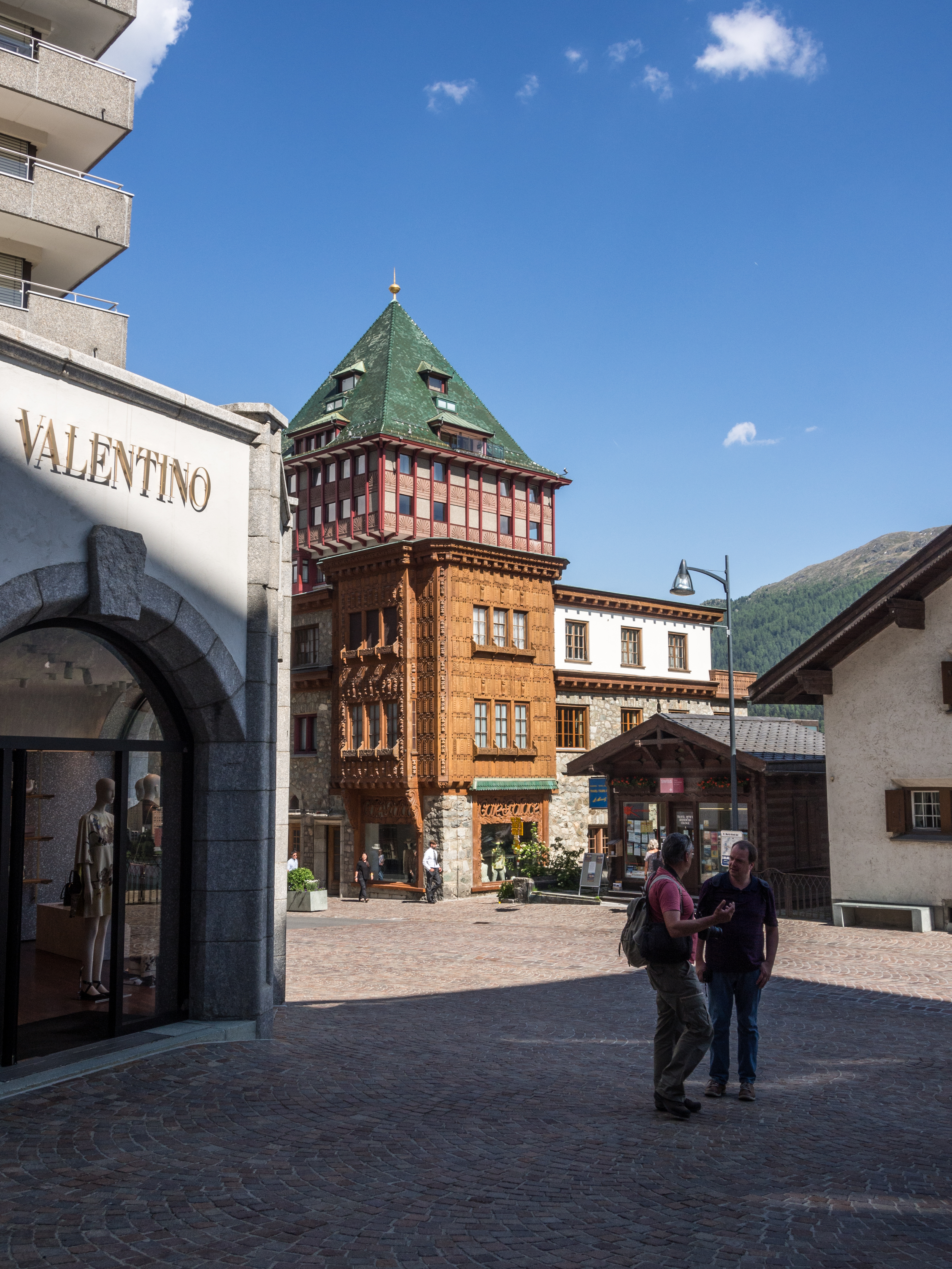 Mais l’été a ses charmes ! De St. Moritz Bad, on monte vers la ville même, qui est en tissu serré sur son petit promontoire. Dans cette partie de la Suisse, les bâtiments sont faits de murs épais, aux fenêtres creusées profondément et les maisons sont souvent ornées de fresques végétales. Ça donne tout une allure à la ville. C’est là qu’on en prend plein les yeux : les boutiques de luxe sont partout, les belles voitures aussi. Avec nos chaussures de randonnées, on se sentirait presque inadaptés ! Mais tout ce petit monde se retrouvera sur pied d’égalité au Café Hauser pour déguster un « schoggi », un café glacé à la sauce au chocolat, la spécialité maison (bonus si vous résistez à la chocolaterie-pâtisserie à côté du café).