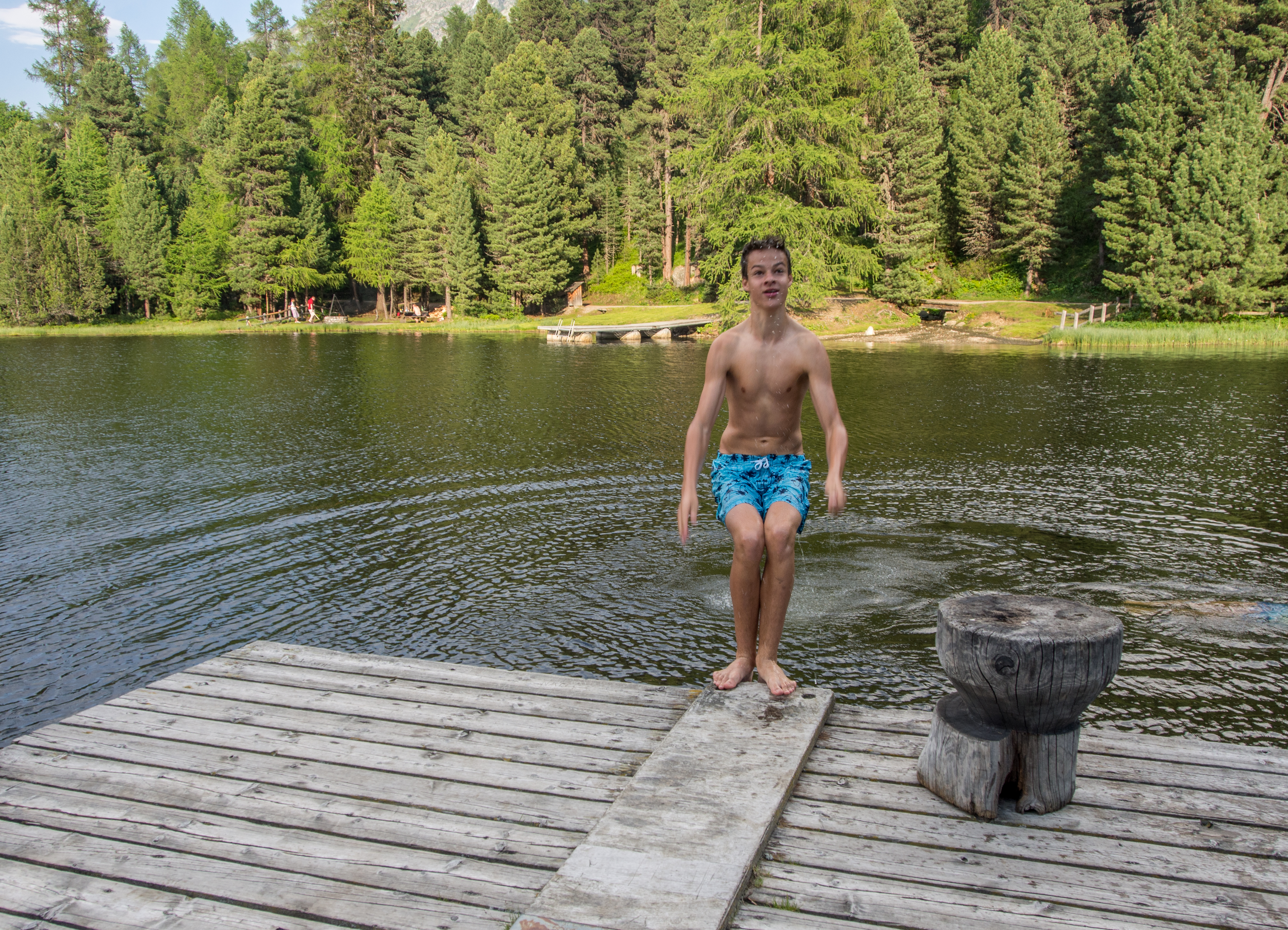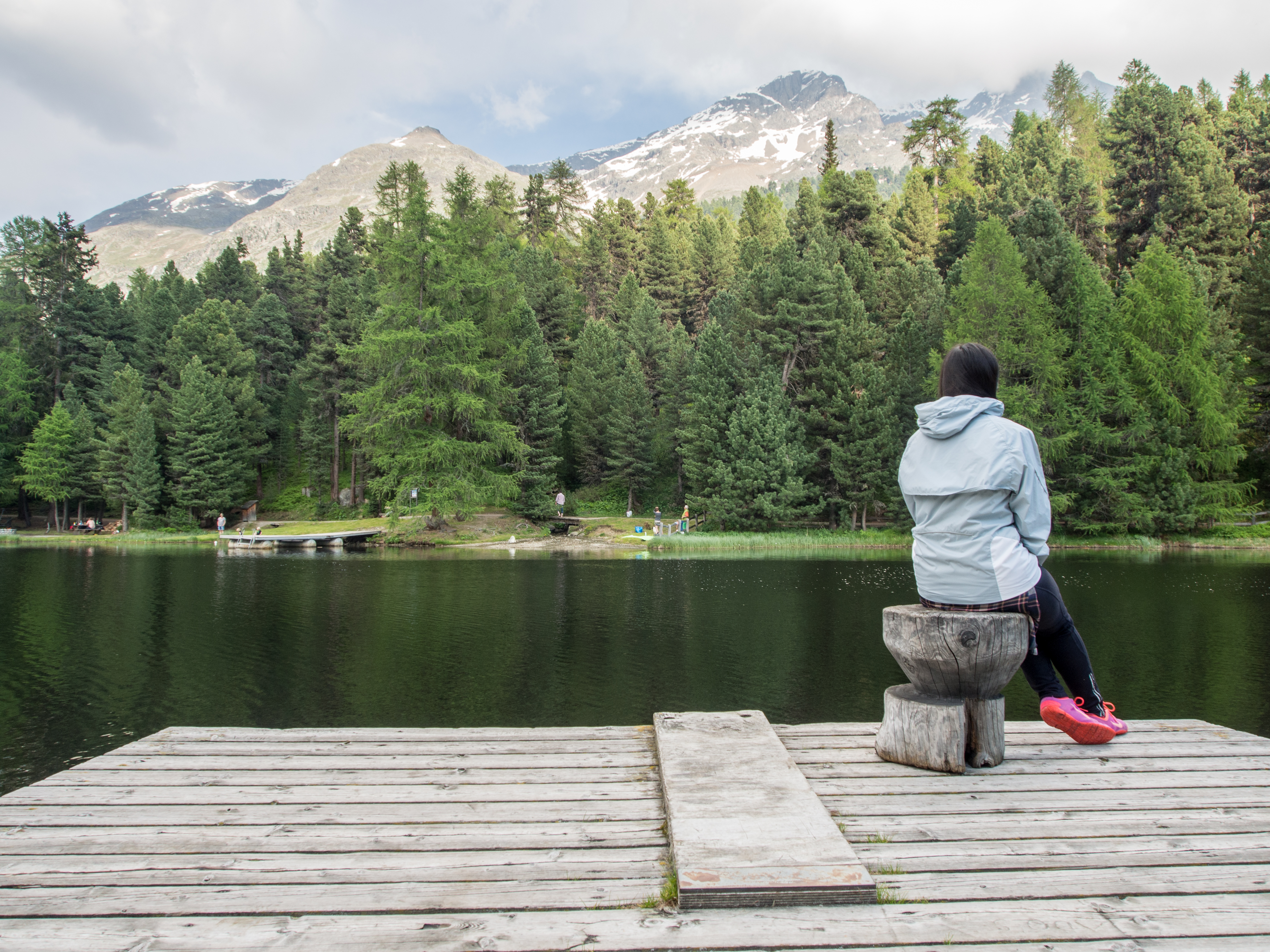 Le Lej Marsch est un petit lac qui se trouve derrière l’Hôtel Kempiski, il faut traverser un complexe hôtelier pour y arriver mais tout de suite, on se retrouve dans un petit sentier en pleine nature. Autour de ce lac vert foncé, des sommets qui dépassent une forêt de sapins. C’est idyllique mais c’est aussi un super lieu pour faire des barbecues ! Il suffit de trouver un emplacement libre et de savoir allumer un feu ! Pour le reste, le bois pour alimenter le feu est prévu par les autorités des parcs et gratuitement ! Reste plus qu’à ramener des victuailles. Ce que notre petit groupe a fait : saucisses, brochettes et pommes de terre en chemise ont vite pris le chemin du barbecue. Pendant que la viande et les patates cuisaient, Rianne et moi n’avons pas hésité à faire trempette dans le lac. Un petit 17-18 degrés ne fait pas peur à des filles de la Mer du Nord !