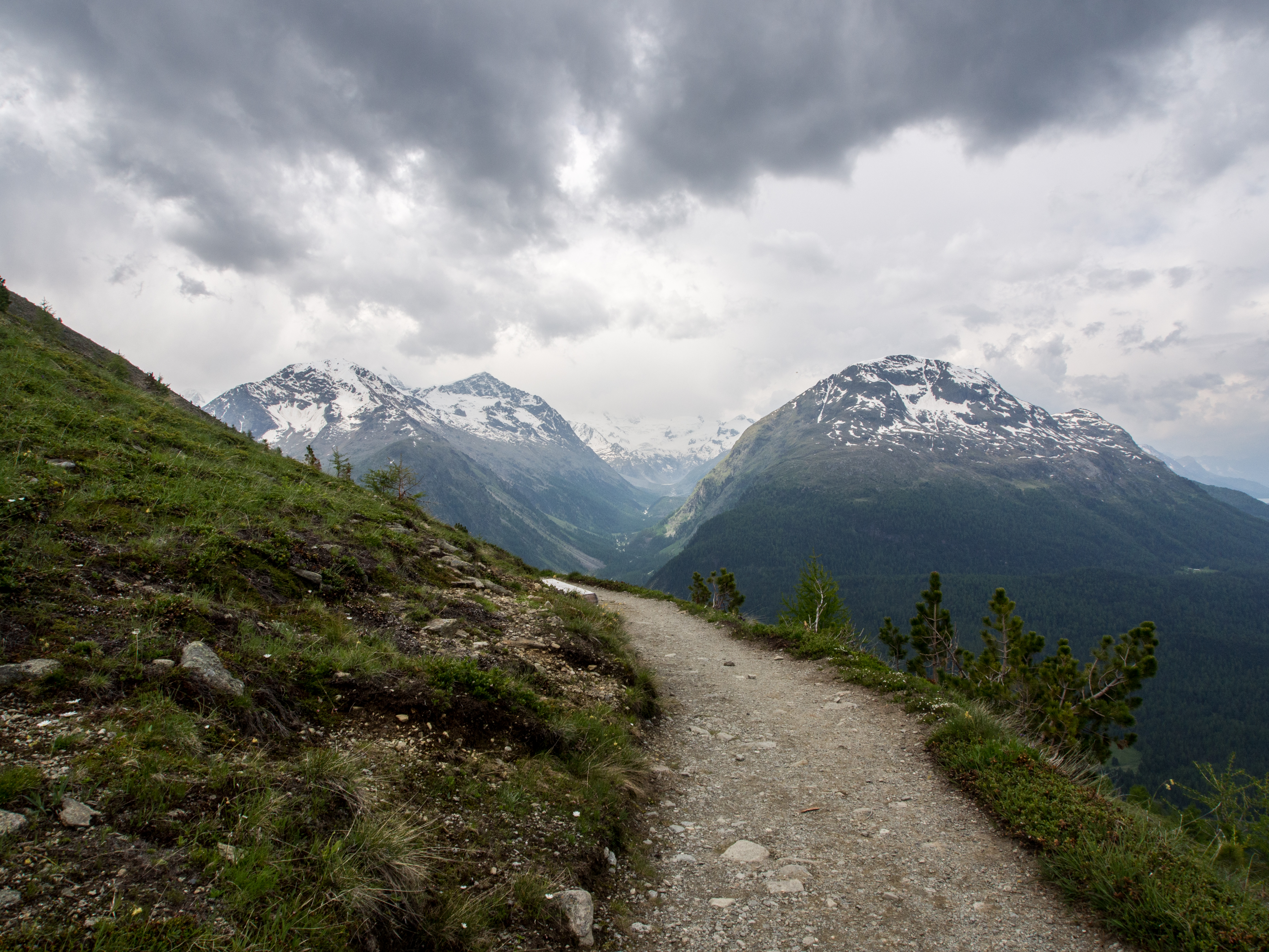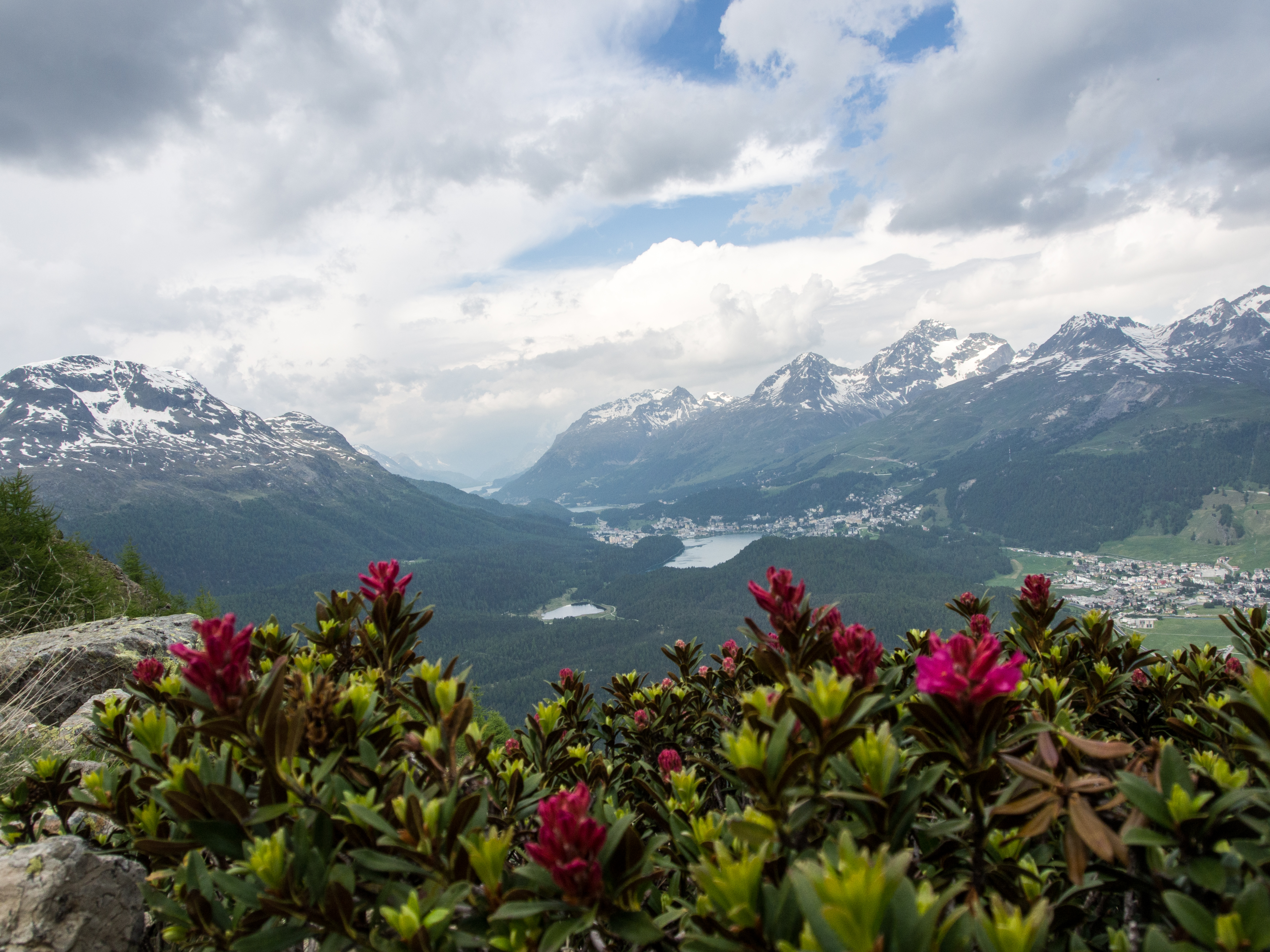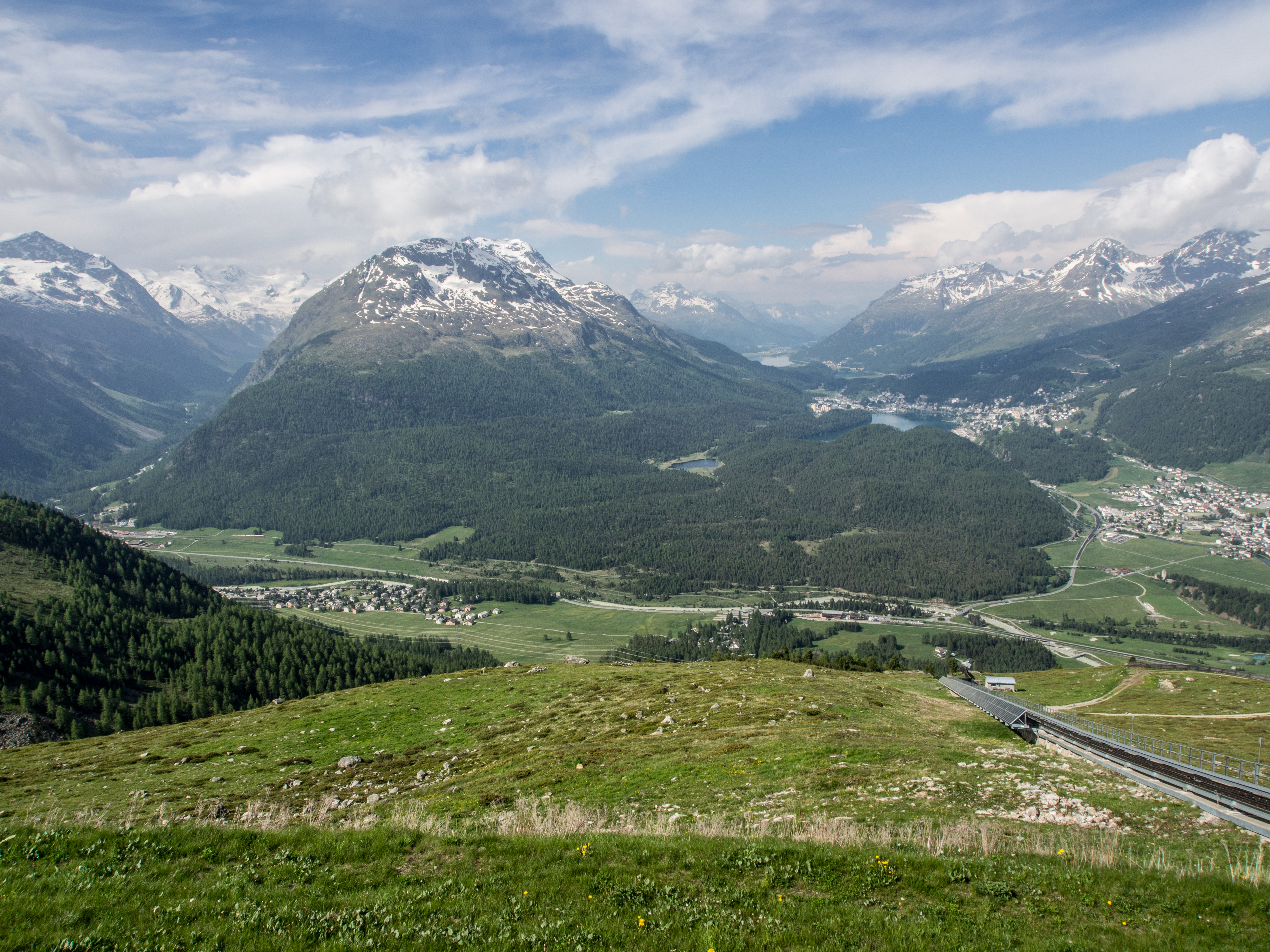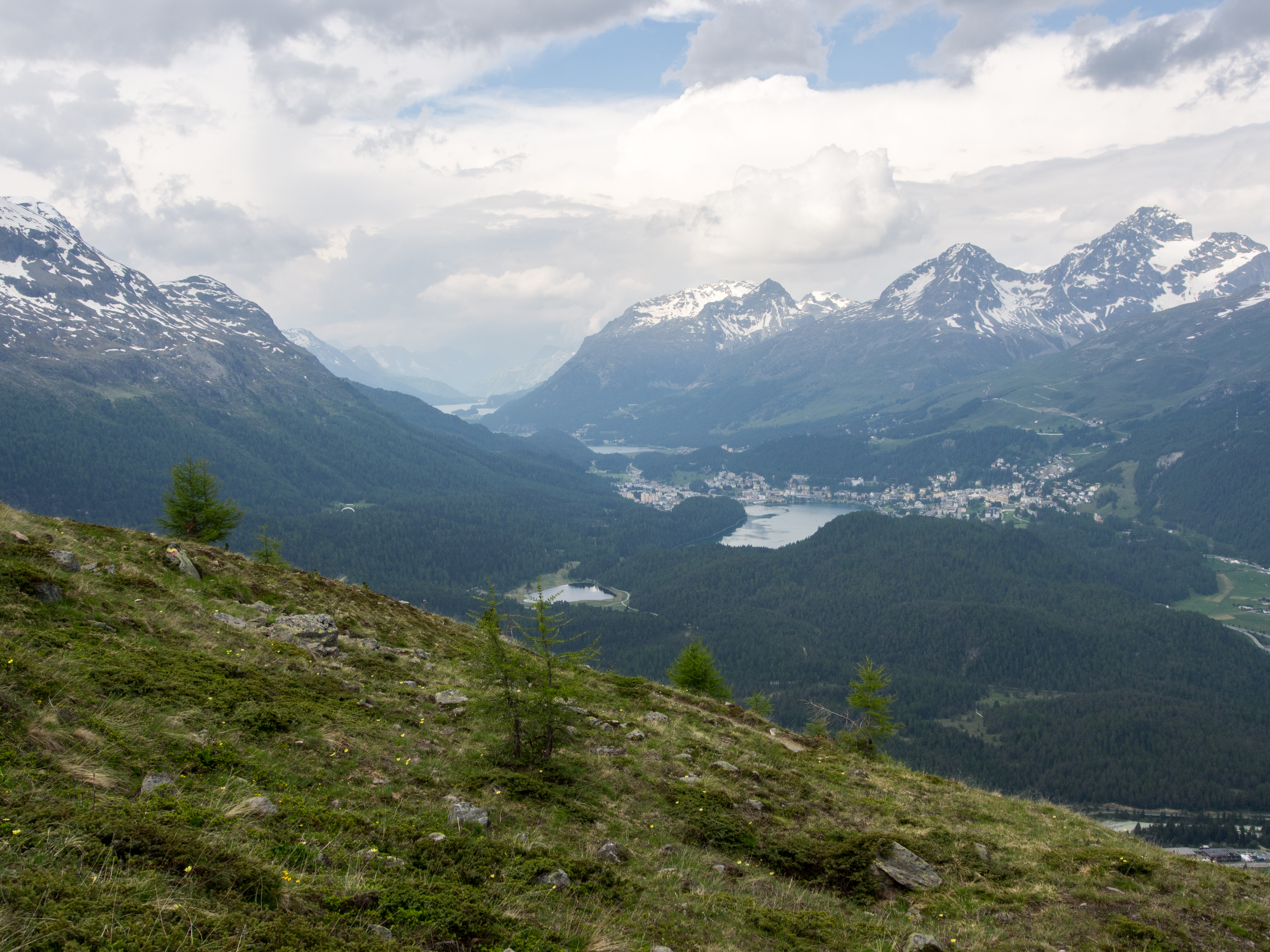 L’Alta Via est une randonnée panoramique, en terrain relativement plat, sur les hauteurs de l’Engadine. Pour arriver au point de départ, il suffit de prendre le funiculaire à la station Punt Muragi et c’est parti pour l’ascension ! Les moins sportifs pourront s’arrêter là et profiter du restaurant et de la plateforme d’observation de Muottas Muragi mais pour notre petit groupe, la montagne et le panorama sur le massif de la Bernina nous appellent ! Avec un temps plus tourmenté et des montagnes un peu plus hautes, le paysage est plus sévère : moins d’herbes et de fleurs, plus de rochers, pas d’arbres. Le paysage est minéral et la vue, plongeante sur la vallée et pas moins de 4 lacs. Notez que si vous séjournez dans un hôtel participant au programme « mountain railways inclusive« , différents funiculaires (dont celui-ci) et lifts sont gratuits.