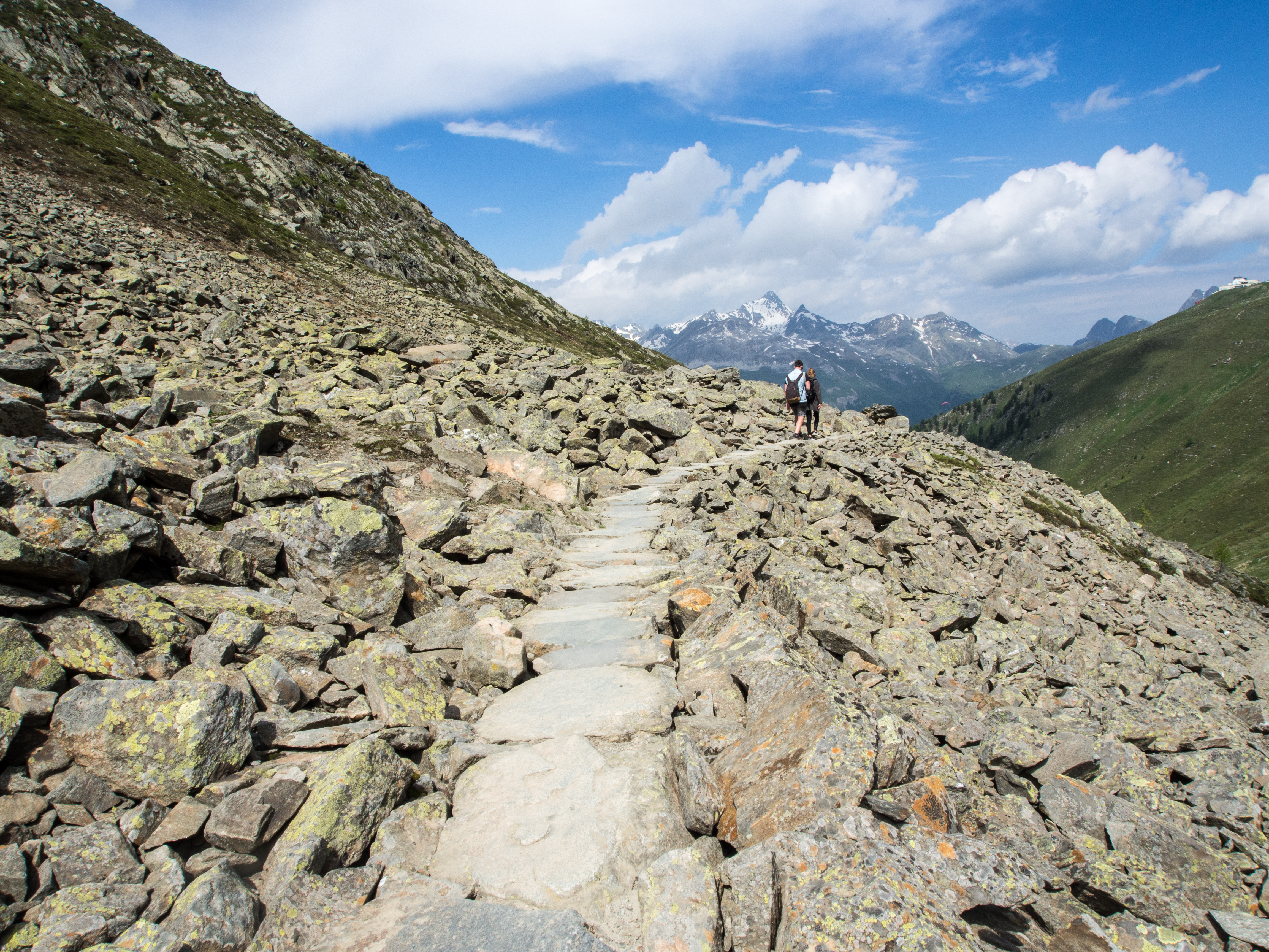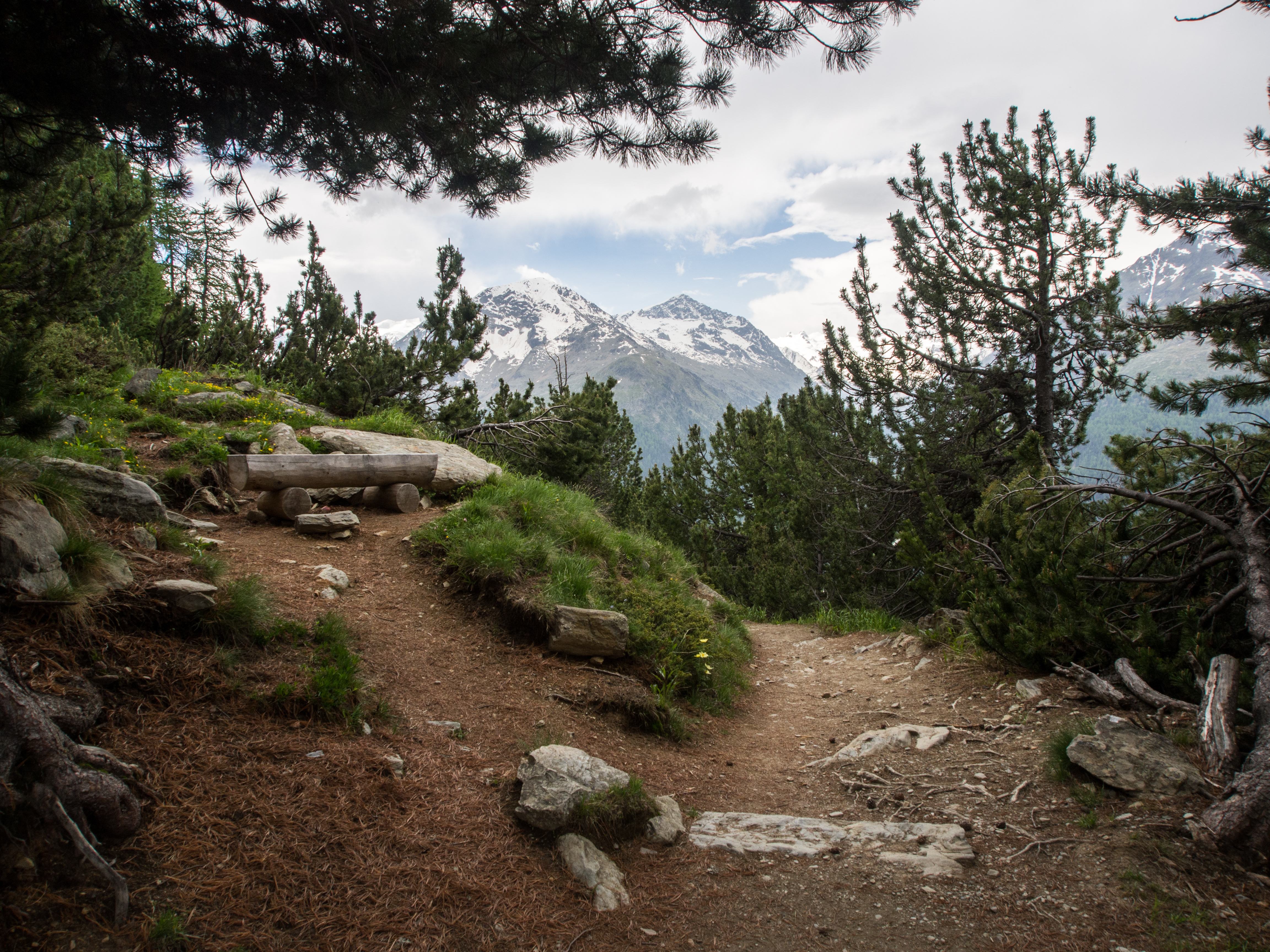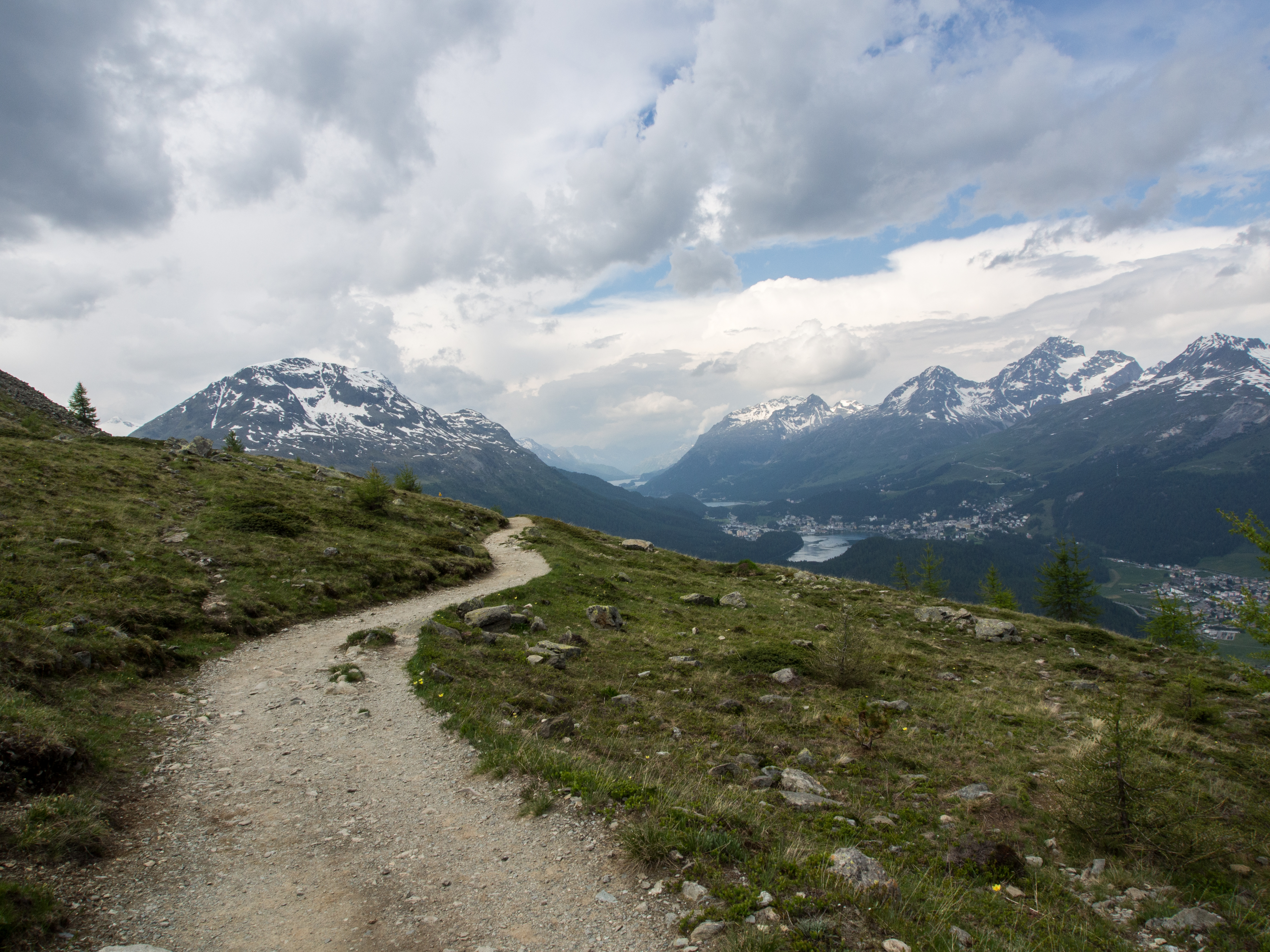 L’Alta Via est une randonnée panoramique, en terrain relativement plat, sur les hauteurs de l’Engadine. Pour arriver au point de départ, il suffit de prendre le funiculaire à la station Punt Muragi et c’est parti pour l’ascension ! Les moins sportifs pourront s’arrêter là et profiter du restaurant et de la plateforme d’observation de Muottas Muragi mais pour notre petit groupe, la montagne et le panorama sur le massif de la Bernina nous appellent ! Avec un temps plus tourmenté et des montagnes un peu plus hautes, le paysage est plus sévère : moins d’herbes et de fleurs, plus de rochers, pas d’arbres. Le paysage est minéral et la vue, plongeante sur la vallée et pas moins de 4 lacs. Notez que si vous séjournez dans un hôtel participant au programme « mountain railways inclusive« , différents funiculaires (dont celui-ci) et lifts sont gratuits.