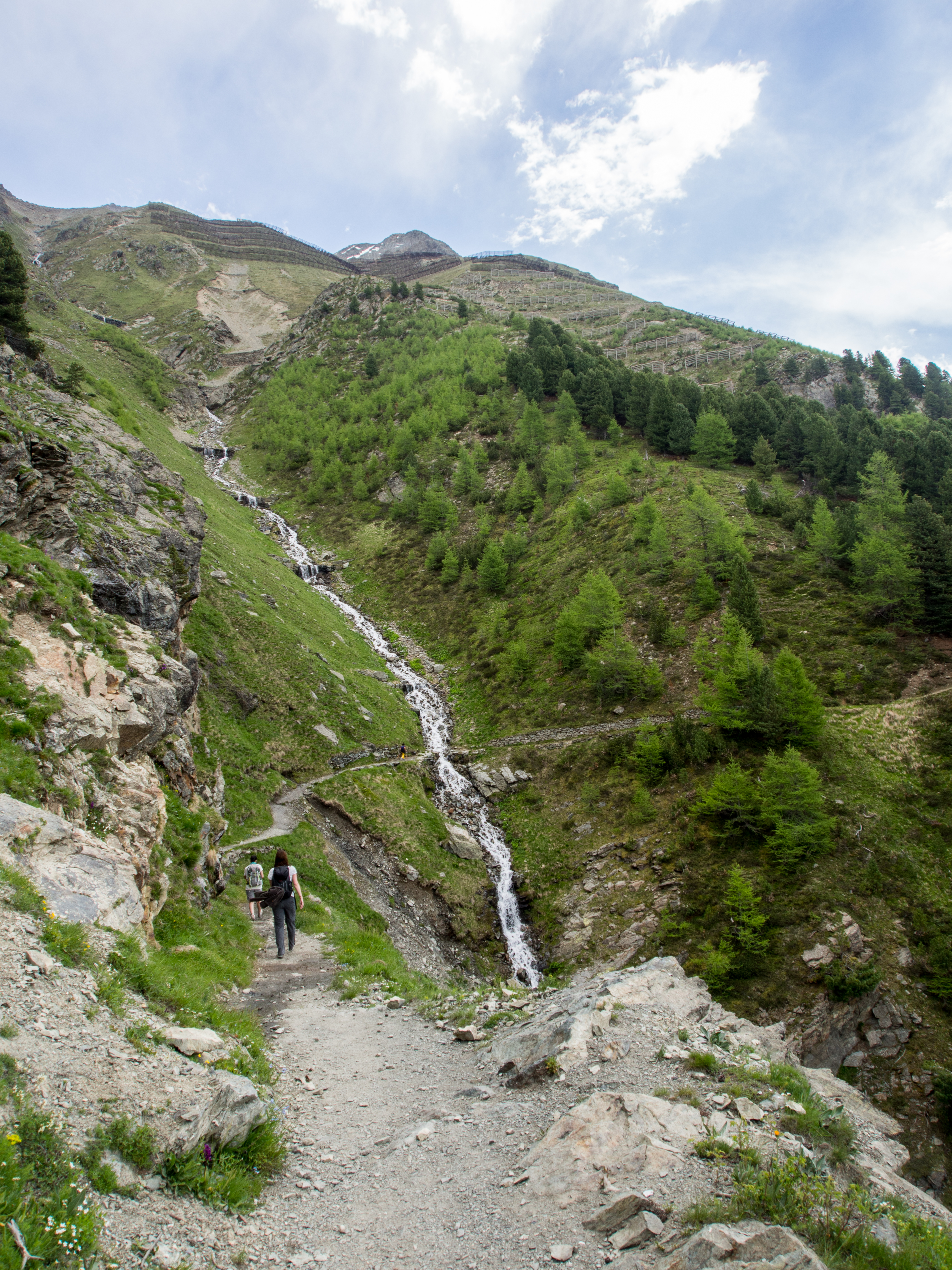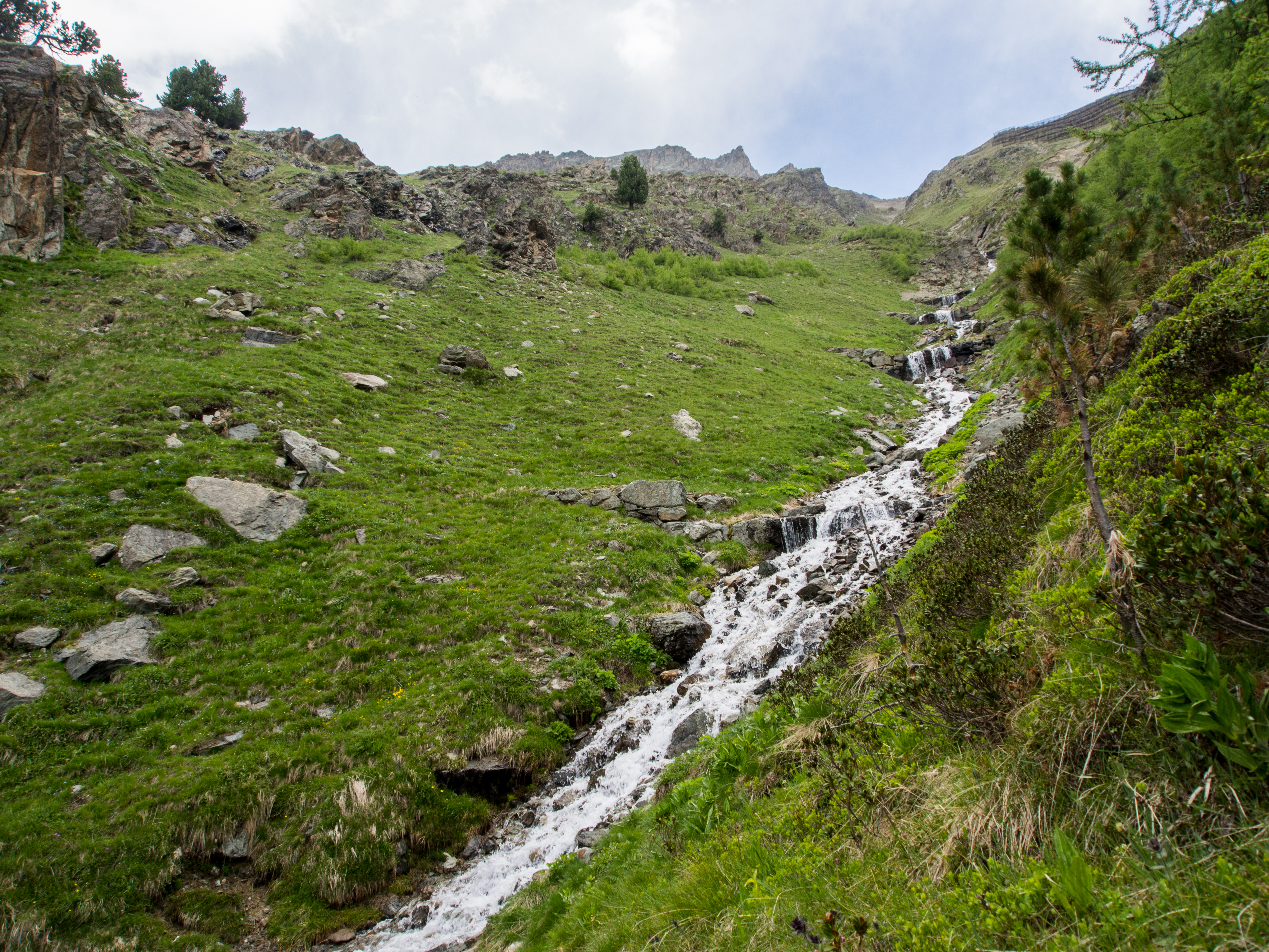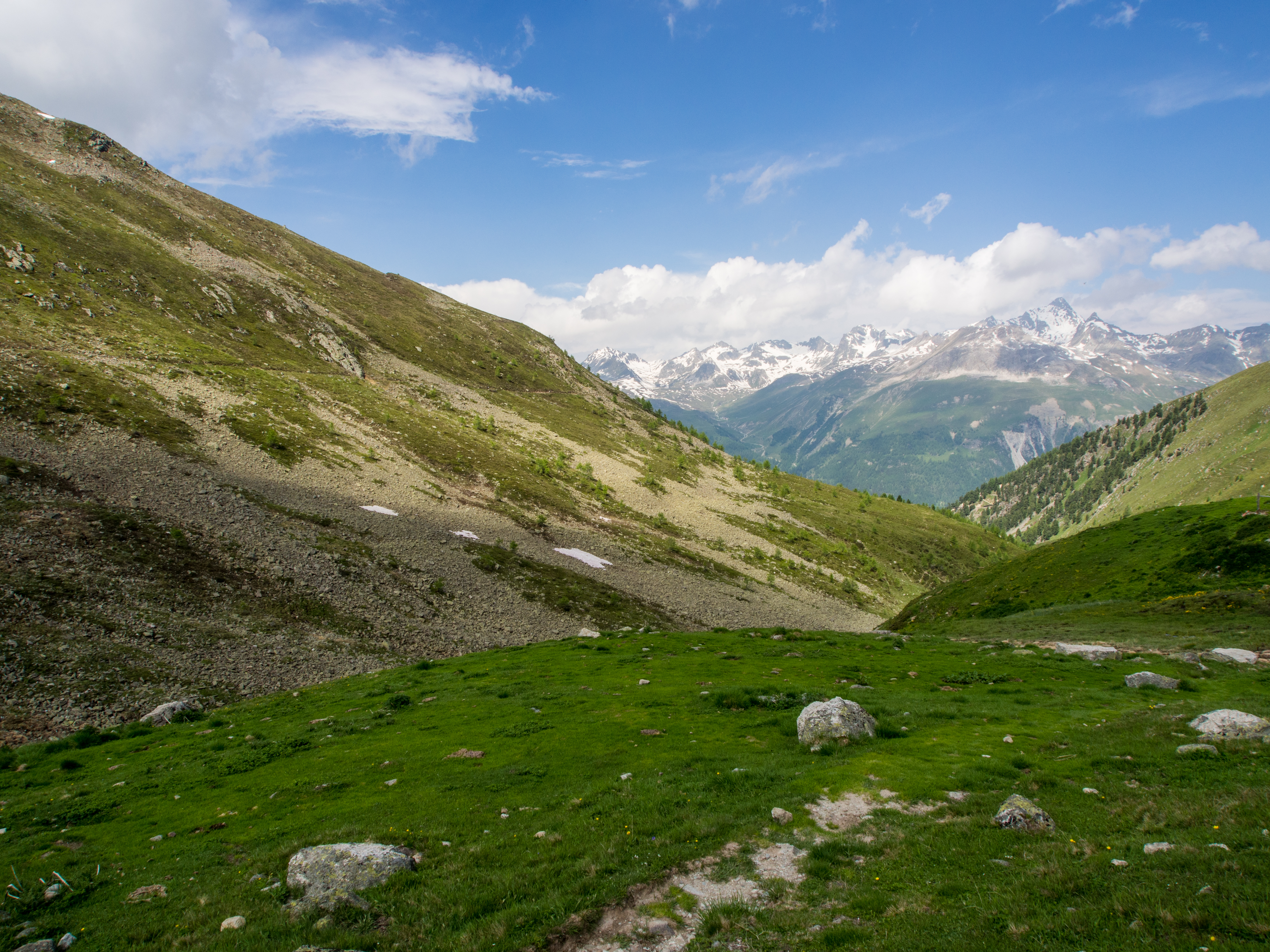 Si la randonnée est à portée de tous, certains passages sont quelques fois proches du vide et les personnes plus sujettes au vertige risquent un ou deux passages difficiles mais sinon, le plaisir de se promener librement dans une montagne brute de décoffrage est là. Le sentier panoramique est un peu en fer à cheval avant de contourner la montagne et de passer de l’autre côté. A ce moment-là, on n’aperçoit plus que les sommets couverts de neige. C’est grandiose et sévère à la fois. Dans le dernier tiers de la randonnée, on descend tout doucement, on retrouve les sapins (bienvenus pour moi qui avais une folle envie de faire pipi, prenez des mesures préventives avant la rando) et enfin, après quelques heures de marche, après une côte qui vient vous couper le souffle à la dernière minute, nous voilà au restaurant Alp Languard, un restaurant d’altitude pile au moment où la météo se fait menaçante.