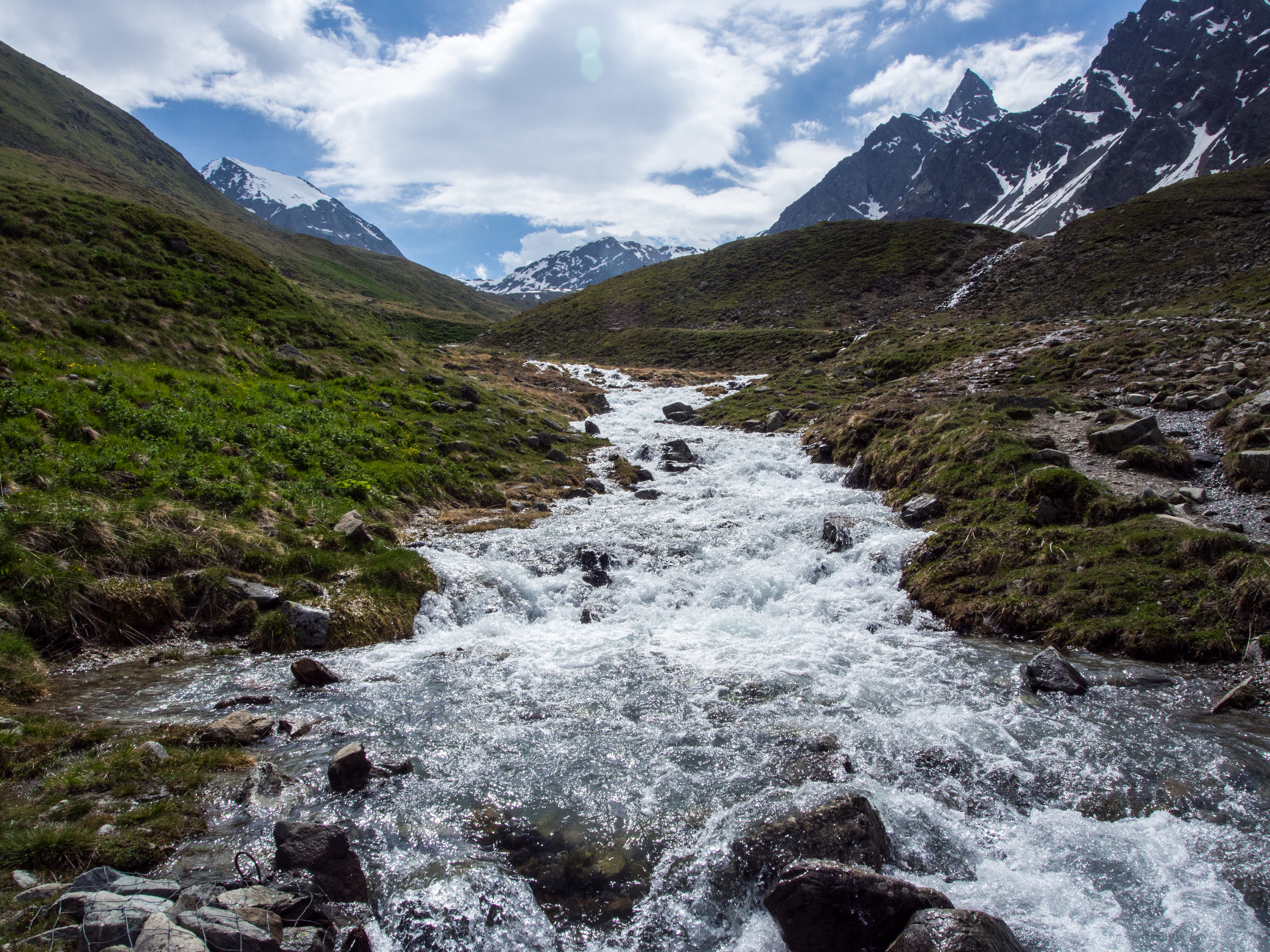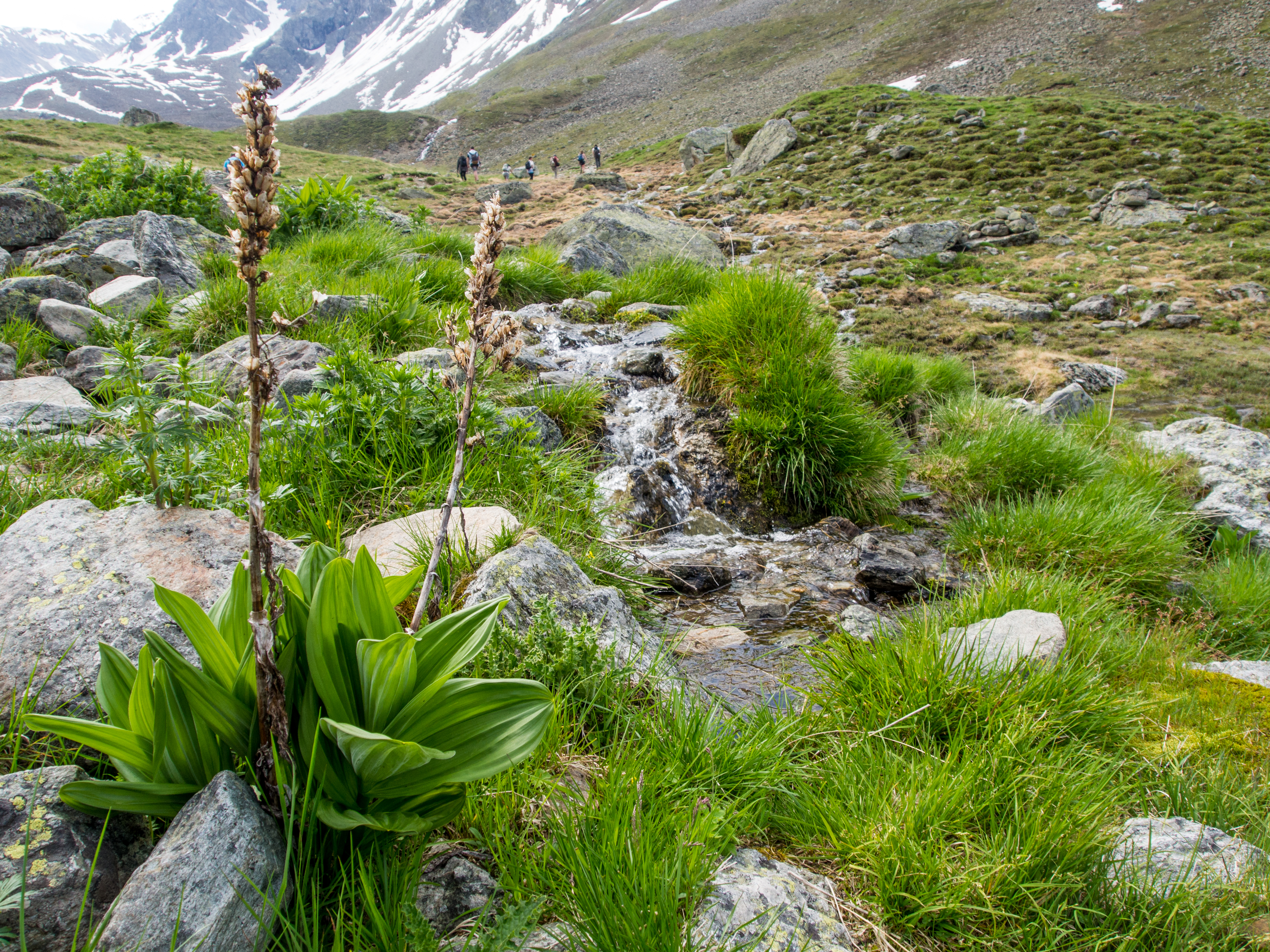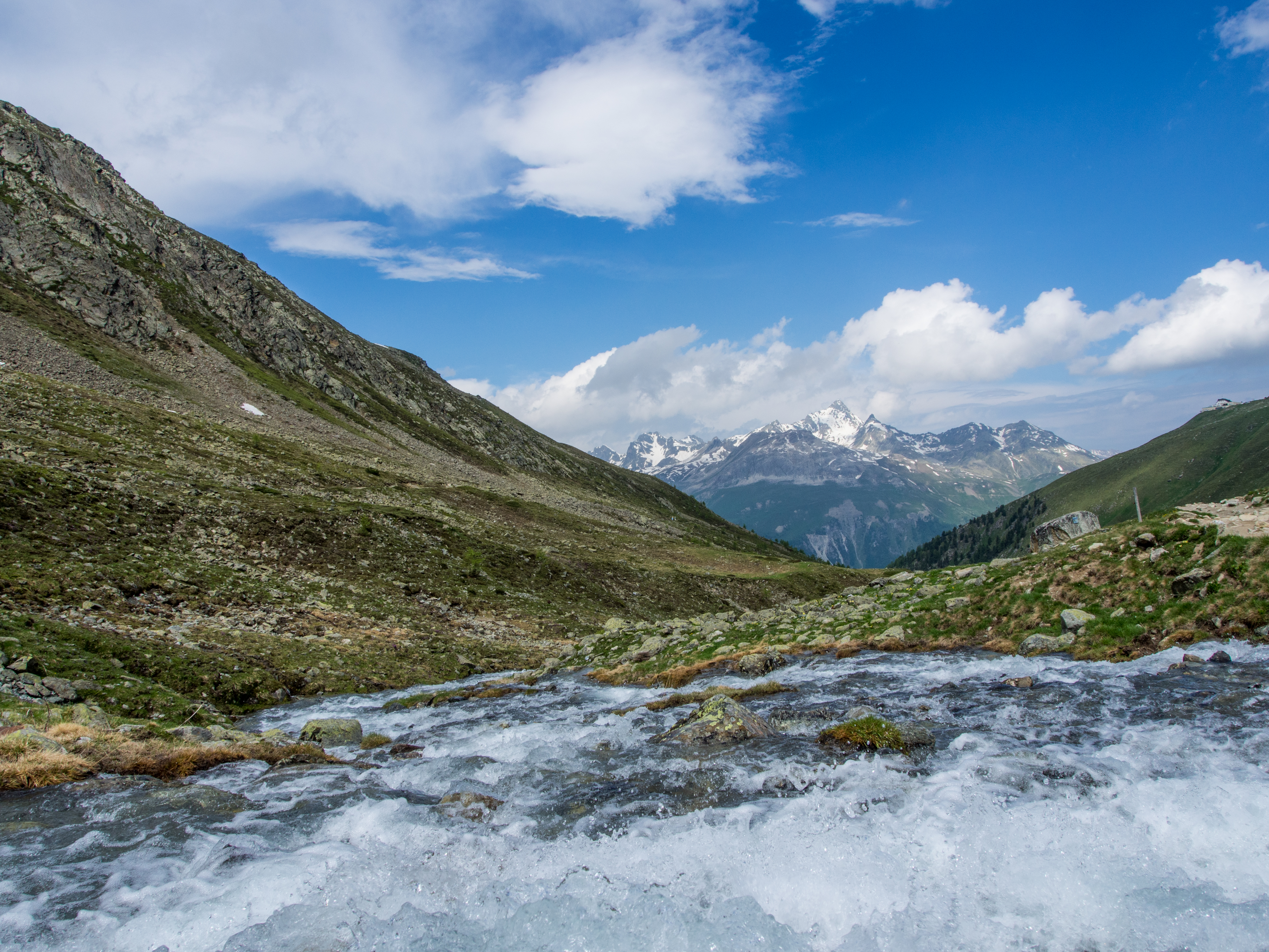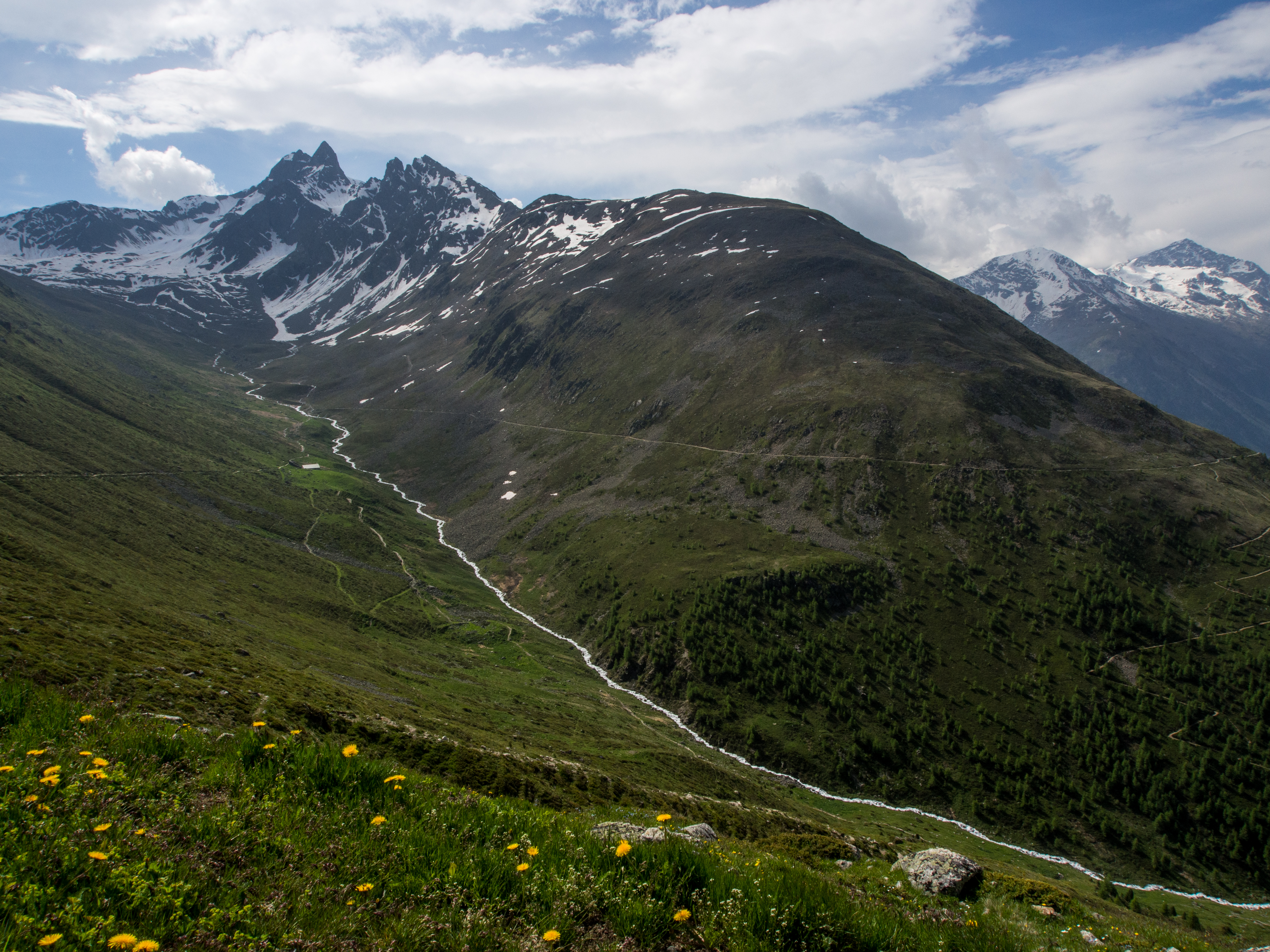 Si la randonnée est à portée de tous, certains passages sont quelques fois proches du vide et les personnes plus sujettes au vertige risquent un ou deux passages difficiles mais sinon, le plaisir de se promener librement dans une montagne brute de décoffrage est là. Le sentier panoramique est un peu en fer à cheval avant de contourner la montagne et de passer de l’autre côté. A ce moment-là, on n’aperçoit plus que les sommets couverts de neige. C’est grandiose et sévère à la fois. Dans le dernier tiers de la randonnée, on descend tout doucement, on retrouve les sapins (bienvenus pour moi qui avais une folle envie de faire pipi, prenez des mesures préventives avant la rando) et enfin, après quelques heures de marche, après une côte qui vient vous couper le souffle à la dernière minute, nous voilà au restaurant Alp Languard, un restaurant d’altitude pile au moment où la météo se fait menaçante.