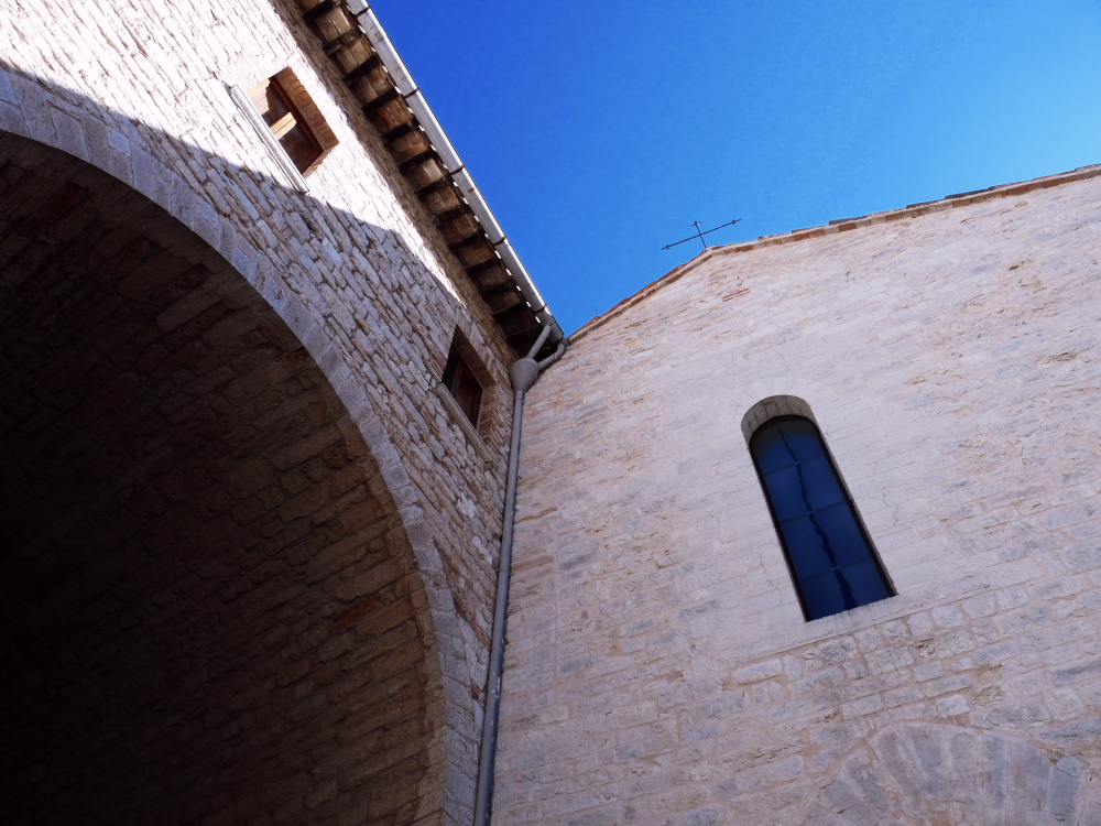 Un petit soleil frais brille sur le Monastère de Fonte Avellana…. La route prise depuis Fabriano pour y arriver en valait seule le déplacement. Au fur et à mesure que nous montons dans la montagne, des plaques de neige rappellent que l’hiver n’est pas encore terminé. Niché dans la montagne, ce qui n’était qu’un ermitage suivant les règles de Saint-Romuald est devenu un monastère malgré tout assez isolé. A le voir de loin, on dirait une forteresse. Des hauts murs encerclent tout le monastère et semblent protéger les moines des tentations du monde extérieur. Une lourde porte en bois finit de de couper ce petit monde.