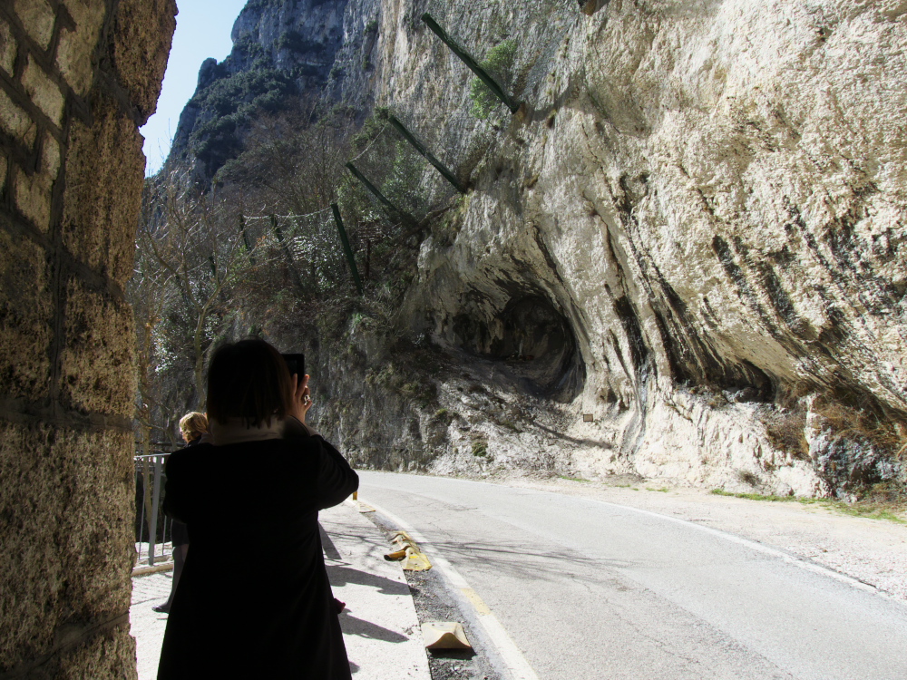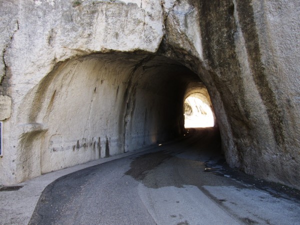 Nous nous arrêtons à côté d’un tunnel à flanc de montagne. Ce tunnel, ce sont les Romains qui l’ont creusé en 76 lors de l’amélioration de la Via Flaminia, une route vieille de plus de 2000 ans reliant Rome à Rimini. Vespasien était alors empereur et une plaque d’origine en célèbre le fait. Et voilà qu’on le contemple, et que notre mini-van passe tranquillement à travers… combien de légionnaires et centurions ont fait de même tant que la puissante Rome régnait sur cette partie du monde ?