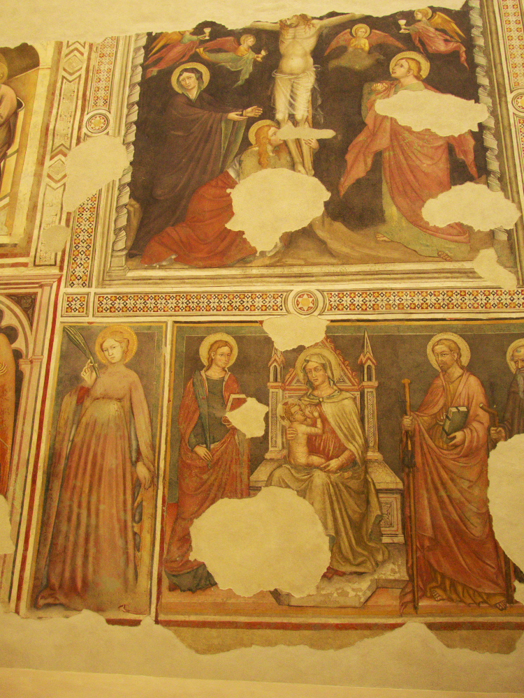 Des églises justement, nous en verrons des tas : la cathédrale basilique, l’église Saint-François, l’église Saint-Dominique où le père de Raphaël, Giovanni Santi, a peint un ange dont on soupçonne qu’il porte les traits de son fils… Les intérieurs des églises sont bien entendu très beaux, comme partout en Italie mais la région est souvent victime d’un fléau majeur : les tremblements de terre. Fabriano, Caglí et les villes des alentours ont toutes été touchées, et même ravagées plusieurs fois dans leur histoire et souvent à quelques années d’intervalles. Les fresques défigurées des églises en témoignent. Malgré tout, Caglí donne une impression d’immuabilité, celle de ne pas avoir changé depuis la Renaissance.