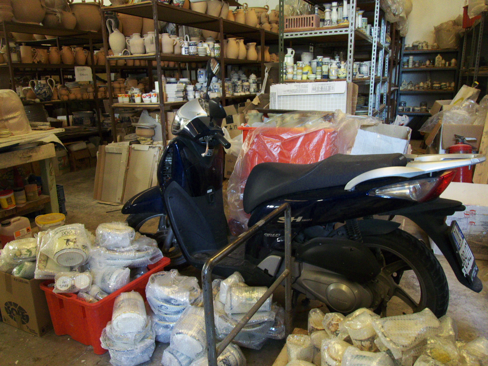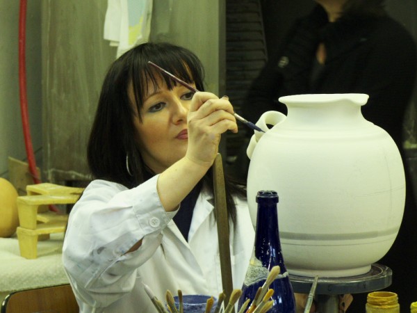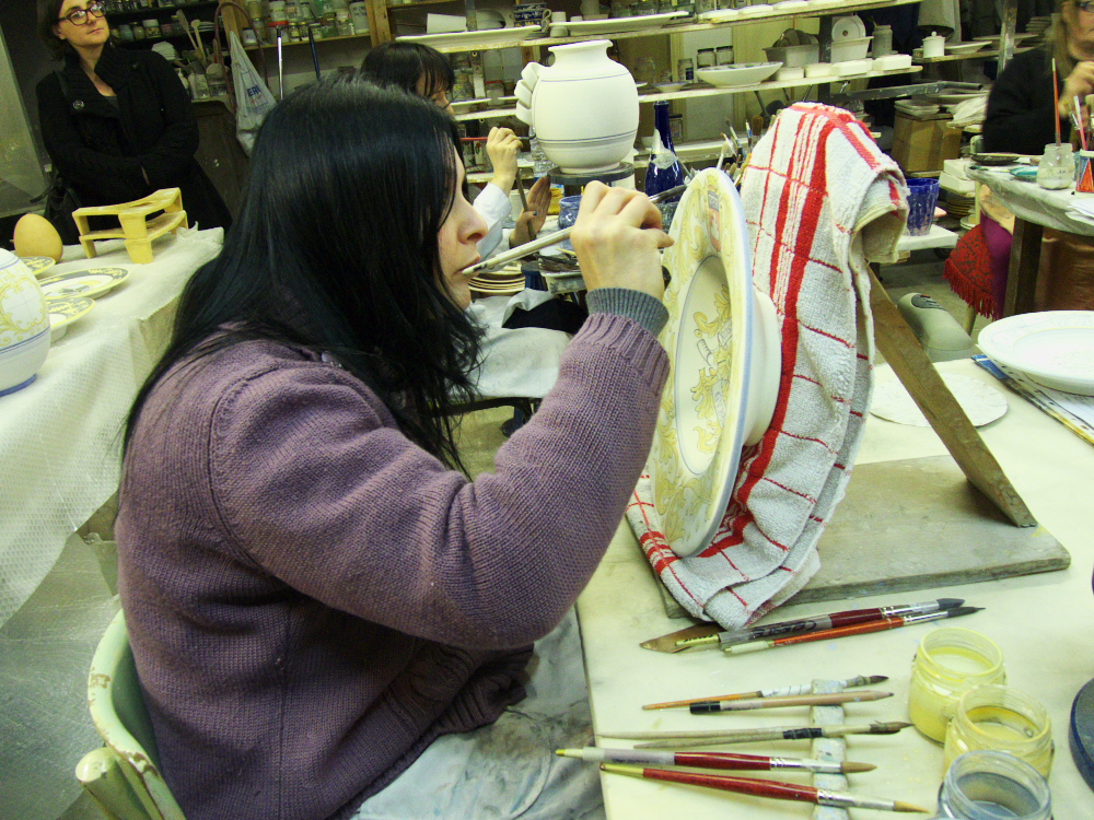 Un objet bien c’est par exemple la céramique et plus précisément la majolique dont Gubbio est une digne représentante (elle fait partie du réseau national des villes de la céramique) et c’est justement dans l’atelier de céramique Rampini que nous faisons connaissance avec Gubbio… et le maître des lieux, Giampietro. Tout ici respire la tradition, des motifs (surtout Renaissance) aux objets proposés (vaisselle, vase). Giampietro nous fait visiter ses ateliers où des dans aux mains expertes traces les motifs avant la « vitrification », cette cuisson qui donne le côté lustré aux céramiques. La technique, minutieuse, m’impressionne, le côté noble de la terre transformée me touche… le produit beaucoup moins. Cela manque franchement de modernité, de frais…
