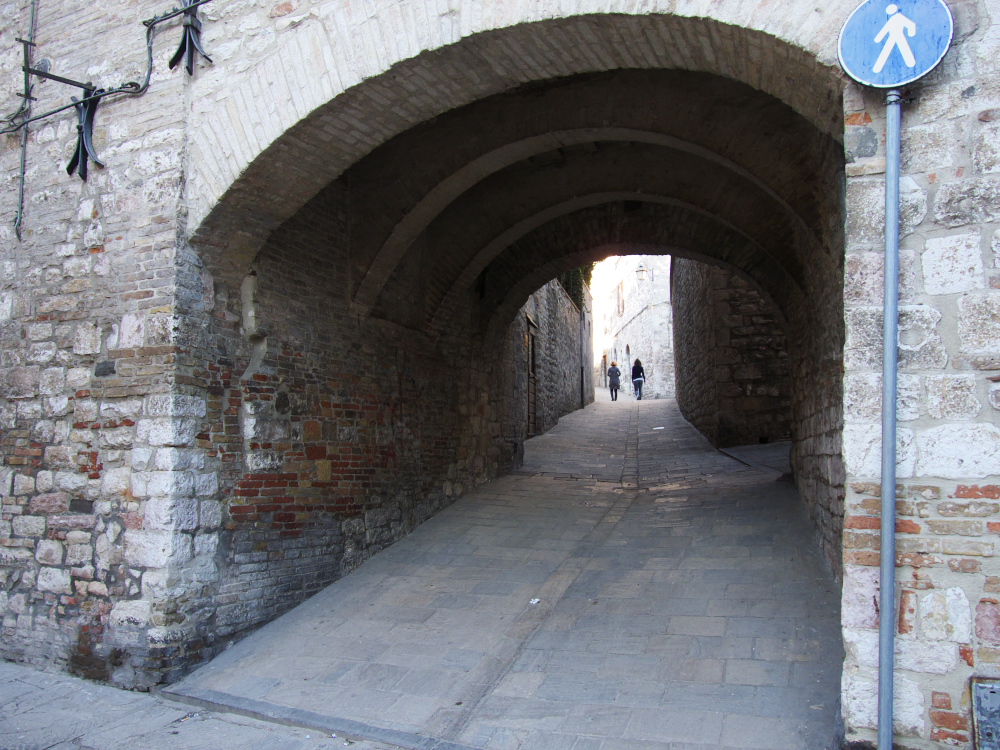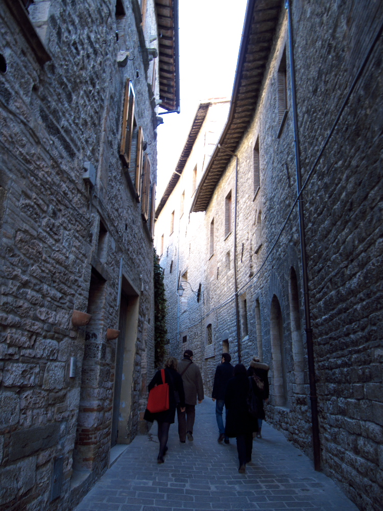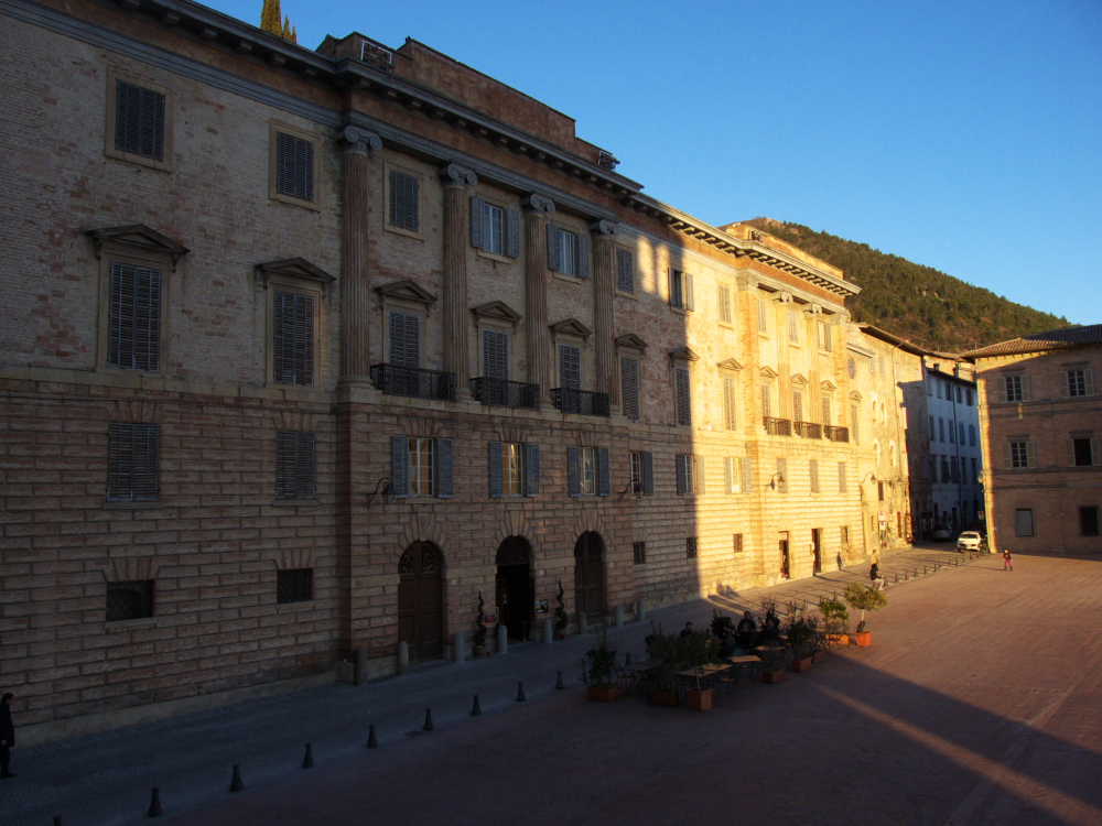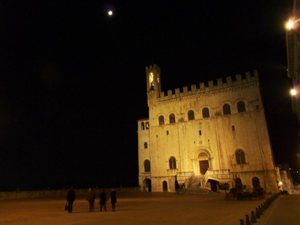 Quand on approche de Gubbio, dans la lumière de la fin de l’après-midi, on se rend compte que l’on arrive dans un endroit spécial. La ville semble avoir été littéralement creusée dans un flanc du Mont Ingino! Une ville d’un autre âge, comme tirée d’un conte de fées. La tour crénelée du Palazzo dei Consoli doit y être pour quelque chose dans son allure médiévale. La plupart des bâtiments datent du XIV et XVe siècle et descendent en cascade jusqu’en bas de la colline et au théâtre romain, témoin d’un passé encore plus lointain. Si elle était faite femme Gubbio serait une belle dame la cinquantaine, stylée, racée, élégante, sûre encore de son pouvoir de séduction aimant la tradition, les plats raffinés et les objets bien faits.
