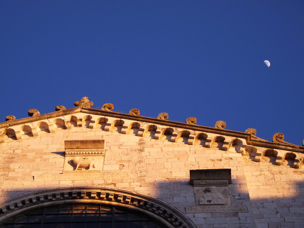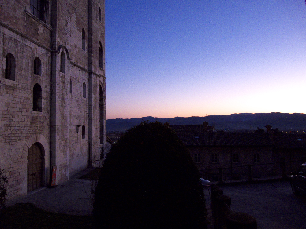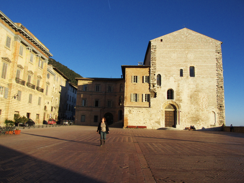 En sortant du musée, nous nous rendons vers la place qui borde le Palazzo dei Consoli, pour admirer le soleil se couchant sur la cascade de rues médiévales… L’intérieur du Palais est plutôt austère mais c’est là que l’on y trouve un morceau fascinant, en tout cas pour moi, d’archéologie et de sciences : les tables eugibines.: 7 tablettes de bronze qui décrivent en latin et en ombrien (la langue des habitants qui précédaient l’invasion romaine) les rites religieux des populations de la région. Nous seulement elles ont aidé à connaître les mœurs d’un peuple mal connu, mais elles ont aidé les linguistes à déchiffrer leur langue ! Pour moi qui avais caressé l’idée d’une carrière à l’Indiana Jones, je suis littéralement fascinée.