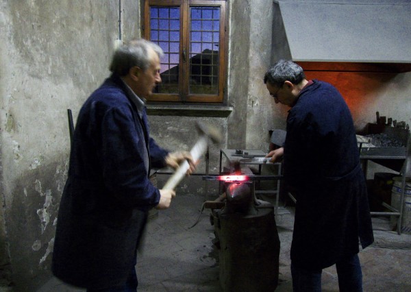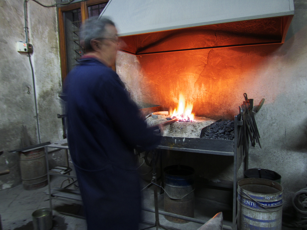 Ce ne sera pas le seul artisan que nous rencontrerons sur notre route! Nous entrerons dans un atelier de fer forgé… Un endroit sobre dans une vieille maison en ville où trônent la Madone, des petits Saints, des vieilles photos, une Vespa et plein d’outils. Presque un cliché de vieux film italien. ET c’est encore un matériau noble travaillé par le feu et les ans des hommes. Et voir ces gaillards de cinquante-soixante ans manier de lourds marteaux par amour du métier, c’est impressionnant ! Devant le métal rouge de chaleur, je reste comme hypnotisée…