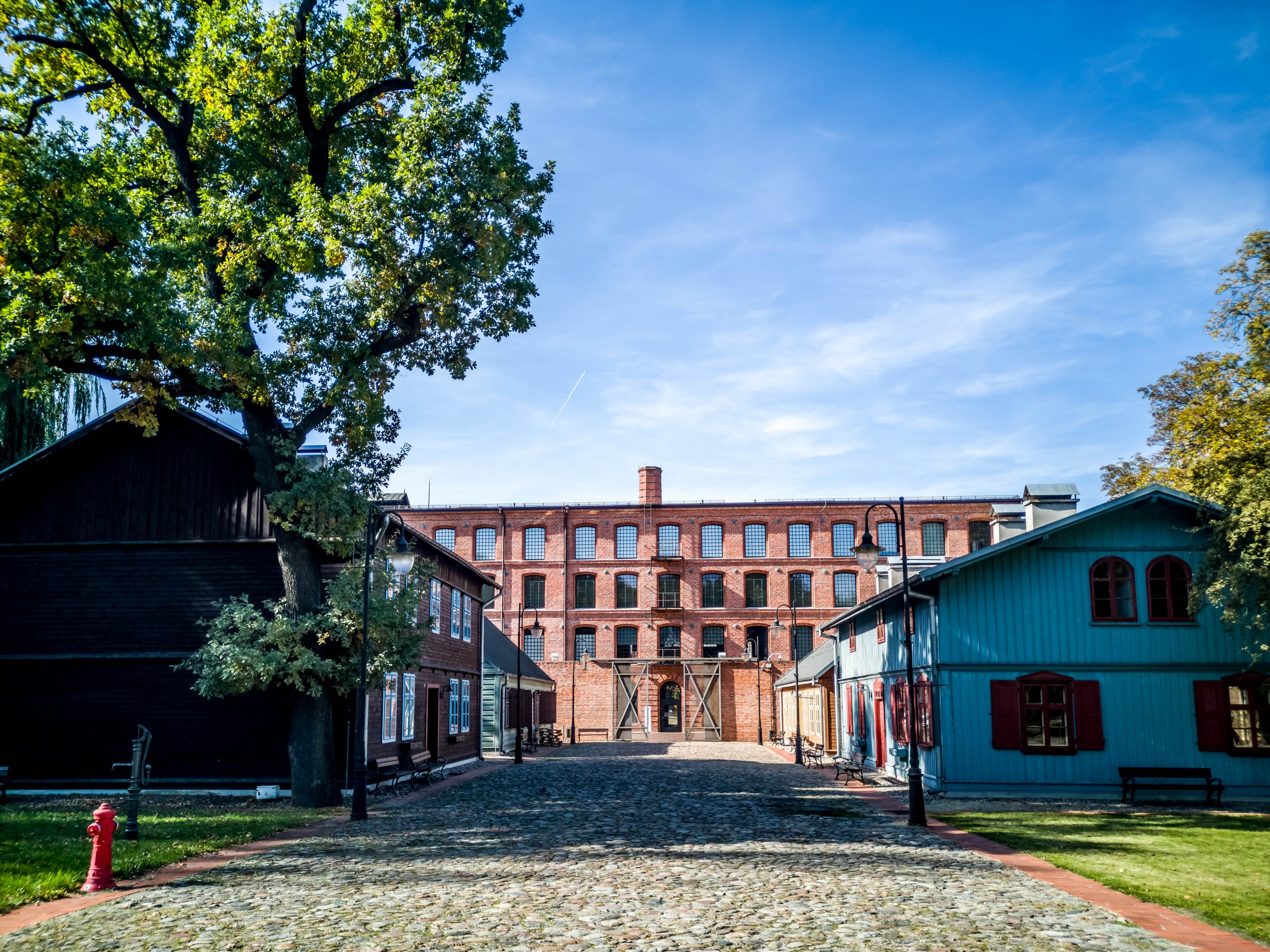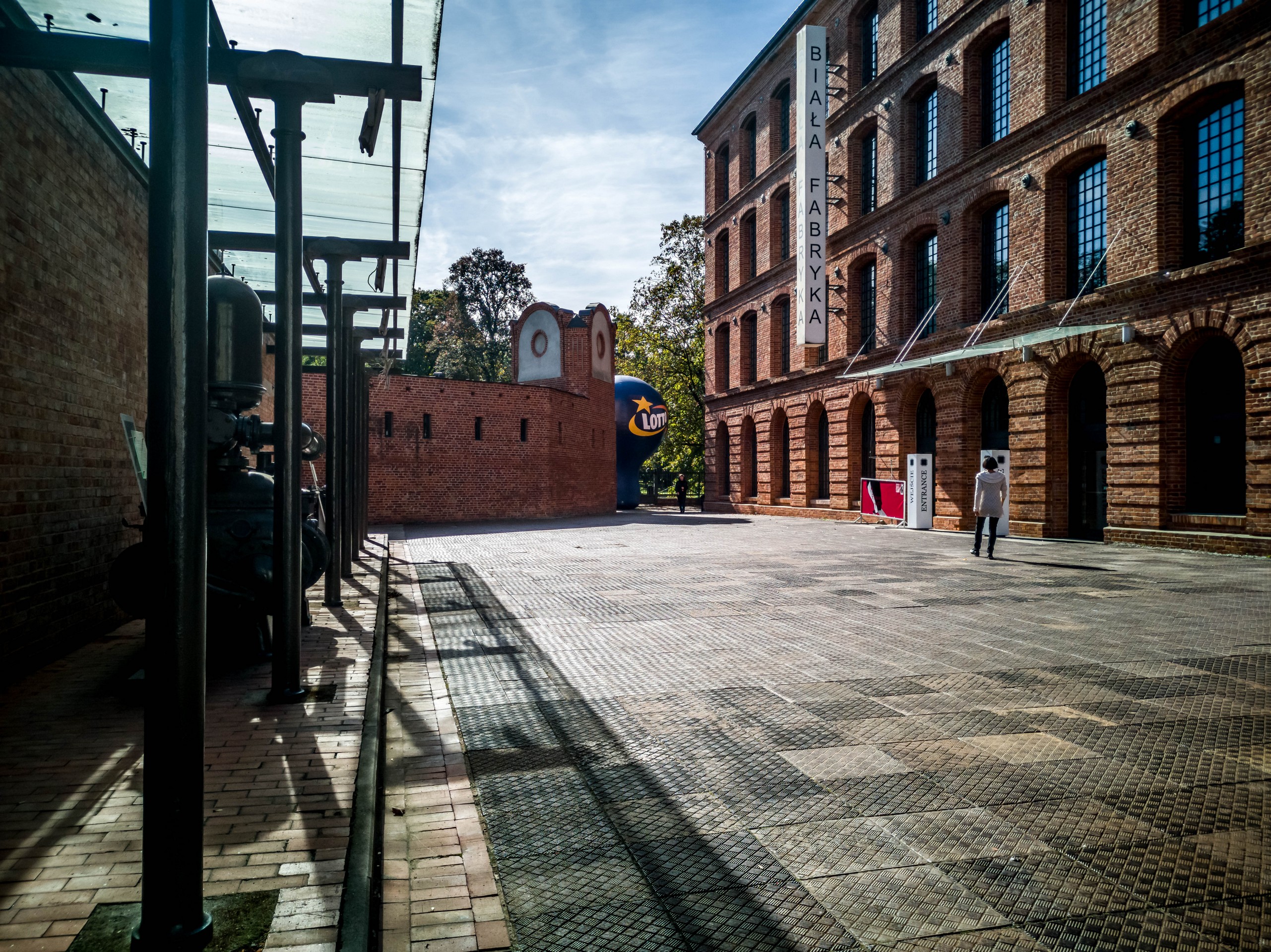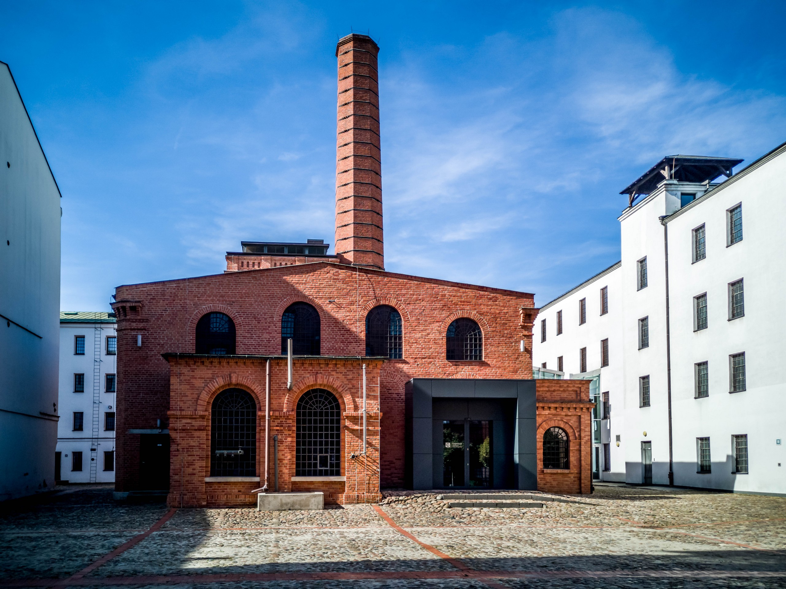 Pas très loin de là, on trouve une usine textile bien différente des autres : l’Usine blanche (Biała Fabryka). Situé tout au bout de Piotrkowska, ce bâtiment industriel de Ludwig Geyer est inhabituel dans le décor ambiant car sa structure principale est… blanche. Ça tranche, comparé à toutes les usines couleur rouge brique que nous avons vues jusqu’ici.